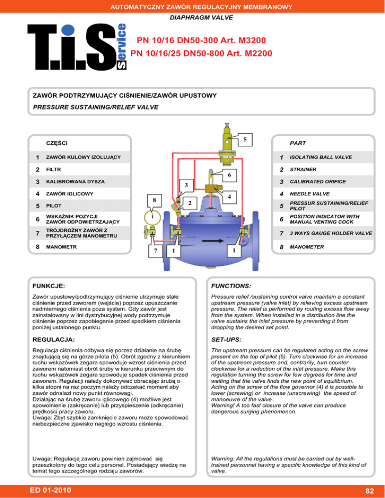 AUTOMATYCZNY ZAWÓR REGULACYJNY MEMBRANOWY DIAPHRAGM VALVE PN 10/16 DN50-300 Art. M3200 PN 10/16/25 DN50-800 Art. M2200 ZAWÓR PODTRZYMUJĄCY CIŚNIENIE/ZAWÓR UPUSTOWY PRESSURE SUSTAINING/RELIEF VALVE 5 CZĘŚCI 1 ZAWÓR KULOWY IZOLUJĄCY 2 FILTR 3 KALIBROWANA DYSZA 4 ZAWÓR IGLICOWY 5 PILOT 6 PART 1 ISOLATING BALL VALVE 2 STRAINER 3 CALIBRATED ORIFICE 4 NEEDLE VALVE 5 PRESSUR SUSTAINING/RELIEF PILOT WSKAŹNIK POZYCJI ZAWÓR ODPOWIETRZAJĄCY 6 POSITION INDICATOR WITH MANUAL VENTING COCK 7 TRÓJDROŻNY ZAWÓR Z PRZYŁĄCZEM MANOMETRU 7 3 WAYS GAUGE HOLDER VALVE 8 MANOMETR 8 MANOMETER 6 3 8 7 2 1 4 1 FUNKCJE: FUNCTIONS: Zawór upustowy/podtrzymujący ciśnienie utrzymuje stałe ciśnienie przed zaworem (wejście) poprzez upuszczanie nadmiernego ciśnienia poza system. Gdy zawór jest zainstalowany w lini dystrybucyjnej wody podtrzymuje ciśnienie poprzez zapobieganie przed spadkiem ciśnienia poniżej ustalonego punktu. Pressure relief /sustaining control valve maintain a constant upstream pressure (valve inlet) by relieving excess upstream pressure. The relief is performed by routing excess flow away from the system. When installed in a distribution line the valve sustains the inlet pressure by preventing it from dropping the desired set point. REGULACJA: SET-UPS: Regulacja ciśnienia odbywa się porzez działanie na śrubę znajdującą się na górze pilota (5). Obrót zgodny z kierunkiem ruchu wskazówek zegara spowoduje wzrost ciśnienia przed zaworem natomiast obrót śruby w kierunku przeciwnym do ruchu wskazówek zegara spowoduje spadek ciśnienia przed zaworem. Regulacji należy dokonywać obracając śrubą o kilka stopni na raz poczym należy odczekać moment aby zawór odnalazł nowy punkt równowagi. Działając na śrubę zaworu iglicowego (4) możliwe jest spowolnienie (zakręcanie) lub przyspieszenie (odkręcanie) prędkości pracy zaworu. Uwaga: Zbyt szybkie zamknięcie zaworu może spowodować niebezpieczne zjawisko nagłego wzrostu ciśnienia. The upstream pressure can be regulated acting on the screw present on the top of pilot (5). Turn clockwise for an increase of the upstream pressure and, contrarily, turn counter clockwise for a reduction of the inlet pressure. Make this regulation turning the screw for few degrees for time and waiting that the valve finds the new point of equilibrium. Acting on the screw of the flow governor (4) it is possible to lower (screwing) or increase (unscrewing) the speed of manoeuvre of the valve. Warning! A too fast closure of the valve can produce dangerous surging phenomenon. Uwaga: Regulacją zaworu powinien zajmować się przeszkolony do tego celu personel. Posiadający wiedzę na temat tego szczególnego rodzaju zaworów. Warning: All the regulations must be carried out by welltrained personnel having a specific knowledge of this kind of valve. ED 01-2010 82