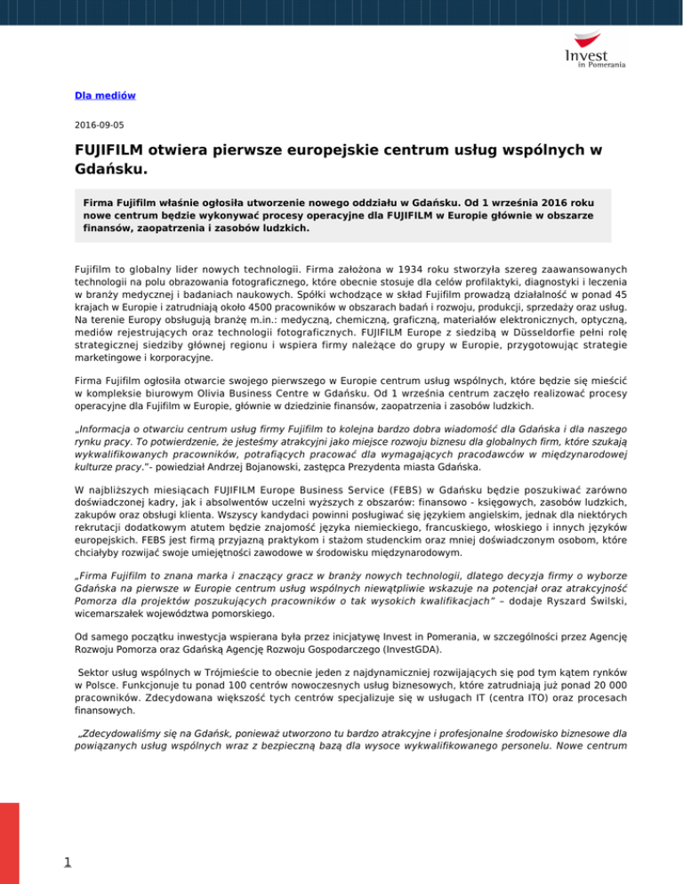 Dla mediów 2016-09-05 FUJIFILM otwiera pierwsze europejskie centrum usług wspólnych w Gdańsku. Firma Fujifilm właśnie ogłosiła utworzenie nowego oddziału w Gdańsku. Od 1 września 2016 roku nowe centrum będzie wykonywać procesy operacyjne dla FUJIFILM w Europie głównie w obszarze finansów, zaopatrzenia i zasobów ludzkich. Fujifilm to globalny lider nowych technologii. Firma założona w 1934 roku stworzyła szereg zaawansowanych technologii na polu obrazowania fotograficznego, które obecnie stosuje dla celów profilaktyki, diagnostyki i leczenia w branży medycznej i badaniach naukowych. Spółki wchodzące w skład Fujifilm prowadzą działalność w ponad 45 krajach w Europie i zatrudniają około 4500 pracowników w obszarach badań i rozwoju, produkcji, sprzedaży oraz usług. Na terenie Europy obsługują branżę m.in.: medyczną, chemiczną, graficzną, materiałów elektronicznych, optyczną, mediów rejestrujących oraz technologii fotograficznych. FUJIFILM Europe z siedzibą w Düsseldorfie pełni rolę strategicznej siedziby głównej regionu i wspiera firmy należące do grupy w Europie, przygotowując strategie marketingowe i korporacyjne. Firma Fujifilm ogłosiła otwarcie swojego pierwszego w Europie centrum usług wspólnych, które będzie się mieścić w kompleksie biurowym Olivia Business Centre w Gdańsku. Od 1 września centrum zaczęło realizować procesy operacyjne dla Fujifilm w Europie, głównie w dziedzinie finansów, zaopatrzenia i zasobów ludzkich. „Informacja o otwarciu centrum usług firmy Fujifilm to kolejna bardzo dobra wiadomość dla Gdańska i dla naszego rynku pracy. To potwierdzenie, że jesteśmy atrakcyjni jako miejsce rozwoju biznesu dla globalnych firm, które szukają wykwalifikowanych pracowników, potrafiących pracować dla wymagających pracodawców w międzynarodowej kulturze pracy.”- powiedział Andrzej Bojanowski, zastępca Prezydenta miasta Gdańska. W najbliższych miesiącach FUJIFILM Europe Business Service (FEBS) w Gdańsku będzie poszukiwać zarówno doświadczonej kadry, jak i absolwentów uczelni wyższych z obszarów: finansowo - księgowych, zasobów ludzkich, zakupów oraz obsługi klienta. Wszyscy kandydaci powinni posługiwać się językiem angielskim, jednak dla niektórych rekrutacji dodatkowym atutem będzie znajomość języka niemieckiego, francuskiego, włoskiego i innych języków europejskich. FEBS jest firmą przyjazną praktykom i stażom studenckim oraz mniej doświadczonym osobom, które chciałyby rozwijać swoje umiejętności zawodowe w środowisku międzynarodowym. „Firma Fujifilm to znana marka i znaczący gracz w branży nowych technologii, dlatego decyzja firmy o wyborze Gdańska na pierwsze w Europie centrum usług wspólnych niewątpliwie wskazuje na potencjał oraz atrakcyjność Pomorza dla projektów poszukujących pracowników o tak wysokich kwalifikacjach” – dodaje Ryszard Świlski, wicemarszałek województwa pomorskiego. Od samego początku inwestycja wspierana była przez inicjatywę Invest in Pomerania, w szczególności przez Agencję Rozwoju Pomorza oraz Gdańską Agencję Rozwoju Gospodarczego (InvestGDA). Sektor usług wspólnych w Trójmieście to obecnie jeden z najdynamiczniej rozwijających się pod tym kątem rynków w Polsce. Funkcjonuje tu ponad 100 centrów nowoczesnych usług biznesowych, które zatrudniają już ponad 20 000 pracowników. Zdecydowana większość tych centrów specjalizuje się w usługach IT (centra ITO) oraz procesach finansowych. „Zdecydowaliśmy się na Gdańsk, ponieważ utworzono tu bardzo atrakcyjne i profesjonalne środowisko biznesowe dla powiązanych usług wspólnych wraz z bezpieczną bazą dla wysoce wykwalifikowanego personelu. Nowe centrum 1 operacyjne wzmocni nasze ogólne wyniki w Europie i będzie wspierać nasz dalszy rozwój”. – powiedział Go Miyazaki, Dyrektor Zarządzający FUJIFILM Europe. Invest in Pomerania jest regionalną inicjatywą, która w oparciu o zasadę non-profit pomaga inwestorom zagranicznym realizować projekty inwestycyjne na Pomorzu. Inicjatywę tworzą Urząd Marszałkowski Województwa Pomorskiego, miasta: Gdańsk, Gdynia, Słupsk i Sopot, Pomorska Specjalna Strefa Ekonomiczna, Słupska Specjalna Strefa Ekonomiczna, InvestGDA oraz Agencja Rozwoju Pomorza, która koordynuje działania inicjatywy. Invest in Pomerania oferuje szerokie wsparcie podczas procesu inwestycyjnego, a także kompleksową opiekę poinwestycyjną. Całość systemu opiera się na zasadzie One-Stop-Shop. Więcej informacji na www.investinpomerania.pl Kontak dla mediów : Marcin Grzegory Invest in Pomerania Marcin Grzegory Project Manager – sektor BPO/SSC e-mail: [email protected] Tel.: +48 58 32 33 240 2