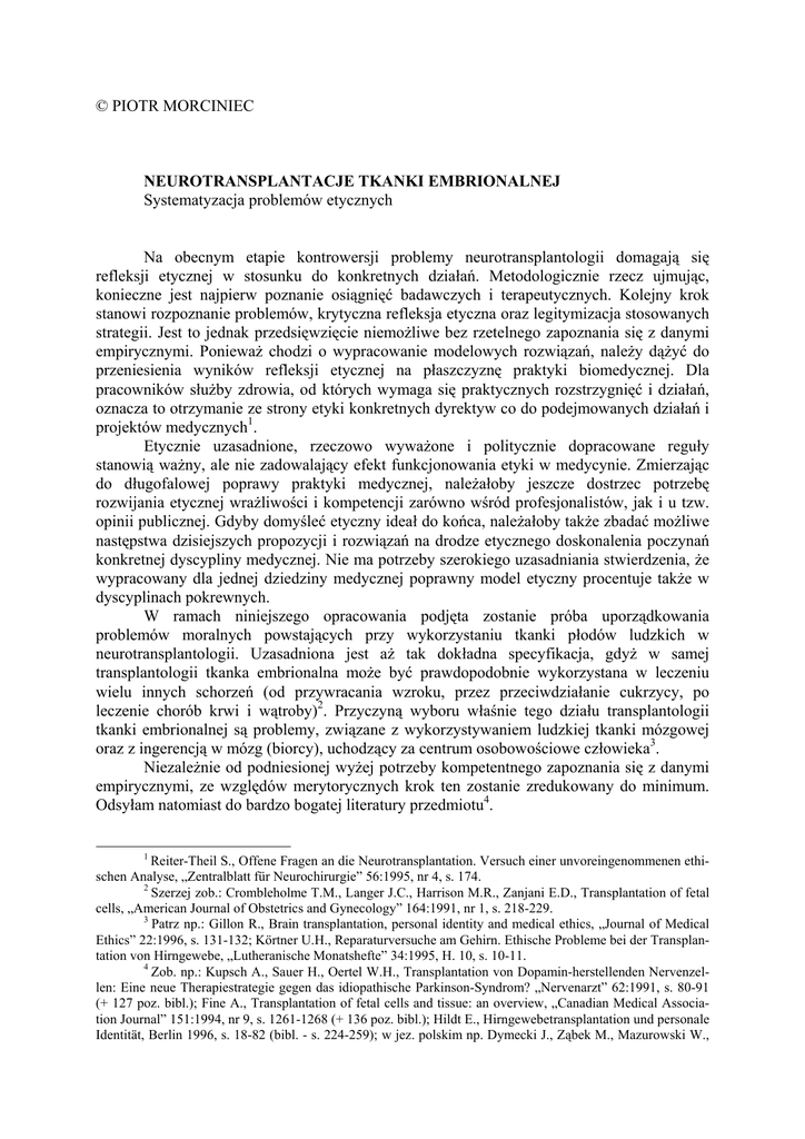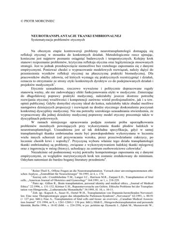 © PIOTR MORCINIEC NEUROTRANSPLANTACJE TKANKI EMBRIONALNEJ Systematyzacja problemów etycznych Na obecnym etapie kontrowersji problemy neurotransplantologii domagają się refleksji etycznej w stosunku do konkretnych działań. Metodologicznie rzecz ujmując, konieczne jest najpierw poznanie osiągnięć badawczych i terapeutycznych. Kolejny krok stanowi rozpoznanie problemów, krytyczna refleksja etyczna oraz legitymizacja stosowanych strategii. Jest to jednak przedsięwzięcie niemożliwe bez rzetelnego zapoznania się z danymi empirycznymi. Ponieważ chodzi o wypracowanie modelowych rozwiązań, należy dążyć do przeniesienia wyników refleksji etycznej na płaszczyznę praktyki biomedycznej. Dla pracowników służby zdrowia, od których wymaga się praktycznych rozstrzygnięć i działań, oznacza to otrzymanie ze strony etyki konkretnych dyrektyw co do podejmowanych działań i projektów medycznych1. Etycznie uzasadnione, rzeczowo wyważone i politycznie dopracowane reguły stanowią ważny, ale nie zadowalający efekt funkcjonowania etyki w medycynie. Zmierzając do długofalowej poprawy praktyki medycznej, należałoby jeszcze dostrzec potrzebę rozwijania etycznej wrażliwości i kompetencji zarówno wśród profesjonalistów, jak i u tzw. opinii publicznej. Gdyby domyśleć etyczny ideał do końca, należałoby także zbadać możliwe następstwa dzisiejszych propozycji i rozwiązań na drodze etycznego doskonalenia poczynań konkretnej dyscypliny medycznej. Nie ma potrzeby szerokiego uzasadniania stwierdzenia, że wypracowany dla jednej dziedziny medycznej poprawny model etyczny procentuje także w dyscyplinach pokrewnych. W ramach niniejszego opracowania podjęta zostanie próba uporządkowania problemów moralnych powstających przy wykorzystaniu tkanki płodów ludzkich w neurotransplantologii. Uzasadniona jest aż tak dokładna specyfikacja, gdyż w samej transplantologii tkanka embrionalna może być prawdopodobnie wykorzystana w leczeniu wielu innych schorzeń (od przywracania wzroku, przez przeciwdziałanie cukrzycy, po leczenie chorób krwi i wątroby)2. Przyczyną wyboru właśnie tego działu transplantologii tkanki embrionalnej są problemy, związane z wykorzystywaniem ludzkiej tkanki mózgowej oraz z ingerencją w mózg (biorcy), uchodzący za centrum osobowościowe człowieka3. Niezależnie od podniesionej wyżej potrzeby kompetentnego zapoznania się z danymi empirycznymi, ze względów merytorycznych krok ten zostanie zredukowany do minimum. Odsyłam natomiast do bardzo bogatej literatury przedmiotu4. 1 Reiter-Theil S., Offene Fragen an die Neurotransplantation. Versuch einer unvoreingenommenen ethischen Analyse, „Zentralblatt für Neurochirurgie” 56:1995, nr 4, s. 174. 2 Szerzej zob.: Crombleholme T.M., Langer J.C., Harrison M.R., Zanjani E.D., Transplantation of fetal cells, „American Journal of Obstetrics and Gynecology” 164:1991, nr 1, s. 218-229. 3 Patrz np.: Gillon R., Brain transplantation, personal identity and medical ethics, „Journal of Medical Ethics” 22:1996, s. 131-132; Körtner U.H., Reparaturversuche am Gehirn. Ethische Probleme bei der Transplantation von Hirngewebe, „Lutheranische Monatshefte” 34:1995, H. 10, s. 10-11. 4 Zob. np.: Kupsch A., Sauer H., Oertel W.H., Transplantation von Dopamin-herstellenden Nervenzellen: Eine neue Therapiestrategie gegen das idiopathische Parkinson-Syndrom? „Nervenarzt” 62:1991, s. 80-91 (+ 127 poz. bibl.); Fine A., Transplantation of fetal cells and tissue: an overview, „Canadian Medical Association Journal” 151:1994, nr 9, s. 1261-1268 (+ 136 poz. bibl.); Hildt E., Hirngewebetransplantation und personale Identität, Berlin 1996, s. 18-82 (bibl. - s. 224-259); w jez. polskim np. Dymecki J., Ząbek M., Mazurowski W., 2 Transplantacyjne leczenie parkinsonizmu - dane medyczne Istota tej - do dziś uważanej za eksperymentalną - metody leczenia chorób zwyrodnieniowych układu nerwowego polega na transplantacyjnym wykorzystaniu komórek lub/i fragmentów tkanki nerwowej (dokładniej: mózgowej) ludzkiego embrionu lub płodu. Najwięcej eksperymentów klinicznych tego typu, zarówno na modelach zwierzęcych, jak i na ludziach, przeprowadzono w leczeniu choroby Parkinsona5. Za koncentracją badań właśnie na tej chorobie przemawiają porównywalnie wręcz „idealne” warunki, w jakich eksperymenty mogą być przeprowadzane. W przypadku parkinsonizmu bowiem schorzeniem dotknięta jest mała (jak na stosunki wewnątrzmózgowe) grupa neuronów, której pole projekcyjne można dość dokładnie wyznaczyć6. Ponadto współczesna medycyna „dysponuje” stosunkowo łatwym dostępem nie tylko do pacjentów tej grupy7, lecz także do modeli chorobowych u naczelnych (komórki substancji czarnej niszczono MPTP8) i u ludzi (przy zatruciu heroiną z MPTP). Tym samym badania nad leczeniem parkinsonizmu mają charakter modelowy dla innych schorzeń o podłożu neurologicznym (choroba Alzheimera, Huntingtona, padaczka i urazy ośrodkowego układu nerwowego). Mimo iż prawdziwa przyczyny choroby Parkinsona nie jest jeszcze poznana, dobrze poznano zmiany w ośrodkowym układzie nerwowym, które ona powoduje. Jej istotą są zmiany degeneracyjne w części zbitej (cona compacta) istoty czarnej śródmózgowia, przejawiające się zanikiem jej neuronów barwnikonośnych. Podobne zmiany spotyka się w istocie bezimiennej (substantia innominata), miejscu sinawym i w jądrze grzbietowym nerwu błędnego. Efektem tych zmian jest "zmniejszenie produkcji dopaminy przez neurony istoty czarnej", co w konsekwencji prowadzi do wtórnych zmian w jej polu receptorowym, tzn. w jądrze ogoniastym i w łupinie. Niedobór dopaminy prowadzi do przewagi czynnościowej neuronów cholinergicznych, które są odpowiedzialne za podstawowe objawy parkinsonizmu9. Choroba ma charakter postępujący i prowadzi w ostateczności do całkowitego zniedołężnienia pacjenta, bez zdolności samoobsługi10. Zasadniczo stosuje się d