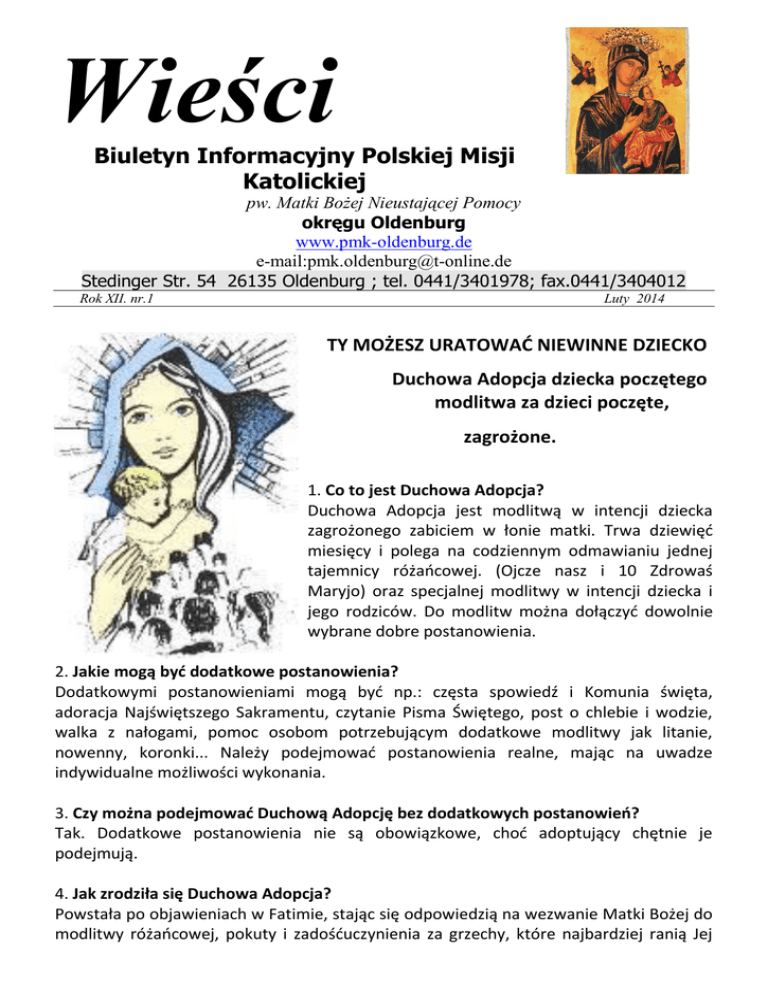 Wieści Biuletyn Informacyjny Polskiej Misji Katolickiej pw. Matki Bożej Nieustającej Pomocy okręgu Oldenburg www.pmk-oldenburg.de e-mail:[email protected] Stedinger Str. 54 26135 Oldenburg ; tel. 0441/3401978; fax.0441/3404012 Rok XII. nr.1 Luty 2014 TY MOŻESZ URATOWAĆ NIEWINNE DZIECKO Duchowa Adopcja dziecka poczętego modlitwa za dzieci poczęte, zagrożone. 1. Co to jest Duchowa Adopcja? Duchowa Adopcja jest modlitwą w intencji dziecka zagrożonego zabiciem w łonie matki. Trwa dziewięć miesięcy i polega na codziennym odmawianiu jednej tajemnicy różańcowej. (Ojcze nasz i 10 Zdrowaś Maryjo) oraz specjalnej modlitwy w intencji dziecka i jego rodziców. Do modlitw można dołączyć dowolnie wybrane dobre postanowienia. 2. Jakie mogą być dodatkowe postanowienia? Dodatkowymi postanowieniami mogą być np.: częsta spowiedź i Komunia święta, adoracja Najświętszego Sakramentu, czytanie Pisma Świętego, post o chlebie i wodzie, walka z nałogami, pomoc osobom potrzebującym dodatkowe modlitwy jak litanie, nowenny, koronki... Należy podejmować postanowienia realne, mając na uwadze indywidualne możliwości wykonania. 3. Czy można podejmować Duchową Adopcję bez dodatkowych postanowień? Tak. Dodatkowe postanowienia nie są obowiązkowe, choć adoptujący chętnie je podejmują. 4. Jak zrodziła się Duchowa Adopcja? Powstała po objawieniach w Fatimie, stając się odpowiedzią na wezwanie Matki Bożej do modlitwy różańcowej, pokuty i zadośćuczynienia za grzechy, które najbardziej ranią Jej Niepokalane Serce. W roku 1987 została przeniesiona do Polski. Pierwszy ośrodek Duchowej Adopcji powstał przy kościele Ojców Paulinów w Warszawie. Stąd Duchowa Adopcja rozprzestrzenia się na kraj i poza jego granice. 5. Jakie są owoce Duchowej Adopcji? Duchowa Adopcja skutecznie leczy głębokie zranienia wewnętrzne, spowodowane grzechem aborcji. Pozwała matkom odzyskać wiarę w Boże Miłosierdzie, przynosząc pokój ich sercom. Jako bardzo konkretny, bezinteresowny i osobisty dar (modlitwy, ofiary i postu), pomaga (w szczególności ludziom młodym) kształtować charakter, walczyć z egoizmem, odkrywać radość odpowiedzialnego rodzicielstwa. Ucząc systematycznej modlitwy i pozytywnego działania, pogłębia kontakt z Bogiem. Pomaga odkrywać głęboki sens zaniedbanych praktyk ascetycznych. Może się stać czynnikiem odrodzenia wspólnej modlitwy i miłości w rodzinach. 6. Kto może podejmować Duchową Adopcję? Każdy. Osoby świeckie, konsekrowane, mężczyźni, kobiety, ludzie w każdym wieku. Jedynie dzieci podejmują Duchową Adopcję pod opieką rodziców. 7. Ile razy można podjąć Duchową Adopcję? Można podejmować ją wielokrotnie, pod warunkiem wypełnienia poprzednich zobowiązań. 8. Czy trzeba za każdym razem składać przyrzeczenia? Tak. 9. Czy można adoptować więcej niż jedno dziecko? Duchowa Adopcja dotyczy jednego dziecka. 10. Czy wiemy, jakiej narodowości będzie adoptowane dziecko? Nie wiemy. Imię dziecka zna jedynie Bóg. 11. Skąd pewność, że Bóg wysłucha mojej modlitwy? Naszą pewność opieramy na wierze we Wszechmoc i nieograniczone Miłosierdzie Boże. Bóg jest dawcą życia i Jego wolą jest, by każde poczęte dziecko żyło i było otoczone miłością rodziców. 12. Czy jest grzechem, jeżeli danego dnia zapomni się odmówić modlitwę? Zapomnienie nie jest grzechem. Grzechem jest świadome i dobrowolne zlekceważenie składanego Bogu przyrzeczenia. 13. Czy przerywa się Duchową Adopcję, gdy zaniedbało się modlitwę przez dłuższy czas? Długa przerwa (miesiąc, dwa) przerywa Duchową Adopcję. Należy wtedy ponowić przyrzeczenie i starać się je dotrzymać. W wypadku krótkiej przerwy należy Duchową Adopcję kontynuować, przedłużając modlitwę o opuszczone dni. 14. Czy Duchową Adopcję mogą podejmować osoby żyjące w związkach niesakramentalnych? Tak, podobnie jak i osoby rozwiedzione. W naszej misji w Duchowej Adopcji dziecka poczętego uczestniczy 30 osób. Kolejna możliwość przystąpienia do tego dzieła będzie w marcu 2014 roku w związku z przypadającą wówczas uroczystością Zwiastowania Pańskiego. Ogłoszenia Duszpasterskie: 1. Adoracja Najświętszego Sakramentu w pierwszą niedzielę miesiąca po Mszach św. 2. Zmiana tajemnic żywego różańca w pierwszą niedzielę miesiąca. Intencje różańcowe: Intencja ogólna: Aby mądrość i doświadczenie osób w podeszłym wieku były uznawane w Kościele i w społeczeństwie. Intencja misyjna: Aby kapłani, zakonnicy i świeccy wielkodusznie współpracowali w misji ewangelizacyjnej. 3. Nowenna do Matki Bożej Nieustającej Pomocy we wtorki w Oldenburgu i w środy w Delmenhorst. 4. W sobotę 2 lutego przypada święto Ofiarowania Pańskiego – Matki Bożej Gromnicznej. Msze św. jak w każdą pierwszą niedzielę miesiąca. 5. W pierwszy piątek miesiąca: 7 Lutego w Oldenburgu w kościele Hl. Geist o godz. 16.00 Msza św. z sakramentem pokuty dla dzieci i o godz. 17.30 spowiedź dla dorosłych. Msza św. dla dorosłych o godz. 18.00. 6. We wtorek 11 lutego w święto NMP z Lurdes przypada Dzień Chorego. Msza św. z udzieleniem Sakramentu Namaszczenia Chorych w kościele Hl. Geist o godz. 18.00 7. Biuro parafialne czynne jest: we wtorek od godz. 10.00 – 14.00 i w piątek od godz. 14.30 – 17.30 8. Msze św. w naszej Misji: Bad Zwischenahn - trzecia sobota miesiąca o godz. 16.00 Delmenhorst - każda niedziela o godz. 9.30 ( Allerheiligen) środa o godz. 17.00 Nowenna ( St.Marien) Emstek- trzeci czwartek miesiąca o godz.19.00 (Seniorenzentrum) Nordenham - trzecia niedziela miesiąca o godz. 15.30 ( Herz Jesu) Oldenburg - każda niedziela o godz. 12.30 ( St.Peter) wtorek o godz. 18.00 (Hl. Geist) piątek o godz. 18.00 ( Hl.Geist) sobota o godz. 17.30 (Hl.Geist) Vechta- pierwsza niedziela miesiąca o godz.15.30 (St.Marien in Oythe) Wilhelmshaven - II, IV, i V niedziela miesiąca o godz.15.30(St.Marien) Polska Misja Kato