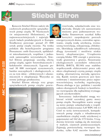 ABC Magazynu Instalatora nr 82014 ABC mikroinstalacji OZE Stiebel Eltron KoncernStiebelEltronnależydo czołowychproducentówsprężarkowych pomp ciepła. W Niemczech (w miejscowości Holzminen), w najn ow oc ześ niejs zych i najw iększychhalachprodukcyjnychwEuropie Środk ow ej pow staj e pon ad 25 000 sztuk pomp ciepła rocznie. Na rynku polskim dla beneficjentów programu Prosument:osóbfizycznych,spółdzielni mieszkaniowych, wspólnot i jednostek samorządów terytorialnych, Stiebel Eltron proponuje szeroką ofertę pomp ciepła, ogniw fotowoltaicznych i kolektorów słonecznych. Łącznie ponad 30 000 rozwiązań systemowych, bardzo oszczędnych i ekologicznych, a cozatymidzie-efektywnychiekonomicznych w eksploatacji. Wszystko ze stronyjednegoproducenta. Stieb el Elt ron ofer uj e trzy grup y spręż ark ow ych pomp ciep ła: pow ie- 10 trze/woda, solanka/woda oraz woda/woda. Dzięki ich zastosowaniu możemy przy jednorazowym wydatku finansowym uzyskać kilka kor zyś ci: zas pok oj en ie pot rzeb energetycznychdomu,centralneogrzewanie, ciepłą wodę użytkową, wymuszonąwentylację,rekuperację,chłodzenie, likwidację szkodliwych substancji, dług ą żyw otn ość i możl iw ie nis kie koszt y eksp loa tac yjn e. Urząd zen ia czerpiąblisko70%energiizpowietrza, wody gruntowej i gruntu. Stosowanie ekol og iczn ych czynn ik ów rob oc zych R410A, R407A, R134A oraz stabilny współczynnik efektywności przez cały okreseksploatacjiczyniąpompyciepła realną, alternatywną metodą ogrzewania. Każdy system grzewczy jest kontrolowanyimonitorowanyprzeznajnowoc ześ niejs zą techn ikę reg ul ac yjn ą. Prostaobsługawjęz.polskimiszeroki zakresdostępnychfunkcjitokomfortowerozwiązaniedlanajbardziejwymagającychużytkowników. Inwestorzy indywidualni mogą wybier ać wśród szer ok iej gam y moc y pomp ciepła. Szczególnie warte uwagi sąnowepompysolanka/wodaowspółczynnikuefektywności5,0!WPC04-13 Cool to seria nowoczesnych, kompaktowych pomp ciepła z wbudowanym zasobnikiemciepłejwodyużytkowejo pojemnościod162do175litrów.Urządzeniaświetnienadająsiędomontażu w małych, ciasnych pomieszczeniach. Zajmują powierzchnię wewnątrz budynku, tylko 0,42 metrów kwadrato- www.instalator.pl nr 82014 wych.WPF04-16Cooltodrugazserii wysokoefektywnych pomp ciepła do instalacjiwewnątrzbudynku,onajwyższym współczynniku COP = 5,0! Jest potężnym dostawcą energii użytkowej potrzebnejdoogrzaniabudynkuipodgrzewu wody użytkowej. Dla większych obiektów Stiebel Eltron proponujepompyciepłaWPF20-66kW,któreidealniesprawdzająsięwbudynkach odużymzapotrzebowaniunaciepło:w blokach, apartamentowcach, pomiesz- chociaż ze względu na wyższy współczynnik efektywności wykorzystywany jest najczęściej w niskotemperaturowychsystemachgrzewczych.Wartozaznaczyć, że kompaktowa konstrukcja pompyWPF20-66powoduje,żeinstalac ja zab ier a niew iel e miejs ca wewnątrz budynku. „Kontenerowa” koncepcjatychurządzeńpozwalanabudowę kaskad, których poszczególne moduły ustawiane są jeden na drugim i tymsamympozwalazaoszczędzićcennąprzestrzeńwkotłowni.Maksymalna ilość w kaskadzie wynosi sześć urządzeń, co pozwala osiągnąć aż 400 kW mocy.Podstawowymizaletamisystemu kaskadowego są bardzo niskie koszty eksploatacjipodczasczęściowegozapotrzebowanianaciepłoorazredukcjaryzyka awarii całego systemu. W ofercie dostępne są również pompy serii HT, gdzie realna temperatura zasilania wynosi+75°C,dlategopompajestodpowiedniadozastosowaniawstarych/istniejącychbudynkach. Marek Bosiacki ekspert Marek Bosiacki Stiebel Eltron Polska Sp. z o. o. www.stiebel-eltron.pl www.instalator.pl ☎ 602 732 137 @ [email protected] 11 ABC mikroinstalacji OZE czen iach przem ys łow ych. Prac ują w systemiesolanka/wodalubwoda/woda, służąc do automatycznego ogrzewania wodygrzewczejdotemperaturyzasilania +60°C. System grzewczy przystosowanyjestdoogrzewaniapodłogowego i grzejnikowego, jak również do przygotowaniaciepłejwodyużytkowej, ABC Magazynu Instalatora