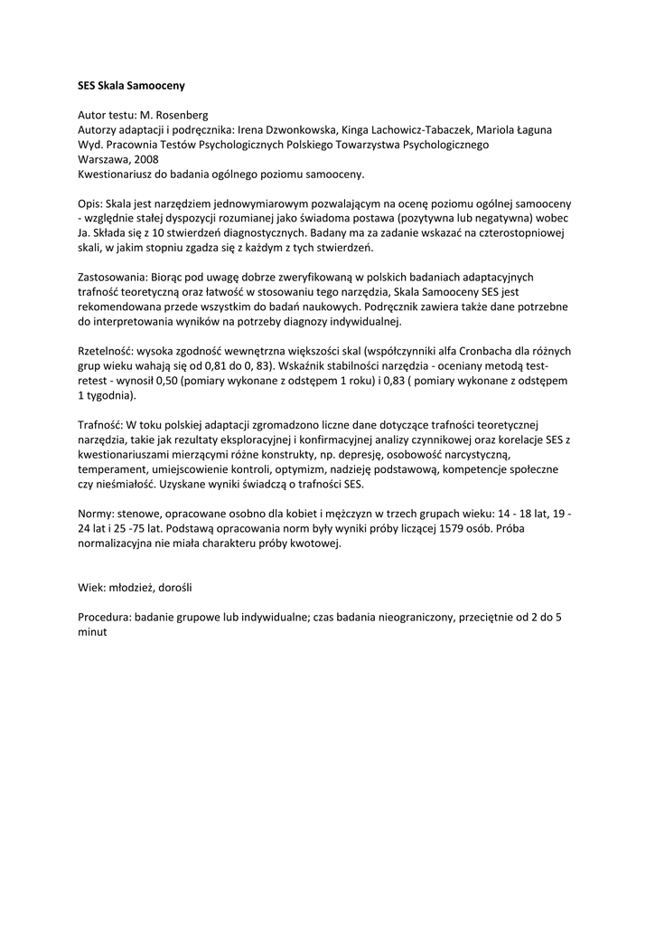 SES Skala Samooceny Autor testu: M. Rosenberg Autorzy adaptacji i podręcznika: Irena Dzwonkowska, Kinga Lachowicz-Tabaczek, Mariola Łaguna Wyd. Pracownia Testów Psychologicznych Polskiego Towarzystwa Psychologicznego Warszawa, 2008 Kwestionariusz do badania ogólnego poziomu samooceny. Opis: Skala jest narzędziem jednowymiarowym pozwalającym na ocenę poziomu ogólnej samooceny - względnie stałej dyspozycji rozumianej jako świadoma postawa (pozytywna lub negatywna) wobec Ja. Składa się z 10 stwierdzeń diagnostycznych. Badany ma za zadanie wskazać na czterostopniowej skali, w jakim stopniu zgadza się z każdym z tych stwierdzeń. Zastosowania: Biorąc pod uwagę dobrze zweryfikowaną w polskich badaniach adaptacyjnych trafność teoretyczną oraz łatwość w stosowaniu tego narzędzia, Skala Samooceny SES jest rekomendowana przede wszystkim do badań naukowych. Podręcznik zawiera także dane potrzebne do interpretowania wyników na potrzeby diagnozy indywidualnej. Rzetelność: wysoka zgodność wewnętrzna większości skal (współczynniki alfa Cronbacha dla różnych grup wieku wahają się od 0,81 do 0, 83). Wskaźnik stabilności narzędzia - oceniany metodą testretest - wynosił 0,50 (pomiary wykonane z odstępem 1 roku) i 0,83 ( pomiary wykonane z odstępem 1 tygodnia). Trafność: W toku polskiej adaptacji zgromadzono liczne dane dotyczące trafności teoretycznej narzędzia, takie jak rezultaty eksploracyjnej i konfirmacyjnej analizy czynnikowej oraz korelacje SES z kwestionariuszami mierzącymi różne konstrukty, np. depresję, osobowość narcystyczną, temperament, umiejscowienie kontroli, optymizm, nadzieję podstawową, kompetencje społeczne czy nieśmiałość. Uzyskane wyniki świadczą o trafności SES. Normy: stenowe, opracowane osobno dla kobiet i mężczyzn w trzech grupach wieku: 14 - 18 lat, 19 24 lat i 25 -75 lat. Podstawą opracowania norm były wyniki próby liczącej 1579 osób. Próba normalizacyjna nie miała charakteru próby kwotowej. Wiek: młodzież, dorośli Procedura: badanie grupowe lub indywidualne; czas badania nieograniczony, przeciętnie od 2 do 5 minut