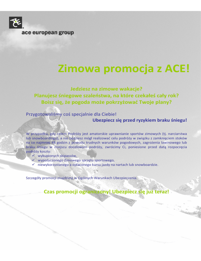 Zimowa promocja z ACE! Jedziesz na zimowe wakacje? Planujesz śniegowe szaleństwa, na które czekałeś cały rok? Boisz się, że pogoda może pokrzyżować Twoje plany? Przygotowaliśmy coś specjalnie dla Ciebie! Ubezpiecz się przed ryzykiem braku śniegu! W przypadku, gdy celem Podróży jest amatorskie uprawnianie sportów zimowych (tj. narciarstwa lub snowboardingu), a nie będziesz mógł realizować celu podróży w związku z zamknięciem stoków na co najmniej 48 godzin z powodu trudnych warunków pogodowych, zagrożenia lawinowego lub braku śniegu w miejscu docelowym podróży, zwrócimy Ci, poniesione przed datą rozpoczęcia podróży koszty: wykupionych skipassów, wypożyczonego Zimowego sprzętu sportowego, niewykorzystanego a opłaconego kursu jazdy na nartach lub snowboardzie. Szczegóły promocji znajdziesz w Ogólnych Warunkach Ubezpieczenia. Czas promocji ograniczony! Ubezpiecz się już teraz!