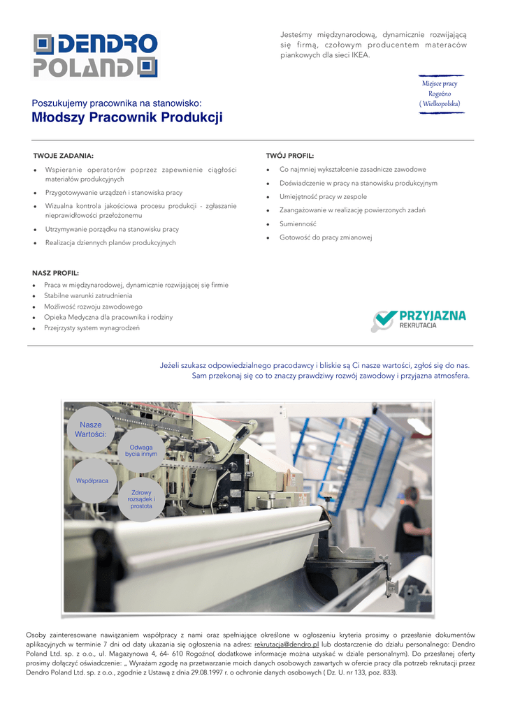 Jesteśmy międzynarodową, dynamicznie rozwijającą się firmą, czołowym producentem materaców piankowych dla sieci IKEA. Miejsce pracy Rogoźno ( Wielkopolska) Poszukujemy pracownika na stanowisko: Młodszy Pracownik Produkcji TWÓJ PROFIL: TWOJE ZADANIA: • Wspieranie operatorów poprzez zapewnienie ciągłości materiałów produkcyjnych • Przygotowywanie urządzeń i stanowiska pracy • Wizualna kontrola jakościowa procesu produkcji - zgłaszanie nieprawidłowości przełożonemu • Utrzymywanie porządku na stanowisku pracy • Realizacja dziennych planów produkcyjnych • Co najmniej wykształcenie zasadnicze zawodowe • Doświadczenie w pracy na stanowisku produkcyjnym • Umiejętność pracy w zespole • Zaangażowanie w realizację powierzonych zadań • Sumienność • Gotowość do pracy zmianowej NASZ PROFIL: • Praca w międzynarodowej, dynamicznie rozwijającej się firmie • Stabilne warunki zatrudnienia • Możliwość rozwoju zawodowego • Opieka Medyczna dla pracownika i rodziny • Przejrzysty system wynagrodzeń Jeżeli szukasz odpowiedzialnego pracodawcy i bliskie są Ci nasze wartości, zgłoś się do nas. Sam przekonaj się co to znaczy prawdziwy rozwój zawodowy i przyjazna atmosfera. Nasze Wartości: Odwaga bycia innym Współpraca Zdrowy rozsądek i prostota Osoby zainteresowane nawiązaniem współpracy z nami oraz spełniające określone w ogłoszeniu kryteria prosimy o przesłanie dokumentów aplikacyjnych w terminie 7 dni od daty ukazania się ogłoszenia na adres: [email protected] lub dostarczenie do działu personalnego: Dendro Poland Ltd. sp. z o.o., ul. Magazynowa 4, 64- 610 Rogoźno( dodatkowe informacje można uzyskać w dziale personalnym). Do przesłanej oferty prosimy dołączyć oświadczenie: „ Wyrażam zgodę na przetwarzanie moich danych osobowych zawartych w ofercie pracy dla potrzeb rekrutacji przez Dendro Poland Ltd. sp. z o.o., zgodnie z Ustawą z dnia 29.08.1997 r. o ochronie danych osobowych ( Dz. U. nr 133, poz. 833).