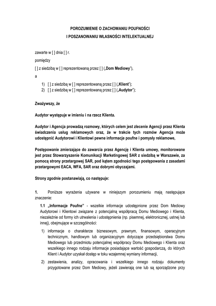 POROZUMIENIE O ZACHOWANIU POUFNOŚCI I POSZANOWANIU WŁASNOŚCI INTELEKTUALNEJ zawarte w [ ] dnia [ ] r. pomiędzy [ ] z siedzibą w [ ] reprezentowaną przez [ ] („Dom Mediowy”), a 1) [ ] z siedzibą w [ ] reprezentowaną przez [ ] („Klient”); 2) [ ] z siedzibą w [ ] reprezentowaną przez [ ] („Audytor”); Zważywszy, że Audytor występuje w imieniu i na rzecz Klienta. Audytor i Agencja prowadzą rozmowy, których celem jest zlecenie Agencji przez Klienta świadczenia usług reklamowych oraz, że w trakcie tych rozmów Agencja może udostępnić Audytorowi i Klientowi pewne informacje poufne i pomysły reklamowe, Postępowanie zmierzające do zawarcia przez Agencję i Klienta umowy, monitorowane jest przez Stowarzyszenie Komunikacji Marketingowej SAR z siedzibą w Warszawie, za pomocą strony przetargowej SAR, pod kątem zgodności tego postępowania z zasadami przetargowymi EACA, WFA, SAR oraz dobrymi obyczajami. Strony zgodnie postanawiają, co następuje: 1. Poniższe wyrażenia używane w niniejszym porozumieniu mają następujące znaczenie: 1.1 „Informacje Poufne” - wszelkie informacje udostępnione przez Dom Mediowy Audytorowi i Klientowi związane z potencjalną współpracą Domu Mediowego i Klienta, niezależnie od formy ich utrwalenia i udostępnienia (np. pisemnej, elektronicznej, ustnej lub innej), obejmujące w szczególności: 1) informacje o charakterze biznesowym, prawnym, finansowym, operacyjnym technicznym, handlowym lub organizacyjnym dotyczące przedsiębiorstwa Domu Mediowego lub przedmiotu potencjalnej współpracy Domu Mediowego i Klienta oraz wszelkiego innego rodzaju informacje posiadające wartość gospodarczą, do których Klient i Audytor uzyskał dostęp w toku wzajemnej wymiany informacji, 2) zestawienia, analizy, opracowania i wszelkiego innego rodzaju dokumenty przygotowane przez Dom Mediowy, jeżeli zawierają one lub są sporządzone przy wykorzystaniu informacji, o których mowa w pkt 1 lub są w inny sposób związane z tymi informacjami. 1.2 „Pomysły Reklamowe” - idee, rozwiązania, teksty, ilustracje oraz inne materiały, niezależnie od sposobu ich wyrażenia oraz niezależnie od tego, czy stanowią one przedmiot ochrony prawa autorskiego lub innych praw bezwzględnych. Pomysły Reklamowe mogą obejmować w szczególności strategię kampanii reklamowej lub plany mediowe, a także: _______________________________________________________________________, _______________________________________________________________________. 2. Klient i Audytor przyjmują do wiadomości, że podczas rozmów Dom Mediowy udostępni im Informacje Poufne oraz Pomysły Reklamowe. Informacje Poufne oraz Pomysły Reklamowe zostaną zaprezentowane Klientowi i Audytorowi jedynie w ramach stosunku poufności istniejącego pomiędzy stronami. 3. Udostępnienia przez Dom Mediowy Informacji Poufnych oraz Pomysłów Reklamowych nie należy rozumieć jako przeniesienia na Klienta lub Audytora praw ani udzielenia mu jakichkolwiek licencji dotyczących tych dóbr. 4. Klient zapewni, że Informacje Poufne oraz Pomysły Reklamowe będą udostępniane wyłącznie tym pracownikom lub współpracownikom Klienta i Audytora, którzy muszą się z nimi zapoznać celem oceny oferty Domu Mediowego. Osoby takie zostaną zobowiązane do zachowania poufności oraz wykorzystywania Informacji Poufnych i Pomysłów Reklamowych wyłącznie celem oceny oferty Domu Mediowego. Klient i Audytor odpowiada za działania i zaniechania takich osób jak za własne. 5. Jeżeli nie zostanie zawarta umowa o świadczenie usług planowania i zakupu czasu i przestrzeni reklamowej, Klient i Audytor na wezwanie Domu Mediowego wyda mu niezwłocznie wszystkie nośniki informacji zawierające Informacje Poufne oraz Pomysły Reklamowe. Jeżeli zapisy zawierające Informacje Poufne lub Pomysły Reklamowe będą znajdowały się na nośnikach informacji, które nie mogą być wydane Domowi Mediowemu, Klient i Audytor niezwłocznie skasuje lub zniszczy takie zapisy. Klient i Audytor nie będzie też wykorzystywał w swojej działalności ani udostępniał osobom trzecim Informacji Poufnych ani Pomysłów Reklamowych, bez uzyskania uprzedniej pisemnej zgody Domu Mediowego. 6. Powyższe zobowiązania nie dotyczą: 6.1 Informacji Poufnych i Pomysłów Reklamowych, jeżeli Klient lub Audytor wykaże przy pomocy odpowiednich dokumentów, że przed datą ich udostępnienia przez Dom Mediowy znał je i planował ich wykorzystanie, 6.2 Informacji Poufnych, które są lub staną się publicznie dostępne w wyniku zdarzeń innych niż naruszenie postanowień niniejszego porozumienia, 6.3 Informacji Poufnych, które muszą być ujawnione na mocy orzeczeń sądowych lub decyzji administracyjnych, w związku z prowadzeniem postępowań na mocy przepisów prawa, jednak w takim wypadku Klient powinien niezwłocznie poinformować Dom Mediowy o konieczności i zakresie ujawnienia informacji oraz 6.4 Informacji Poufnych po upływie 5 lat od daty ujawnienia ich Klientowi lub Audytorowi. 7. W przypadku naruszenia przez Klienta obowiązków wynikających z niniejszego porozumienia, Klient będzie obowiązany do zapłaty na rzecz Domu Mediowego kary umownej wynoszącej … (słownie: …). Kara umowna płatna będzie przez Klienta na wezwania do zapłaty wystawionego przez Dom Mediowy, na rachunek bankowy Domu Mediowego wskazany w wezwaniu, w ciągu 14 dni od daty doręczenia wezwania. Dom Mediowy może dochodzić odszkodowania przewyższającego wysokość zastrzeżonej kary umownej na zasadach ogólnych. 8. W przypadku naruszenia przez Audytora obowiązków wynikających z niniejszego porozumienia, Audytor będzie obowiązany do zapłaty na rzecz Domu Mediowego kary umownej wynoszącej … (słownie: …). Kara umowna płatna będzie przez Audytora na podstawie wezwania do zapłaty wystawionego przez Dom Mediowy na rachunek bankowy Domu Mediowego wskazany w wezwaniu, w ciągu 14 dni od daty doręczenia wezwania. Dom M