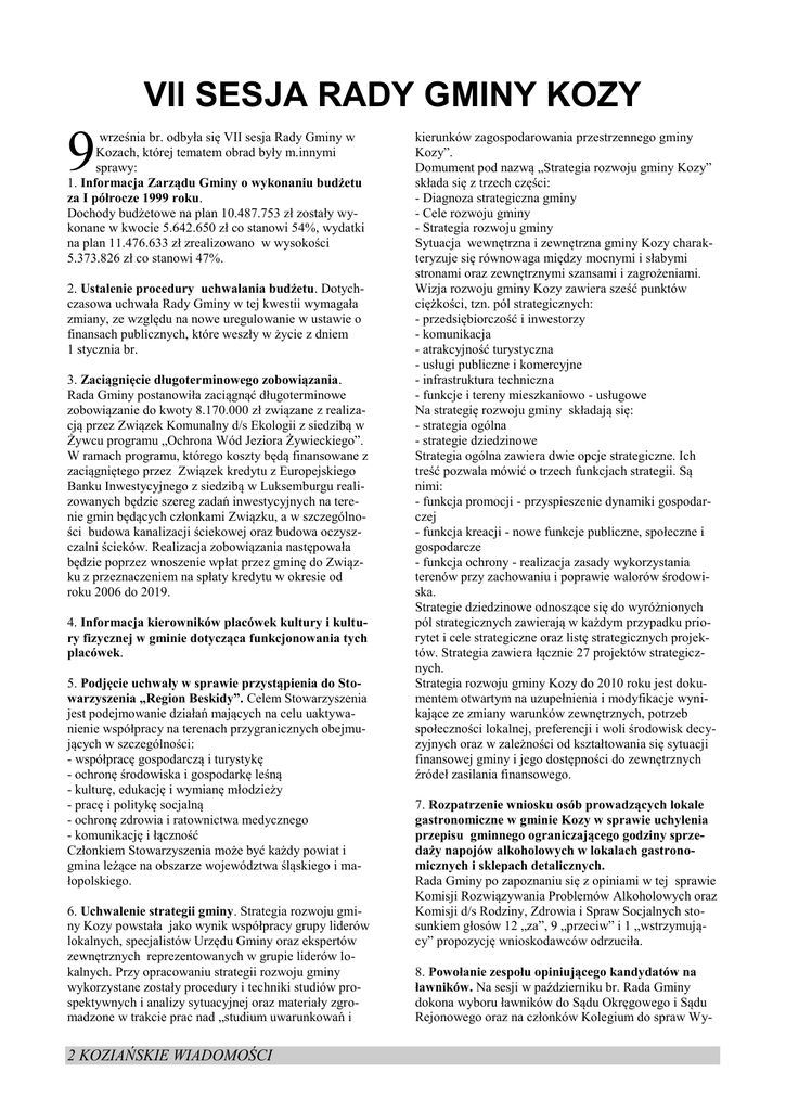 VII SESJA RADY GMINY KOZY września br. odbyła się VII sesja Rady Gminy w Kozach, której tematem obrad były m.innymi sprawy: 1. Informacja Zarządu Gminy o wykonaniu budżetu za I półrocze 1999 roku. Dochody budżetowe na plan 10.487.753 zł zostały wykonane w kwocie 5.642.650 zł co stanowi 54%, wydatki na plan 11.476.633 zł zrealizowano w wysokości 5.373.826 zł co stanowi 47%. 9 2. Ustalenie procedury uchwalania budżetu. Dotychczasowa uchwała Rady Gminy w tej kwestii wymagała zmiany, ze względu na nowe uregulowanie w ustawie o finansach publicznych, które weszły w życie z dniem 1 stycznia br. 3. Zaciągnięcie długoterminowego zobowiązania. Rada Gminy postanowiła zaciągnąć długoterminowe zobowiązanie do kwoty 8.170.000 zł związane z realizacją przez Związek Komunalny d/s Ekologii z siedzibą w Żywcu programu „Ochrona Wód Jeziora Żywieckiego”. W ramach programu, którego koszty będą finansowane z zaciągniętego przez Związek kredytu z Europejskiego Banku Inwestycyjnego z siedzibą w Luksemburgu realizowanych będzie szereg zadań inwestycyjnych na terenie gmin będących członkami Związku, a w szczególności budowa kanalizacji ściekowej oraz budowa oczyszczalni ścieków. Realizacja zobowiązania następowała będzie poprzez wnoszenie wpłat przez gminę do Związku z przeznaczeniem na spłaty kredytu w okresie od roku 2006 do 2019. 4. Informacja kierowników placówek kultury i kultury fizycznej w gminie dotycząca funkcjonowania tych placówek. 5. Podjęcie uchwały w sprawie przystąpienia do Stowarzyszenia „Region Beskidy”. Celem Stowarzyszenia jest podejmowanie działań mających na celu uaktywanienie współpracy na terenach przygranicznych obejmujących w szczególności: - współpracę gospodarczą i turystykę - ochronę środowiska i gospodarkę leśną - kulturę, edukację i wymianę młodzieży - pracę i politykę socjalną - ochronę zdrowia i ratownictwa medycznego - komunikację i łączność Członkiem Stowarzyszenia może być każdy powiat i gmina leżące na obszarze województwa śląskiego i małopolskiego. 6. Uchwalenie strategii gminy. Strategia rozwoju gminy Kozy powstała jako wynik współpracy grupy liderów lokalnych, specjalistów Urzędu Gminy oraz ekspertów zewnętrznych reprezentowanych w grupie liderów lokalnych. Przy opracowaniu strategii rozwoju gminy wykorzystane zostały procedury i techniki studiów prospektywnych i analizy sytuacyjnej oraz materiały zgromadzone w trakcie prac nad „studium uwarunkowań i 2 KOZIAŃSKIE WIADOMOŚCI kierunków zagospodarowania przestrzennego gminy Kozy”. Domument pod nazwą „Strategia rozwoju gminy Kozy” składa się z trzech części: - Diagnoza strategiczna gminy - Cele rozwoju gminy - Strategia rozwoju gminy Sytuacja wewnętrzna i zewnętrzna gminy Kozy charakteryzuje się równowaga między mocnymi i słabymi stronami oraz zewnętrznymi szansami i zagrożeniami. Wizja rozwoju gminy Kozy zawiera sześć punktów ciężkości, tzn. pól strategicznych: - przedsiębiorczość i inwestorzy - komunikacja - atrakcyjność turystyczna - usługi publiczne i komercyjne - infrastruktura techniczna - funkcje i tereny mieszkaniowo - usługowe Na strategię rozwoju gminy składają się: - strategia ogólna - strategie dziedzinowe Strategia ogólna zawiera dwie opcje strategiczne. Ich treść pozwala mówić o trzech funkcjach strategii. Są nimi: - funkcja promocji - przyspieszenie dynamiki gospodarczej - funkcja kreacji - nowe funkcje publiczne, społeczne i gospodarcze - funkcja ochrony - realizacja zasady wykorzystania terenów przy zachowaniu i poprawie walorów środowiska. Strategie dziedzinowe odnoszące się do wyróżnionych pól strategicznych zawierają w każdym przypadku priorytet i cele strategiczne oraz listę strategicznych projektów. Strategia zawiera łącznie 27 projektów strategicznych. Strategia rozwoju gminy Kozy do 2010 roku jest dokumentem otwartym na uzupełnienia i modyfikacje wynikające ze zmiany warunków zewnętrznych, potrzeb społeczności lokalnej, preferencji i woli środowisk decyzyjnych oraz w zależności od kształtowania się sytuacji finansowej gminy i jego dostępności do zewnętrznych źródeł zasilania finansowego. 7. Rozpatrzenie wniosku osób prowadzących lokale gastronomiczne w gminie Kozy w sprawie uchylenia przepisu gminnego ograniczającego godziny sprzedaży napojów alkoholowych w lokalach gastronomicznych i sklepach detalicznych. Rada Gminy po zapoznaniu się z opiniami w tej sprawie Komisji Rozwiązywania Problemów Alkoholowych oraz Komisji d/s Rodziny, Zdrowia i Spraw Socjalnych stosunkiem głosów 12 „za”, 9 „przeciw” i 1 „wstrzymujący” propozycję wnioskodawców odrzuciła. 8. Powołanie zespołu opiniującego kandydatów na ławników. Na sesji w październiku br. Rada Gminy dokona wyboru ławników do Sądu Okręgowego i Sądu Rejonowego oraz na członków Kolegium do spraw Wy- kroczeń. Ustawa - prawo o ustroju sądów powszechnych wprowadza obowiązek powołania przed przystąpieniem do wyborów ławników, zespołu który przedstawi na sesji swoją opinię o zgłoszonych kandydatach. W skład zespołu opiniującego Rada powołała następujące osoby. 1. Grażyna Handzlik 2. Zyta Żaczek 3.Jacek Bożek 4.Edward Kućka 9. Zaopiniowanie projektu uchwały Rady Miejskiej w Bielsku - Białej o likwidacji Zespołu Opieki Zdrowotnej w Bielsku - Białej. Gmina Bielsko - Biała rozpoczęła proces restrukturyzacji Zespołu Opieki Zdrowotnej. Zmiany zmierzają do udo- stępnienia majątku gminy Bielsko - Biała związanego z ochroną zdrowia nowo powstałym podmiotom, które przejmą udzielanie świadczeń zdrowotnych w zakresie podstawowej opieki zdrowotnej i specjalistyki ambulatoryjnej w oparciu o kontrakty z Kasami Chorych. Rada Gminy Kozy pozytywnie zaopiniowała projekt uchwały Rady Miejskiej w Bielsku - Białej w sprawie likwidacji Zespołu Opieki Zdrowotnej w Bielsku - Białej. 10. Nad