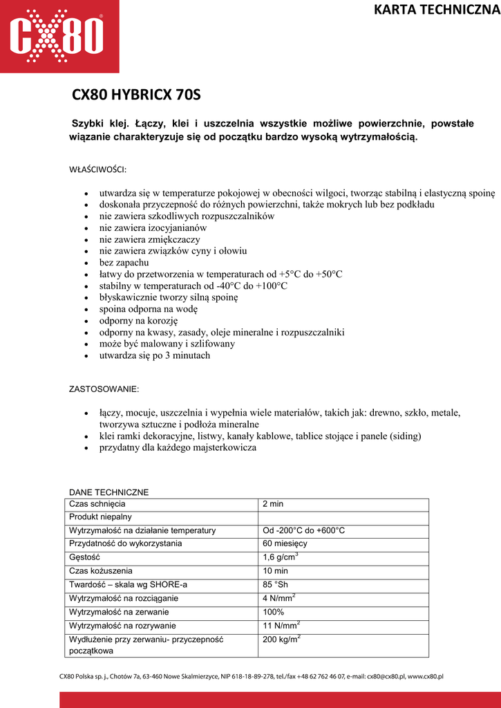 KARTA TECHNICZNA CX80 HYBRICX 70S Szybki klej. Łączy, klei i uszczelnia wszystkie możliwe powierzchnie, powstałe wiązanie charakteryzuje się od początku bardzo wysoką wytrzymałością. WŁAŚCIWOŚCI: utwardza się w temperaturze pokojowej w obecności wilgoci, tworząc stabilną i elastyczną spoinę doskonała przyczepność do różnych powierzchni, także mokrych lub bez podkładu nie zawiera szkodliwych rozpuszczalników nie zawiera izocyjanianów nie zawiera zmiękczaczy nie zawiera związków cyny i ołowiu bez zapachu łatwy do przetworzenia w temperaturach od +5°C do +50°C stabilny w temperaturach od -40°C do +100°C błyskawicznie tworzy silną spoinę spoina odporna na wodę odporny na korozję odporny na kwasy, zasady, oleje mineralne i rozpuszczalniki może być malowany i szlifowany utwardza się po 3 minutach ZASTOSOWANIE: łączy, mocuje, uszczelnia i wypełnia wiele materiałów, takich jak: drewno, szkło, metale, tworzywa sztuczne i podłoża mineralne klei ramki dekoracyjne, listwy, kanały kablowe, tablice stojące i panele (siding) przydatny dla każdego majsterkowicza DANE TECHNICZNE Czas schnięcia 2 min Produkt niepalny Wytrzymałość na działanie temperatury Od -200°C do +600°C Przydatność do wykorzystania 60 miesięcy Gęstość 1,6 g/cm Czas kożuszenia 10 min Twardość – skala wg SHORE-a 85 °Sh Wytrzymałość na rozciąganie 4 N/mm Wytrzymałość na zerwanie 100% Wytrzymałość na rozrywanie 11 N/mm Wydłużenie przy zerwaniu- przyczepność początkowa 200 kg/m 3 2 2 2