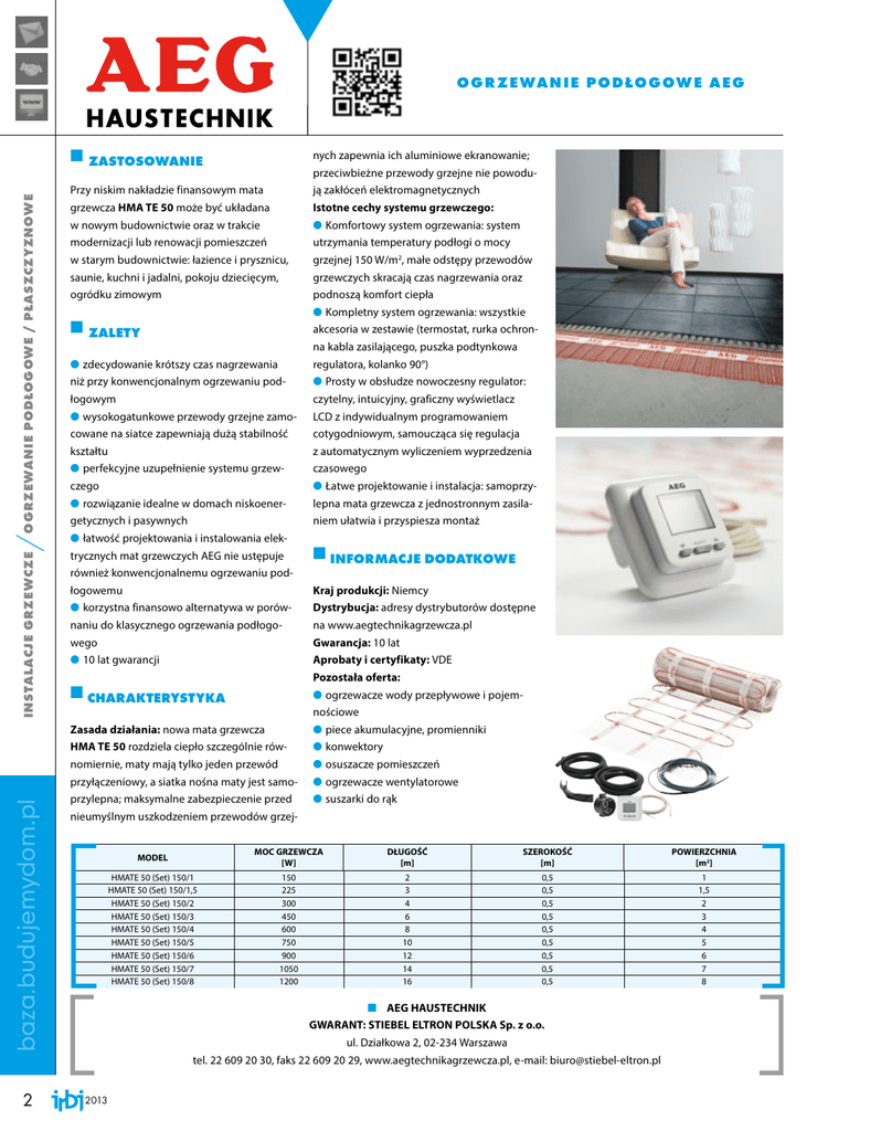 baza.budujemydom.pl INSTALACJE GRZEWCZE / OGRZEWANIE PODŁOGOWE / PŁASzCZYZNOWE OGRZEWANIE PODŁ OGOWE AEG n ZASTOSOWANIE nych zapewnia ich aluminiowe ekranowanie; Przy niskim nakładzie finansowym mata ją zakłóceń elektromagnetycznych grzewcza HMA TE 50 może być układana Istotne cechy systemu grzewczego: w nowym budownictwie oraz w trakcie l Komfortowy system ogrzewania: system modernizacji lub renowacji pomieszczeń utrzymania temperatury podłogi o mocy w starym budownictwie: łazience i prysznicu, grzejnej 150 W/m2, małe odstępy przewodów saunie, kuchni i jadalni, pokoju dziecięcym, grzewczych skracają czas nagrzewania oraz ogródku zimowym podnoszą komfort ciepła przeciwbieżne przewody grzejne nie powodu- l Kompletny system ogrzewania: wszystkie n ZALETY akcesoria w zestawie (termostat, rurka ochron- l zdecydowanie krótszy czas nagrzewania regulatora, kolanko 90°) niż przy konwencjonalnym ogrzewaniu pod- l Prosty w obsłudze nowoczesny regulator: łogowym czytelny, intuicyjny, graficzny wyświetlacz l wysokogatunkowe przewody grzejne zamo- LCD z indywidualnym programowaniem cowane na siatce zapewniają dużą stabilność cotygodniowym, samoucząca się regulacja kształtu z automatycznym wyliczeniem wyprzedzenia l perfekcyjne uzupełnienie systemu grzew- czasowego czego l Łatwe projektowanie i instalacja: samoprzy- l rozwiązanie idealne w domach niskoener- lepna mata grzewcza z jednostronnym zasila- getycznych i pasywnych niem ułatwia i przyspiesza montaż na kabla zasilającego, puszka podtynkowa l łatwość projektowania i instalowania elektrycznych mat grzewczych AEG nie ustępuje również konwencjonalnemu ogrzewaniu pod- n INFORMACJE DODATKOWE łogowemu Kraj produkcji: Niemcy l korzystna finansowo alternatywa w porów- Dystrybucja: adresy dystrybutorów dostępne naniu do klasycznego ogrzewania podłogo- na www.aegtechnikagrzewcza.pl wego Gwarancja: 10 lat l 10 lat gwarancji Aprobaty i certyfikaty: VDE Pozostała oferta: n CHARAKTERYSTYKA l ogrzewacze wody przepływowe i pojem- Zasada działania: nowa mata grzewcza l piece akumulacyjne, promienniki HMA TE 50 rozdziela ciepło szczególnie rów- l konwektory nomiernie, maty mają tylko jeden przewód l osuszacze pomieszczeń przyłączeniowy, a siatka nośna maty jest samo- l ogrzewacze wentylatorowe przylepna; maksymalne zabezpieczenie przed l suszarki do rąk nościowe nieumyślnym uszkodzeniem przewodów grzejMODEL MOC GRZEWCZA [W] DŁUGOŚĆ [m] SZEROKOŚĆ [m] POWIERZCHNIA [m2] HMATE 50 (Set) 150/1 HMATE 50 (Set) 150/1,5 HMATE 50 (Set) 150/2 HMATE 50 (Set) 150/3 HMATE 50 (Set) 150/4 HMATE 50 (Set) 150/5 HMATE 50 (Set) 150/6 HMATE 50 (Set) 150/7 HMATE 50 (Set) 150/8 150 225 300 450 600 750 900 1050 1200 2 3 4 6 8 10 12 14 16 0,5 0,5 0,5 0,5 0,5 0,5 0,5 0,5 0,5 1 1,5 2 3 4 5 6 7 8 n AEG HAUSTECHNIK GWARANT: STIEBEL ELTRON POLSKA Sp. z o.o. ul. Działkowa 2, 02-234 Warszawa tel. 22 609 20 30, faks 22 609 20 29, www.aegtechnikagrzewcza.pl, e-mail: [email protected] 2 2013