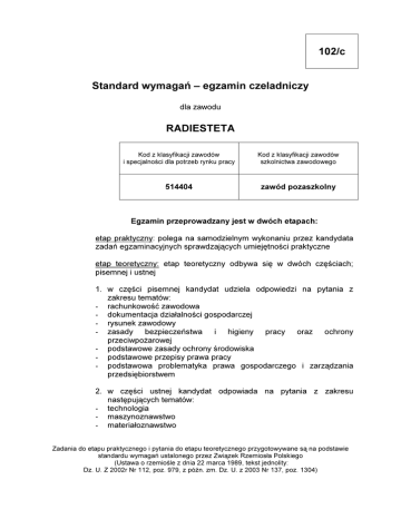 1 0 2 /c S ta n d a r d w y m a g a ń –e g z a m in c z e la d n ic z y dla zawodu R A D IE S T E T A Kod z klasyfikacji zawodów i sp e cjaln oś ci dla p ot r ze b r yn ku p r acy 514404 Kod z klasyfikacji zawodów szkoln ict wa zawodowe g o z a w ó d p o z a s z k o ln y E g z a m in p r z e p r o w a d z a n y je s t w d w ó c h e ta p a c h : e t ap p r ak t y c zn y : p ole g a n a s am odzi e ln y m wy k on an i u p r ze z k an dy dat a zadań e g zam i n ac y j n y c h s p r awdzaj ą c y c h um i e j ę t n oś c i p r ak t y c zn e e t ap t e or e t y c zn y : e t ap p i s e m n e j i us t n e j t e or e t y c zn y odb y wa s i ę w dwó c h c zę ś c i ac h ; 1 . w c zę ś c i p i s e m n e j k an dy dat udzi e la odp owi e dzi n a p y t an i a z zak r e s u t e m at ó w: - r ac h un k owoś ć zawodowa - dok um e n t ac j a dzi ał aln oś c i g os p odar c ze j - r y s un e k zawodowy - zas ady b e zp i e c ze ń s t wa i h ig ie n y p r ac y or az oc h r on y p r ze c i wp oż ar owe j - p ods t awowe zas ady oc h r on y ś r odowi s k a - p ods t awowe p r ze p i s y p r awa p r ac y - p ods t awowa p r ob le m at y k a p r awa g os p odar c ze g o i zar zą dzan i a p r ze ds i ę b i or s t we m 2 . w c zę ś c i us t n e j k an dy dat n as t ę p uj ą c y c h t e m at ó w: - t e c h n olog i a - m as zy n ozn aws t wo - m at e r i ał ozn aws t wo Z adan ia do e t ap u p r akt yczn e g o i p yt an ia do e t ap u t e or e st an dar du wym ag ań u st alon e g o p r ze z Z ( U st awa o r ze m ioś le z dn ia 2 2 m ar D z. U . Z 2 0 0 2 r N r 1 1 2 , p oz. 9 7 9 , z p óź n . zm . odp owi ada n a p y t an i a z zak r e s u t yczn wią ze ca 1 9 D z. U e g op k R ze 8 9 , te . z2 0 r zyg ot owywan e są n a p odst awie m iosł a P olskie g o kst je dn olit y: 0 3 N r 1 3 7 , p oz. 1 3 0 4 ) Z a w ó d : Radiesteta I. Etap teoretyczny (część pisemna i ustna) egzaminu obejmuje: Z ak r es w iado m o ś c i i u m iej ę tn o ś c i w ł aś c iw y c h z aw o dz ie dl a k w al if ik ac j i w K a n d y d a t p o w in ie n u m ie ć : 1. C z y t a ć z e z r o z u m ie n ie m in fo r m a c je p r z e d s ta w io n e w fo r m ie o p is u , in s tr u k c ji, r y s u n k ó w , s z k ic ó w , w y k r e s ó w , d o k u m e n ta c ji te c h n ic z n e j i te c h n o lo g ic z n e j, w s z c z e g ó ln o ś c i: 1.1. 1.2 . 1.3 . 1.4 . 1.5 . 1.6 . 1.7 . 1.8 . 1.9 . 1.10 . 1.11. 1.12 . 1.13 . 1.14 . 1.15 . r o z r ó ż n ia ć r o d z a je e k s p e r ty z r a d ie s te z y jn y c h ; s t o s o w a ć n a z w y i p o j ę c i a o bo w i ą z u j ą c e w r a d i e s t e z j i ; r o z r ó ż n ia ć m e to d y i te c h n ik i w y k o n y w a n ia p r a c r a d ie s te z y jn y c h ; ro z p o z n a w a ć s tre fy z a bu r z e ń g e o p a ty c z n y c h w te r e n ie o tw a rty m i w p o m ie s z c z e n ia c h ; s p o r z ą d z a ć d o k u m e n ta c ję e k s p e r ty z y r a d ie s te z y jn e j; r o z p o z n a w a ć z m ia n y z a c h o d z ą c e w s tr e f a c h g e o p a ty c z n y c h ; ro z p o z n a w a ć i k la s y f ik o w a ć p o z io m s z k o d liw o ś c i o d d z ia ły w a n ia s tre g e o p a t y c z n y c h n a m a t e r ię o ż y w io n ą i n ie o ż y w io n ą ; r o z r ó ż n i a ć e t a p y i z a k r e s p o w s t a w a n i a z a bu r z e ń g e o p a t y c z n y c h ; r o z r ó ż n i a ć m e t o d y i e t a p y n e u t r a l i z a c j i t y c h z a bu r z e ń ; r o z r ó ż n ia ć k o r z y s t n e i n ie k o r z y s t n e p a r a m e t r y m ie js c u ję ć w o d y p it n e j; r o z r ó ż n ia ć k o r z y s t n e i n ie k o r z y s t n e p a r a m e t r y m ie js c i u ję ć w o d y p r z e m y s ło w e j; r o z r ó ż n ia ć p r o c e s y z a c h o d z ą c e p o d c z a s p o w s ta w a n ia w a r s tw w o d o n o ś n y c h r ó ż n y c h u ję ć w o d y ; r o z r ó ż n ia ć i in te r p r e to w a ć d a n e i in f o r m a c je p r z e d s ta w io n e w p o s ta c i m a p w y k r e s ó w , m a p g e o d e z y jn y c h ,p r z e k r o jó w g e o lo g ic z n y c h ; r o z r ó ż n ia ć p r a w id ło w e w a r to ś c i ( n o r m y ) d o ty c z ą c e w o d y z d a tn e j d o p ic ia p r z e m y s ło w e j; r o z r ó ż n i a ć r o d z a j e s t u d n i i o d w i e r t ó w g ł ę bi n o w y c h . 2 . P r z e tw a r z a ć d a n e lic z b o w e i o p e r a c y jn e , w s z c z e g ó ln o ś c i: f i , , 2 .1. d o bi e r a ć r o d z a j i z a k r e s e k s p e r t y z y w z a le ż n o ś c i d o p r z e p r o w a d z o n e g o r o z p o z n a n ia w s tę p n e g o ; 2 .2 . w s k a z y w a ć m i e j s c a i s t r e f y z a bu r z e ń g e o p a t y c z n y c h w te r e n ie o tw a r ty m i p o m ie s z c z e n ia c h z a m k n ię ty c h ; 2 .3 . r o z p o z n a w a ć p rz y c z y n y z a bu r z e ń g e o p a ty c z n y c h w te r e n ie o tw a rty m i p o m ie s z c z e n ia c h z a m k n ię ty c h ; 2 .4 . s z a c o w a ć s t a n u i n t e n s y w n o ś c i i s z k o d l i w o ś c i p r o m i e n i o w a n i a s t r e f z a bu r z e ń n a p o d s ta w ie p r z e p r o w a d z o n e g o r o z p o z n a n ia ; 2 .5 . o k r e ś l a ć s z c z e g ó ł o w o m i e j s c a z a bu r z e ń g e o p a t y c z n y c h o d p o w i e d n i c h d o l o k a l i z a c j i u ję ć w o d y ; 2 .6 . k o r z y s t a ć z i n s t r u k c j i , m a p g e o d e z y j n y c h , p l a n ó w , s z k i c ó w ; 2 .7 . r o z p o z n a w a ć s y m bo l i k ę i o z n a c z e n i a r ó ż n y c h r o d z a j ó w m a p , s z k i c ó w , p l a n ó w , p r z e k r o jó w ; 2 .8 . u s t a l a ć k o le jn o ś ć p o s tę p o w a n ia p o d c z a s r o z p o z n a w a n ia s t r e f z a bu r z e ń g e o p a ty c z n y c h ; 2 .9 . d o br a ć t e c h n i k ę i m e t o d ę p r o w a d z e n i a e k s p e r t y z y ; 2 .10 . u s t a l a ć k o l e j n o ś ć p o s t ę p o w a n i a p o d c z a s w y k o n y w a n