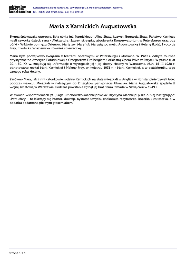 Konstanciński Dom Kultury, ul. Jaworskiego 18, 05-520 Konstancin-Jeziorna tel. +48 22 754 47 23, kom. +48 515 139 191 Maria z Karnickich Augustowska Słynna śpiewaczka operowa. Była córką inż. Karnickiego i Alice Shaw, kuzynki Bernarda Shaw. Państwo Karniccy mieli czwórkę dzieci: syna - Aleksandra (Szurę), skrzypka, absolwenta Konserwatorium w Petersburgu oraz trzy córki - Wiktorię po mężu Orfenow, Marię zw. Mary lub Marusią, po mężu Augustowską i Helenę (Lola), I voto de Frey, II voto ks. Wiaziemska, również śpiewaczkę. Maria była początkowo związana z teatrami operowymi w Petersburgu i Moskwie. W 1929 r. odbyła tournée artystyczne po Ameryce Południowej z Grzegorzem Fitelbergiem i orkiestrą Opera Prive w Paryżu. W prasie z lat 20. i 30. XX w. znajdują się informacje o występach jej i jej siostry Heleny w Warszawie. M.in. 15 III 1928 r. odnotowano recital Marii Karnickiej i Heleny Frey, w kwietniu 1931 r. - Marii Karnickiej, a w październiku tego samego roku Heleny. Zarówno Mary, jak i inni członkowie rodziny Karnickich na stałe mieszkali w Anglii a w Konstancinie bywali tylko podczas wakacji. Mieszkali w należącym do Emeryków pensjonacie Ukrainka. Maria Augustowska spędziła II wojnę światową w Warszawie. Podczas powstania zginął jej brat Szura. Zmarła w Szwajcarii w 1949 r. W swoich wspomnieniach pt. „Saga ulrichowsko-machlejdowska” Krystyna Machlejd pisze o niej następująco: „Pani Mary – to iskrzący się humor, dowcip, bystrość umysłu, znakomita recytatorka, kozerka i imitatorka, a w dodatku obdarzona pięknym głosem altem.” Strona 1 z 1 Powered by TCPDF (www.tcpdf.org)
