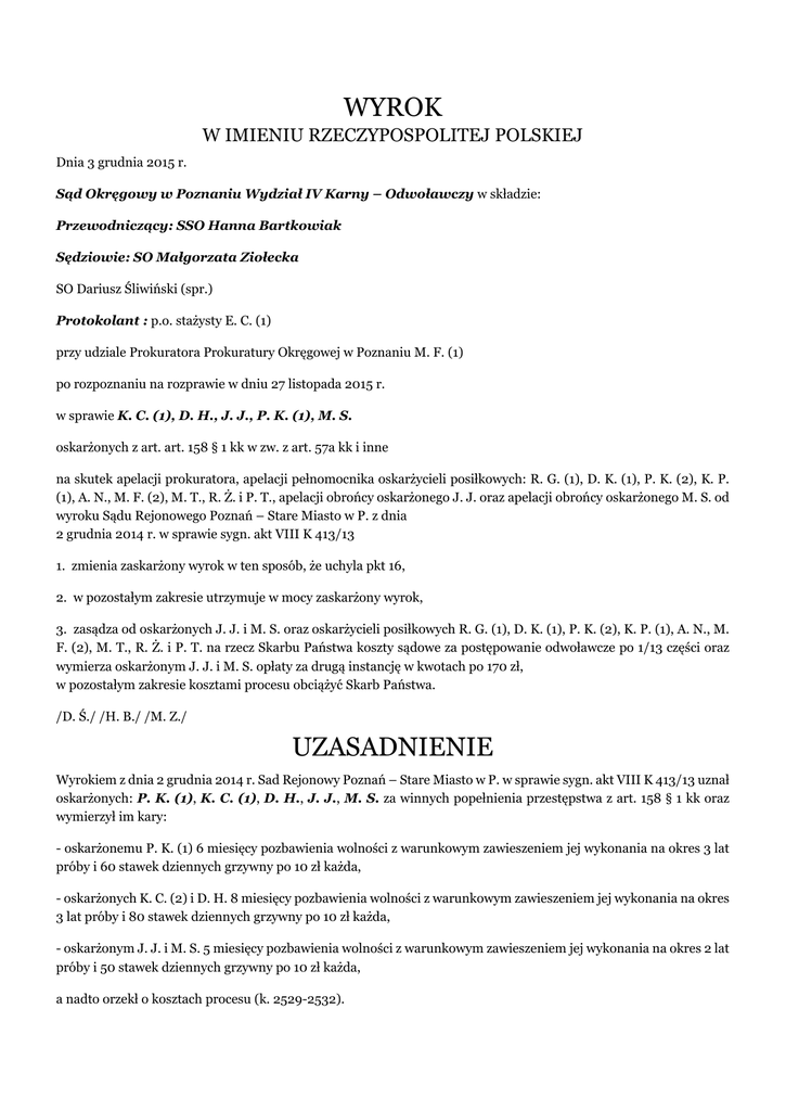 WYROK W IMIENIU RZECZYPOSPOLITEJ POLSKIEJ Dnia 3 grudnia 2015 r. Sąd Okręgowy w Poznaniu Wydział IV Karny – Odwoławczy w składzie: Przewodniczący: SSO Hanna Bartkowiak Sędziowie: SO Małgorzata Ziołecka SO Dariusz Śliwiński (spr.) Protokolant : p.o. stażysty E. C. (1) przy udziale Prokuratora Prokuratury Okręgowej w Poznaniu M. F. (1) po rozpoznaniu na rozprawie w dniu 27 listopada 2015 r. w sprawie K. C. (1), D. H., J. J., P. K. (1), M. S. oskarżonych z art. art. 158 § 1 kk w zw. z art. 57a kk i inne na skutek apelacji prokuratora, apelacji pełnomocnika oskarżycieli posiłkowych: R. G. (1), D. K. (1), P. K. (2), K. P. (1), A. N., M. F. (2), M. T., R. Ż. i P. T., apelacji obrońcy oskarżonego J. J. oraz apelacji obrońcy oskarżonego M. S. od wyroku Sądu Rejonowego Poznań – Stare Miasto w P. z dnia 2 grudnia 2014 r. w sprawie sygn. akt VIII K 413/13 1. zmienia zaskarżony wyrok w ten sposób, że uchyla pkt 16, 2. w pozostałym zakresie utrzymuje w mocy zaskarżony wyrok, 3. zasądza od oskarżonych J. J. i M. S. oraz oskarżycieli posiłkowych R. G. (1), D. K. (1), P. K. (2), K. P. (1), A. N., M. F. (2), M. T., R. Ż. i P. T. na rzecz Skarbu Państwa koszty sądowe za postępowanie odwoławcze po 1/13 części oraz wymierza oskarżonym J. J. i M. S. opłaty za drugą instancję w kwotach po 170 zł, w pozostałym zakresie kosztami procesu obciążyć Skarb Państwa. /D. Ś./ /H. B./ /M. Z./ UZASADNIENIE Wyrokiem z dnia 2 grudnia 2014 r. Sad Rejonowy Poznań – Stare Miasto w P. w sprawie sygn. akt VIII K 413/13 uznał oskarżonych: P. K. (1), K. C. (1), D. H., J. J., M. S. za winnych popełnienia przestępstwa z art. 158 § 1 kk oraz wymierzył im kary: - oskarżonemu P. K. (1) 6 miesięcy pozbawienia wolności z warunkowym zawieszeniem jej wykonania na okres 3 lat próby i 60 stawek dziennych grzywny po 10 zł każda, - oskarżonych K. C. (2) i D. H. 8 miesięcy pozbawienia wolności z warunkowym zawieszeniem jej wykonania na okres 3 lat próby i 80 stawek dziennych grzywny po 10 zł każda, - oskarżonym J. J. i M. S. 5 miesięcy pozbawienia wolności z warunkowym zawieszeniem jej wykonania na okres 2 lat próby i 50 stawek dziennych grzywny po 10 zł każda, a nadto orzekł o kosztach procesu (k. 2529-2532). Apelacje od powyższego wyroku wnieśli: - prokurator zaskarżając go w całości na niekorzyść wszystkich oskarżonych (k. 2652-2656), - pełnomocnik oskarżycieli posiłkowych R. G. (1), D. K. (1), P. K. (2), K. P. (1), A. N., M. F. (2), M. T., R. Ż. i P. T. zaskarżając go w całości na niekorzyść wszystkich oskarżonych (k. 2686-2703), - obrońca oskarżonego J. J. zaskarżając go w całości na korzyść swojego mandanta (k. 2657-2664), - obrońca oskarżonego M. S. zaskarżając go w całości na korzyść swojego mandanta (k. 2681-2684). Sąd Okręgowy zważył, co następuje: Wszystkie apelacje okazały się bezzasadne i nie zasługiwały na uwzględnienie. Zarzuty apelacji prokuratora oraz pełnomocnika oskarżycieli posiłkowych w zakresie oceny wiarygodności zeznań świadków S. R. oraz K. P. (2) oraz zeznań oskarżycieli posiłkowych były w znacznej części zbieżne, stąd też Sąd Okręgowy odniesie się do nich łącznie. Jeżeli chodzi o przyczynę formalnego zgłoszenia wniosku dowodowego o przesłuchanie w charakterze świadków S. R. i K. P. (2) dopiero w postępowaniu sądowym nie sposób podzielić zapatrywania skarżącego, iż okoliczność ta może podważać wiarygodność zeznań ww. osób. Odwołując się do zasad doświadczenia życiowego nie wydaje się nieprawdopodobne, aby oskarżony M. S., nie mając wcześniej żadnych kontaktów z organami postępowania przygotowawczego, występując początkowo bez ustanowionego obrońcy, nie potrafił zadbać o to, by zgłaszany przez niego już na tym etapie wniosek o przesłuchanie S. R. i K. P. (2) znalazł się w protokole czynności procesowych przeprowadzonych z jego udziałem. Osoba bez wiedzy i doświadczenia prawniczego może taką okoliczność przeoczyć i ma prawo zakładać, że wszystko co oświadczy zostanie zapisane i nie ma potrzeby weryfikować materiałów postępowania pod tym kątem przed jego ukończeniem. Stąd też z faktu formalnego zgłoszenia wniosku o przesłuchanie S. R. i K. P. (2) dopiero na etapie postępowania sądowego trudno zasadnie wywodzić uzasadnione podejrzenia, iż zeznawały one nieszczerze, będąc wcześnie do swojej roli przygotowanymi. Warto przypomnieć, iż rozprawa przed Sądem I instancji jest właściwym czasem przeprowadzania postępowania dowodowego w sprawie karnej. Strona postępowania, a zwłaszcza oskarżony korzystając z przysługującego mu prawa do obrony, nie ma obowiązku składania wszelkich możliwych wniosków dowodowych już postępowaniu przygotowawczym. Stąd też nawet w przypadku celowego zrezygnowania z przysługującej jej inicjatywy dowodowej w postępowaniu przygotowawczym w oczekiwaniu na postępowanie przed sądem I instancji co najmniej nie na miejscu wydaje się podejrzenie braku wiarygodności źródeł dowodowych ujawnianych dopiero w postępowaniu sądowym. Nie sposób zgodzić się również z prokuratorem, iż S. R. i K. P. (2) nie mogły pamiętać po dwóch latach od zdarzenia jego szczegółów, w tym prawidłowo rozpoznać jego uczestników i opisać sposób ich zaangażowania w zajście. W tym miejscu warto zauważyć, iż również oskarżyciele posiłkowi składając zeznania po dwóch latach od zdarzenia wskazywali na okoliczności, o których nie wspominali w swoich pierwszych zeznaniach. Zatem tożsamy zarzut można by podnieść pod adresem wiarygodności ich zeznań, czego skarżący zdaje się nie dostrzegać, utrzymując, że zeznania pokrzywdzonych były spójne i konsekwentne i co do nich żadne wątpliwości w przedmiocie wiarygodności nie występowały. Poza tym w niniejszej sprawie nie ujawniono żadnych okoliczności wskazujących na przygotowanie się świadków S. R