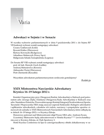 VVaria Adwokaci w Sejmie i w Senacie W wyniku wyborów parlamentarnych w dniu 9 października 2011 r. do Sejmu RP VII kadencji wybrani zostali następujący adwokaci: Cezary Grabarczyk (Łódź) Ryszard Kalisz (Warszawa) Bartosz Kownacki (Bydgoszcz) Arkadiusz Mularczyk (Nowy Sącz) Małgorzata Sekuła-Szmajdzińska (Legnica) Do Senatu RP VIII wybrani zostali następujący adwokaci: prof. dr hab. Henryk Cioch (Lublin) Andrzej Matusiewicz (Krosno) Aleksander Pociej (Warszawa) Piotr Zientarski (Koszalin) Wszystkim adwokatom parlamentarzystom serdecznie gratulujemy! Redakcja XXIX Mistrzostwa Narciarskie Adwokatury Krynica 16–19 lutego 2012 r. Komitet Organizacyjny przy Okręgowej Radzie Adwokackiej w Kielcach pod patronatem adw. Jerzego Zięby, Dziekana Okręgowej Rady Adwokackiej w Kielcach oraz adw. Stanisława Estreicha, Przewodniczącego Komisji Integracji Środowiskowej Sportu, Turystyki i Wypoczynku NRA mają zaszczyt zaprosić Koleżanki i Kolegów adwokatów i aplikantów adwokackich, członków ich rodzin, narciarzy i sympatyków sportów zimowych do udziału w XXIX Mistrzostwach Narciarskich Adwokatury, które odbędą się w dniach 16–19 lutego 2012 r. w Krynicy-Zdroju. Honorowy patronat nad Mistrzostwami objął Prezes NRA adw. Andrzej Zwara. Uczestnicy Mistrzostw będą zakwaterowani w Hotelu Krynica**** (www.hotelkrynica.eu) w Krynicy-Zdroju, ul. Park Sportowy 3. Hotel Krynica Conference & Spa to czterogwiazdkowy obiekt zlokalizowany w sa- 294 11–12/2011 Varia mym centrum przepięknego uzdrowiska, jakim jest Krynica-Zdrój. W cenie pobytu w hotelu zawarte jest nieograniczone korzystanie z basenu z przeciwprądem, jacuzzi, kompleksu saun i fitness studio, a także bezprzewodowy Internet na terenie całego hotelu. Dla gości monitorowany parking w cenie pobytu. W bezpośrednim sąsiedztwie hotelu znajduje się hala lodowiska oraz wyciąg narciarski Henryk. Zawody narciarskie w slalomie gigancie zostaną rozegrane w dniu 17 lutego 2012 r. na Jaworzynie – potwierdzona rezerwacja trasy narciarskiej nr II A, natomiast zawody w biegu narciarskim, w zależności od warunków śniegowych, w Krynicy bądź w jej okolicach. Powrót do Katynia „Człowiek płacze nad ich losem, reportażysta go opisuje” – pisze Barbara Stanisławczyk o swojej książce Ostatni krzyk, wydanej przez Dom Wydawniczy Rebis, 2011. Nie jest to książka polityczna. Autorka nie zajmuje się przyczynami katastrofy. Oddajmy znowu jej głos: „To też opowieść (…) o wręcz metafizycznych zdarzeniach w życiu bohaterów i w moim podczas zbierania materiałów do książki. Bo sny i przeczucia są tak samo ważne jak twarde fakty”. Kluczem do książki jest czas. W pierwszej części spotykamy dziesięciu bohaterów tej opowieści tuż przed wylotem do Smoleńska w kwietniu 2010 roku. W ich życie nie wkracza ani historia, ani polityka. Oni po prostu przygotowują się do podróży. Dla każdego z nich jest to bardzo ważny wyjazd. Jadą razem z prezydentem na groby swoich bliskich. Pakują się, jedzą kolację, szykują do drogi. Uściślają fakty z rodzinnych historii. Oni nie wiedzą… My już wiemy więcej… Także dla Marii Kaczyńskiej jest to prywatna podróż, bo i jej rodzinę naznaczyła śmierć zamordowanych w Katyniu. Jedzie z pamięcią o swoich dwóch stryjach. Jeden z nich to Witold Mackiewicz, brat ojca. W drugiej części książki autorka cofa nas o 70 lat. Jesteśmy na progu wojny, poznajemy rodziny i ich wojenne losy. A także te powojenne, gdy słowa „Katyń” głośno nie wypowiadano. Zbrodnia katyńska naznaczona była tajemnicą rzutującą na życie. Tym z katyńskich rodzin często trudno było znaleźć pracę czy dostać się na studia. Dopiero w wolnej Polsce, po 1989 roku, zmienia się rzeczywistość, gdy otwarcie można będzie mówić o Katyniu. Trzecia część książki to znowu 10 kwietnia 2010 roku. Czekamy na tych, którzy wsiedli do prezydenckiego samolotu. Zasiadamy przed ekranami telewizorów, aby zobaczyć relację z katyńskiego lasu. Może zobaczymy naszych bliskich? Dramat się dopełnia. I tak historia zatacza koło. W książce nie ma śledztwa, spiskowych teorii. Nie ma tu patosu. Są fakty. Autorka układa reporterski zapis z opowieści, na które czeka i które przychodzą do niej, tak jakby właśnie to ją chciały odnaleźć. Możemy przeczytać o losach Franciszka Gajowniczka, za którego życie oddał w Oświęcimiu ojciec Kolbe. O codzienności rodzin zesłanych do Kazachstanu. Barbara Stanisławczyk z wielkim kunsztem i zegarmistrzowską precyzją buduje tę opowieść o ludzkim życiu i bezwzględności historii. Od Katynia do Smoleńska. Historie dramatów i miłości. Agnieszka Metelska 295