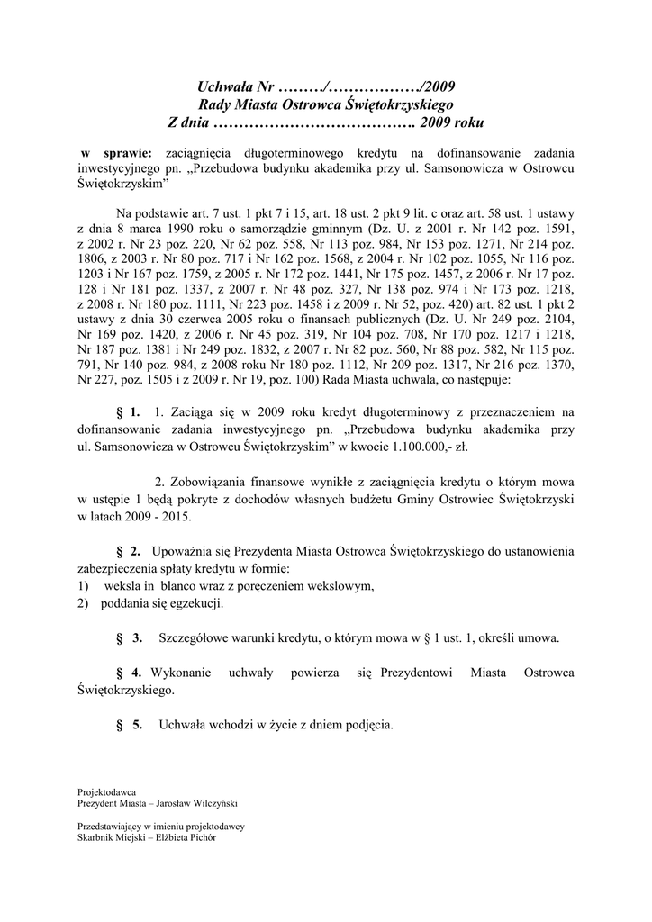 Uchwała Nr ………/………………/2009 Rady Miasta Ostrowca Świętokrzyskiego Z dnia …………………………………. 2009 roku w sprawie: zaciągnięcia długoterminowego kredytu na dofinansowanie zadania inwestycyjnego pn. „Przebudowa budynku akademika przy ul. Samsonowicza w Ostrowcu Świętokrzyskim” Na podstawie art. 7 ust. 1 pkt 7 i 15, art. 18 ust. 2 pkt 9 lit. c oraz art. 58 ust. 1 ustawy z dnia 8 marca 1990 roku o samorządzie gminnym (Dz. U. z 2001 r. Nr 142 poz. 1591, z 2002 r. Nr 23 poz. 220, Nr 62 poz. 558, Nr 113 poz. 984, Nr 153 poz. 1271, Nr 214 poz. 1806, z 2003 r. Nr 80 poz. 717 i Nr 162 poz. 1568, z 2004 r. Nr 102 poz. 1055, Nr 116 poz. 1203 i Nr 167 poz. 1759, z 2005 r. Nr 172 poz. 1441, Nr 175 poz. 1457, z 2006 r. Nr 17 poz. 128 i Nr 181 poz. 1337, z 2007 r. Nr 48 poz. 327, Nr 138 poz. 974 i Nr 173 poz. 1218, z 2008 r. Nr 180 poz. 1111, Nr 223 poz. 1458 i z 2009 r. Nr 52, poz. 420) art. 82 ust. 1 pkt 2 ustawy z dnia 30 czerwca 2005 roku o finansach publicznych (Dz. U. Nr 249 poz. 2104, Nr 169 poz. 1420, z 2006 r. Nr 45 poz. 319, Nr 104 poz. 708, Nr 170 poz. 1217 i 1218, Nr 187 poz. 1381 i Nr 249 poz. 1832, z 2007 r. Nr 82 poz. 560, Nr 88 poz. 582, Nr 115 poz. 791, Nr 140 poz. 984, z 2008 roku Nr 180 poz. 1112, Nr 209 poz. 1317, Nr 216 poz. 1370, Nr 227, poz. 1505 i z 2009 r. Nr 19, poz. 100) Rada Miasta uchwala, co następuje: § 1. 1. Zaciąga się w 2009 roku kredyt długoterminowy z przeznaczeniem na dofinansowanie zadania inwestycyjnego pn. „Przebudowa budynku akademika przy ul. Samsonowicza w Ostrowcu Świętokrzyskim” w kwocie 1.100.000,- zł. 2. Zobowiązania finansowe wynikłe z zaciągnięcia kredytu o którym mowa w ustępie 1 będą pokryte z dochodów własnych budŜetu Gminy Ostrowiec Świętokrzyski w latach 2009 - 2015. § 2. UpowaŜnia się Prezydenta Miasta Ostrowca Świętokrzyskiego do ustanowienia zabezpieczenia spłaty kredytu w formie: 1) weksla in blanco wraz z poręczeniem wekslowym, 2) poddania się egzekucji. § 3. Szczegółowe warunki kredytu, o którym mowa w § 1 ust. 1, określi umowa. § 4. Wykonanie Świętokrzyskiego. § 5. uchwały powierza się Prezydentowi Uchwała wchodzi w Ŝycie z dniem podjęcia. Projektodawca Prezydent Miasta – Jarosław Wilczyński Przedstawiający w imieniu projektodawcy Skarbnik Miejski – ElŜbieta Pichór Miasta Ostrowca UZASADNIENIE Realizacja zadania inwestycyjnego pn. „Przebudowa budynku akademika przy ul. Samsonowicza w Ostrowcu Świętokrzyskim” jest zaplanowana w budŜecie miasta na lata 2008-2010 (Załącznik nr 3 do uchwały budŜetowej „Limity wydatków na wieloletnie programy inwestycyjne w latach 2009-2015” dział 700 rozdział 70095 pozycja 2.1). Kredyt na tą inwestycję został ujęty w prognozie długu budŜetu na lata 2009-2023. Prognoza długu została pozytywnie zaopiniowana przez Regionalną Izbę Obrachunkową. Łączny planowany koszt inwestycji wyniesie 3.796.665 zł. Źródła finansowania przedstawiają się następująco: - środki własne budŜetu Gminy – 2.115.163,00 zł, - środki z kredytu – 1.100.000,00 zł, - dotacja z Funduszu Dopłat Finansowego Wsparcia Budownictwa Socjalnego (umowa z dnia 17.04.2009 roku) – 581.502,00 zł. Bank kredytujący zostanie wyłoniony w drodze przetargu nieograniczonego.
