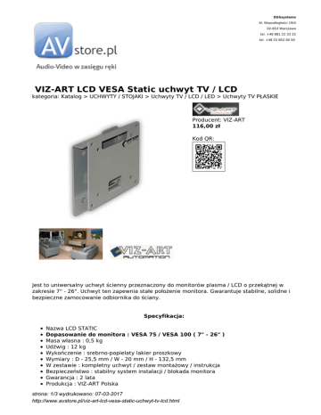 DSSsystems Al. Niepodległości 19/4 02-653 Warszawa tel. +48 881 22 33 22 tel. +48 22 852 00 50 VIZ-ART LCD VESA Static uchwyt TV / LCD kategoria: Katalog > UCHWYTY / STOJAKI > Uchwyty TV / LCD / LED > Uchwyty TV PŁASKIE Producent: VIZ-ART 116,00 zł Kod QR: Jest to uniwersalny uchwyt ścienny przeznaczony do monitorów plasma / LCD o przekątnej w zakresie 7" - 26". Uchwyt ten zapewnia stałe położenie monitora. Gwarantuje stabilne, solidne i bezpieczne zamocowanie odbiornika do ściany. Specyfikacja: Nazwa LCD STATIC Dopasowanie do monitora : VESA 75 / VESA 100 ( 7" - 26" ) Masa własna : 0,5 kg Udźwig : 12 kg Wykończenie : srebrno-popielaty lakier proszkowy Wymiary : D - 25,5 mm / W - 20 mm / H - 132,5 mm W zestawie : kompletny uchwyt / zestaw montażowy / instrukcja Bezpieczeństwo : stabilny system instalacji / blokada monitora Gwarancja : 2 lata Produkcja : VIZ-ART Polska strona: 1/3 wydrukowano: 07-03-2017 http://www.avstore.pl/viz-art-lcd-vesa-static-uchwyt-tv-lcd.html POBIERANIE: Karta Katalogowa - Pobierz Instrukcja instalacji - Pobierz Uchwyt LCD STATIC firmy VIZ-ART pozwala odkryć siłę obrazu z monitorem LCD w wielu miejscach. Wprowadź ulubione filmy w każde miejsce Twojego domu, a salon kąpielowy przemień w Kino dla dwojga. Takie możliwości zapewnia teraz uchwyt LCD STATIC. Jest to uniwersalny uchwyt ścienny przeznaczony do monitorów plasma / LCD o przekątnej w zakresie 7" - 26". Uchwyt ten zapewnia stałe położenie monitora. Gwarantuje stabilne, solidne i bezpieczne zamocowanie odbiornika do ściany. Oryginalny LCD STATIC zapewnia sukces każdej realizacji. LCD STATIC to najlepszy wybór. Trwałość i estetyka wykonania potwierdzona certyfikatem ISO. Uchwyt LCD STATIC wybierany jest przez oczekujących trwałości oraz komfortu i gwrantowanego rozwiązania. LCD STATIC powstał dla szanujących swój czas. LCD STATIC z systemem stabilnego montażu i optymalnych wymiarach zdobył uznanie Architektów. Zalecany do systemów VESA 75 i VESA 100. Wybierz najlepszy dla siebie monitor, a uchwyt LCD STATIC gwarantuje łatwość instalacji w wybranym przez Ciebie wnętrzu. Przeznaczenie : salony kąpielowe / kluby fitness / jadalnie / restauracje / pokoje gościnne / bazy szkoleniowe / gabinety / kliniki strona: 2/3 wydrukowano: 07-03-2017 http://www.avstore.pl/viz-art-lcd-vesa-static-uchwyt-tv-lcd.html Wszystkie podane ceny (zawierają podatek VAT 23%). Klientów zainteresowanych większymi zakupami lub współpracą prosimy o kontakt: (22) 852 00 50, lub [email protected] Wszystkie loga oraz znaki firmowe wykorzystane w opisach na stronie AVstore.pl . należą do ich prawnych właścicieli i mają wyłącznie charakter informacyjny strona: 3/3 wydrukowano: 07-03-2017 http://www.avstore.pl/viz-art-lcd-vesa-static-uchwyt-tv-lcd.html