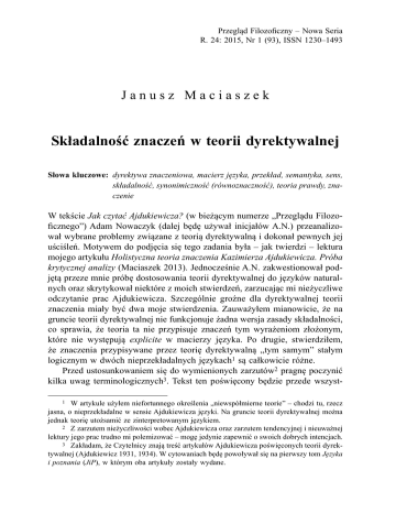 Przegląd Filozoficzny – Nowa Seria R. 24: 2015, Nr 1 (93), ISSN 1230–1493 Janusz Maciaszek Składalność znaczeń w teorii dyrektywalnej Słowa kluczowe: dyrektywa znaczeniowa, macierz języka, przekład, semantyka, sens, składalność, synonimiczność (równoznaczność), teoria prawdy, znaczenie W tekście Jak czytać Ajdukiewicza? (w bieżącym numerze „Przeglądu Filozoficznego”) Adam Nowaczyk (dalej będę używał inicjałów A.N.) przeanalizował wybrane problemy związane z teorią dyrektywalną i dokonał pewnych jej uściśleń. Motywem do podjęcia się tego zadania była – jak twierdzi – lektura mojego artykułu Holistyczna teoria znaczenia Kazimierza Ajdukiewicza. Próba krytycznej analizy (Maciaszek 2013). Jednocześnie A.N. zakwestionował podjętą przeze mnie próbę dostosowania teorii dyrektywalnej do języków naturalnych oraz skrytykował niektóre z moich stwierdzeń, zarzucając mi nieżyczliwe odczytanie prac Ajdukiewicza. Szczególnie groźne dla dyrektywalnej teorii znaczenia miały być dwa moje stwierdzenia. Zauważyłem mianowicie, że na gruncie teorii dyrektywalnej nie funkcjonuje żadna wersja zasady składalności, co sprawia, że teoria ta nie przypisuje znaczeń tym wyrażeniom złożonym, które nie występują explicite w macierzy języka. Po drugie, stwierdziłem, że znaczenia przypisywane przez teorię dyrektywalną „tym samym” stałym logicznym w dwóch nieprzekładalnych językach1 są całkowicie różne. Przed ustosunkowaniem się do wymienionych zarzutów2 pragnę poczynić kilka uwag terminologicznych3. Tekst ten poświęcony będzie przede wszyst1 W artykule użyłem niefortunnego określenia „niewspółmierne teorie” – chodzi tu, rzecz jasna, o nieprzekładalne w sensie Ajdukiewicza języki. Na gruncie teorii dyrektywalnej można jednak teorię utożsamić ze zinterpretowanym językiem. 2 Z zarzutem nieżyczliwości wobec Ajdukiewicza oraz zarzutem tendencyjnej i nieuważnej lektury jego prac trudno mi polemizować – mogę jedynie zapewnić o swoich dobrych intencjach. 3 Zakładam, że Czytelnicy znają treść artykułów Ajdukiewicza poświęconych teorii dyrektywalnej (Ajdukiewicz 1931, 1934). W cytowaniach będę powoływał się na pierwszy tom Języka i poznania (JiP), w którym oba artykuły zostały wydane. 28 Janusz Maciaszek kim problemowi składalności znaczeń w teorii dyrektywalnej. Ponieważ składalność może przybierać odmienne postaci w różnych semantykach, będę używał terminów „semantyka odniesieniowa” oraz „semantyka nieodniesieniowa”. Przez semantykę odniesieniową można rozumieć teorię odniesienia (denotacji, ekstensji) wyrażeń językowych lub teorię języka, która taką teorię zakłada. Semantykami w tym sensie byłyby Arystotelesa teoria znaku językowego, asocjacjonizm, teoria konotacyjna Milla, weryfikacjonistyczna teoria znaczenia, teoria Fregego oraz przyczynowa teoria nazywania (Kripkego i Putnama). Ponieważ termin „semantyka” może być również rozumiany po prostu jako teoria znaczenia, to te teorie znaczenia, które nie posługują się pojęciem odniesienia, można nazwać semantykami nieodniesieniowymi. Można do nich zaliczyć teorię znaczenia Quine’a sformułowaną w kategoriach podręcznika przekładu oraz teorię znaczenia Donalda Davidsona. W drugim sensie „semantyka odniesieniowa” oznacza każdą teorię znaczenia, która znaczenia reifikuje, tj. utożsamia je z jakimiś bytami. Semantykami odniesieniowymi w drugim sensie są wszystkie poprzednio wymienione semantyki, za wyjątkiem weryfikacjonistycznej teorii znaczenia oraz teorii Kripkego-Putnama, które nie posługują się explicite pojęciem znaczenia, lecz raczej pojęciem sensowności (meaningfulness). Wymienione wcześniej teorie nieodniesieniowe w sensie pierwszym, są również nieodniesieniowe w sensie drugim. Dyrektywalna teoria znaczenia jest powszechnie uznawana za semantykę nieodniesieniową w pierwszym z wymienionych sensów. Pewne kontrowersje może natomiast wzbudzać to, czy jest to semantyka nieodniesieniowa w sensie drugim, co będzie przedmiotem dalszej dyskusji. Teoria dyrektywalna a języki naturalne Dyrektywalna teoria znaczenia została zbudowana dla języków teorii naukowych. Języki te można traktować jako wyidealizowane modele fragmentów języka naturalnego. W modelach takich pomija się z jednej strony całe klasy wyrażeń nieistotnych dla teorii (np. wyrażenia intensjonalne lub performatywne), a z drugiej strony czyni się cały szereg założeń upraszczających (np. zakłada się jednoznaczność i brak nieostrości wyrażeń). A zatem teoria znaczenia języka teorii naukowej nie różni się zasadniczo od teorii znaczenia języka naturalnego, gdyż te ostatnie opisują również wyidealizowane modele fragmentów tego języka. Ajdukiewicz poświęcił sporo miejsca na uwydatnienie różnic między językami teorii naukowych a językami naturalnymi, wskazując jednocześnie na te cechy języka naturalnego, których jego teoria nie jest w stanie opisać. Nie ma Składalność znaczeń w teorii dyrektywalnej 29 jednak podstaw do stwierdzenia, że teoria dyrektywalna nie może, po wprowadzeniu modyfikacji i uzupełnień, pełnić funkcji teorii znaczenia języka naturalnego. Ajdukiewicz posługiwał się wieloma przykładami zaczerpniętymi z języka naturalnego, co przypomina sytuację przyrodnika, który stara się zbudować bliski fizycznej rzeczywistości model dla swojej teorii, starannie wybierając te jej aspekty, które warto zachować w opisywanym modelu. A zatem problem dotyczy faktycznie tego, czy w teorii dyrektywalnej nie zostały pominięte jakieś bardzo istotne i interesujące aspekty języka naturalnego4. Moim celem było przetestowanie teorii dyrektywalnej pod tym właśnie kątem. Wyuczalność języka Wydaje się, że w przypadku języka naturalnego niezwykle istotnym jego aspektem jest wyuczalność. Teoria znaczenia musi być t
