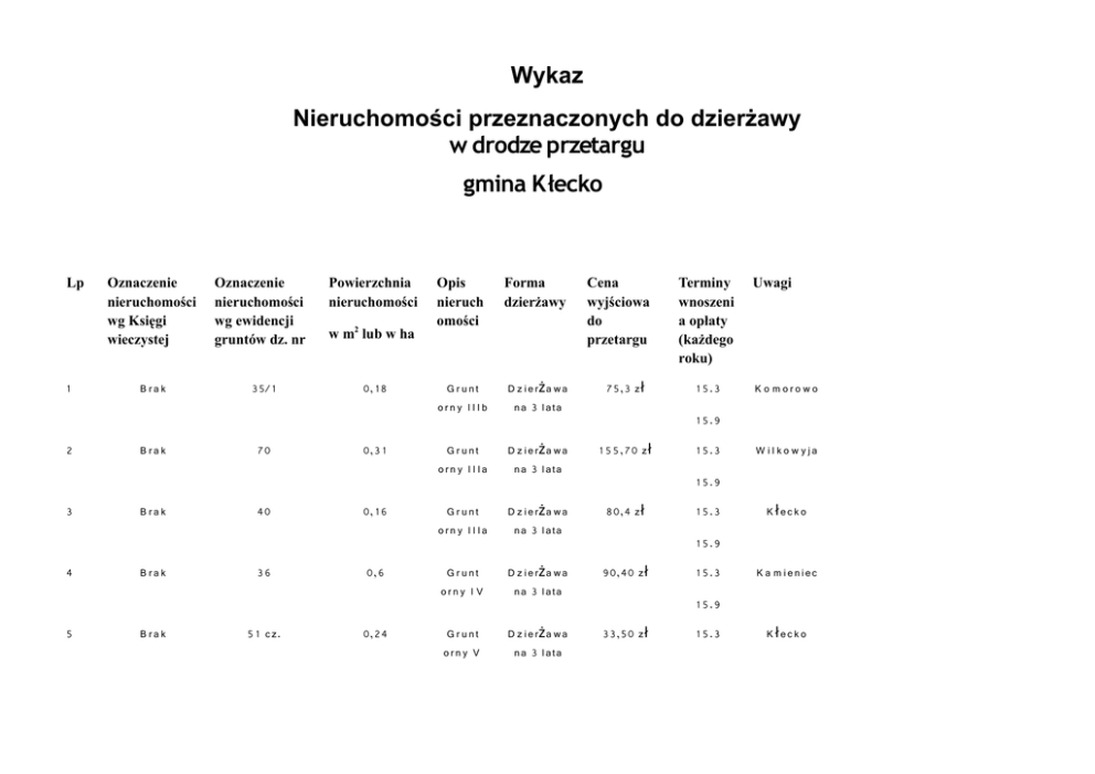 Wykaz Nieruchomości przeznaczonych do dzierżawy w drodze przetargu gmina Kłecko Lp 1 2 3 4 5 Oznaczenie nieruchomości wg Księgi wieczystej Oznaczenie nieruchomości wg ewidencji gruntów dz. nr Powierzchnia nieruchomości B rak 35/1 0, 1 8 B rak B rak B rak B rak 70 40 36 5 1 c z. w m2 lub w ha 0,3 1 0, 1 6 0,6 0,24 Opis nieruch omości Forma dzierżawy Cena wyjściowa do przetargu G runt orny IIIb D z i e rż a w a n a 3 l ata 75,3 zł G runt orn y I I Ia D z i e rż a w a n a 3 l ata 1 5 5,70 zł G runt orn y I I Ia D z i e rż a w a n a 3 l ata 80,4 zł G runt orny I V D z i e rż a w a n a 3 l ata 90,40 zł G runt orny V D z i e rż a w a n a 3 l ata 33,50 zł Terminy wnoszeni a opłaty (każdego roku) 1 5.3 Uwagi K o moro wo 1 5.9 1 5.3 W il ko w yja 1 5.9 1 5.3 K łec ko 1 5.9 1 5.3 K a m ieniec 1 5.9 1 5.3 K łec ko 1 5.9 6 7 8 B rak B rak B rak 37 c z. 764 408 c z. 0,2552 0,30 0,38 G runt orny I V D z i e rż a w a n a 3 l ata 33,5 zł G runt orny II D z i e rż a w a n a 3 l ata 1 6 7,4 G runt orny IIIb 0, 1 8 D z i e rż a w a n a 3 l ata 1 2 5,6 D z i e rż a w a n a 3 l ata 88,20 Z ł 1 5.3 K łec ko 1 5.9 1 5.3 K łec ko 1 5.9 1 5.3 K łec ko 1 5.9 I V b 0.20 9 B rak 534 0,6328 G runt orny V 1 5.3 1 5.9 K łec ko Wykaz Nieruchomości przeznaczonych do dzierżawy w drodze przetargu gmina Kłecko