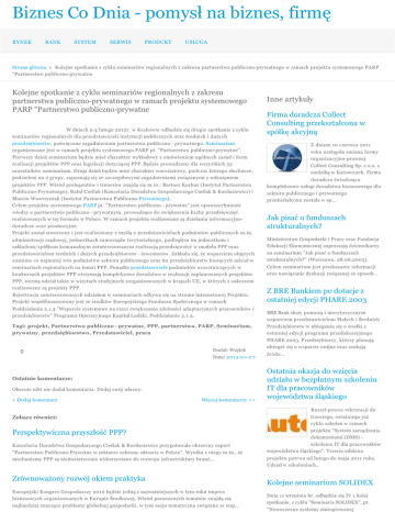 Biznes Co Dnia - pomysł na biznes, firmę RYNEK BANK SYSTEM SERWIS PRODUKT USŁUGA Strona główna » Kolejne spotkanie z cyklu seminariów regionalnych z zakresu partnerstwa publiczno-prywatnego w ramach projektu systemowego PARP "Partnerstwo publiczno-prywatne Kolejne spotkanie z cyklu seminariów regionalnych z zakresu partnerstwa publiczno-prywatnego w ramach projektu systemowego PARP "Partnerstwo publiczno-prywatne W dniach 2-3 lutego 2012r. w Krakowie odbędzie się drugie spotkanie z cyklu seminariów regionalnych dla przedstawicieli instytucji publicznych oraz średnich i dużych Inne artykuły Firma doradcza Collect Consulting przekształcona w spółkę akcyjną przedsiębiorstw, poświęcone zagadnieniom partnerstwa publiczno - prywatnego. Seminarium organizowane jest w ramach projektu systemowego PARP pt. "Partnerstwo publiczno-prywatne". Z dniem 10 czerwca 2011 roku nastąpiła zmiana formy organizacyjno-prawnej Pierwszy dzień seminarium będzie mieć charakter wykładowy z omówieniem ogólnych zasad i form realizacji projektów PPP oraz legislacji dotyczącej PPP. Będzie prowadzony dla wszystkich 55 uczestników seminarium. Drugi dzień będzie mieć charakter warsztatowy, podczas którego słuchacze, podzieleni na 2 grupy, zapoznają się ze szczegółowymi zagadnieniami związanymi z wdrażaniem projektów PPP. Wśród prelegentów i trenerów znajdą się m.in.: Bartosz Korbus (Instytut Partnerstwa Publiczno-Prywatnego), Rafal Cieślak (Kancelaria Doradztwa Gospodarczego Cieślak & Kordasiewicz) i Marcin Wawrzyniak (Instytut Partnerstwa Publiczno-Prywatnego). Celem projektu systemowego PARP pt. "Partnerstwo publiczno - prywatne" jest upowszechnienie wiedzy o partnerstwie publiczno - prywatnym, prowadzące do zwiększenia liczby przedsięwzięć realizowanych w tej formule w Polsce. W ramach projektu realizowane są działania informacyjnodoradcze oraz promocyjne. Projekt został stworzony i jest realizowany z myślą o przedstawicielach podmiotów publicznych m.in. Collect Consulting Sp. z o.o. z siedzibą w Katowicach. Firma doradcza świadcząca kompleksowe usługi doradztwa biznesowego dla sektora publicznego i prywatnego przekształcona została w sp… Jak pisać o funduszach strukturalnych? administracji rządowej, jednostkach samorządu terytorialnego, podległym im jednostkom i zakładom/spółkom komunalnym zainteresowanym realizacją przedsięwzięć w modelu PPP oraz Ministerstwo Gospodarki i Pracy oraz Fundacja Edukacji Ekonomicznej zapraszają dziennikarzy przedstawicielom średnich i dużych przedsiębiorstw - inwestorów. Zakłada się, że wsparciem objętych zostanie co najmniej 100 podmiotów sektora publicznego oraz 60 przedsiębiorstw biorących udział w na seminarium "Jak pisać o funduszach strukturalnych?" (Warszawa, 28.06.2005). seminariach regionalnych na temat PPP. Ponadto przedstawiciele podmiotów uczestniczących w konkursach projektów PPP otrzymają kompleksowe doradztwo w realizacji zaplanowanych projektów Celem seminarium jest przekazanie informacji oraz nawiązanie dyskusji związanej ze sposob… PPP, wezmą udział także w wizytach studyjnych zorganizowanych w krajach UE, w których z sukcesem realizowane są projekty PPP. Rejestracja zainteresowanych udziałem w seminariach odbywa się na stronie internetowej Projektu. Projekt współfinansowany jest ze środków Europejskiego Funduszu Społecznego w ramach Poddziałania 2.1.3 "Wsparcie systemowe na rzecz zwiększania zdolności adaptacyjnych pracowników i przedsiębiorstw" Programu Operacyjnego Kapitał Ludzki, Poddziałanie 2.1.3. Tagi: projekt, Partnerstwo publiczno - prywatne, PPP, partnerstwo, PARP, Seminarium, prywatny, przedsiębiorstwo, Przedstawiciel, praca 0 Dodał: Wojtek Data: 2012-0 1-2 7 Ostatnie komentarze: Obecnie nikt nie dodał komentarza. Dodaj swój własny. + Dodaj komentarz Więcej komentarzy >> Z BRE Bankiem po dotacje z ostatniej edycji PHARE 2003 BRE Bank służy pomocą i merytorycznym wsparciem przedstawicielom Małych i Średnich Przedsiębiorstw w ubieganiu się o środki z ostatniej edycji programu przedakcesyjnego PHARE 2003. Przedsiębiorcy, którzy planują ubiegać się o wsparcie unijne oraz szukają źróde… Ostatnia okazja do wzięcia udziału w bezpłatnym szkoleniu IT dla pracowników województwa śląskiego Ruszył proces rekrutacji do Zobacz również: trzeciego, ostatniego już cyklu szkoleń w ramach Perspektywiczna przyszłość PPP? projektu "System zarządzania dokumentami (DMS) - Kancelaria Doradztwa Gospodarczego Cieślak & Kordasiewicz przygotowała obszerny raport "Partnerstwo Publiczno-Prywatne w sektorze ochrony zdrowia w Polsce". Wynika z niego m.in., że mechanizmy PPP są niedostatecznie wykorzystane do rozwoju infrastruktury branż… Zrównoważony rozwój okiem praktyka Europejski Kongres Gospodarczy 2010 będzie jedną z najważniejszych w tym roku imprez biznesowych organizowanych w Europie Środkowej. Wśród poruszanych tematów znajdą się najbardziej znaczące problemy globalnej gospodarki, w tym sesja tematyczna związana ze wsp… szkolenia IT dla pracowników województwa śląskiego". Trzecia odsłona projektu potrwa od lutego do maja 2011 roku. Udział w szkoleniach… Kolejne seminarium SOLIDEX Dnia 11 września br. odbędzie się IV z kolei spotkanie, z cyklu "Seminaria SOLIDEX", pt. "Nowoczesne systemy zintegrowanej komunikacji jako element budowy przewagi Placówki medyczne w Polsce. Planowanie i realizacja konkurencyjnej." Zajęcia prowadzone są przez SOLIDnych EXpertów oraz naszych Partnerów w Nowe placówki medyczne nie są realizowane w Polsce zbyt często. W naszym kraju raczkują dopiero nowocze… projekty przeprowadzane w ramach partnerstwa publiczno-prywatnego (PPP).Pierwsza oparta o tego typu współpracę, pilotażowa placówka medyczna jest właśnie realizowan… Kolejne projekty EFS realizowane przez House of Skills Kolejne projekty EFS realizowane przez House of Skills Firma szkoleni