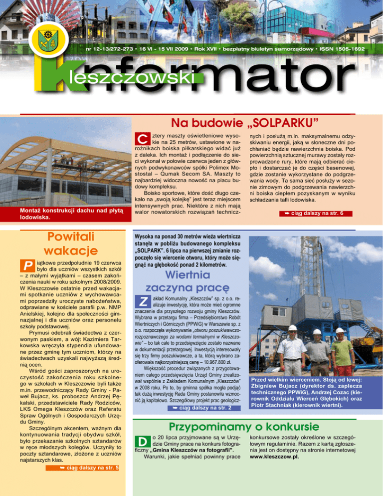 nr 12-13/272-273 • 16 VI - 15 VII 2009 • Rok XVII • bezpłatny biuletyn samorządowy • ISSN 1505-1692 Na budowie „SOLPARKU” C Montaż konstrukcji dachu nad płytą lodowiska. Powitali wakacje P iątkowe przedpołudnie 19 czerwca było dla uczniów wszystkich szkół – z małymi wyjątkami – czasem zakończenia nauki w roku szkolnym 2008/2009. W Kleszczowie ostatnie przed wakacjami spotkanie uczniów z wychowawcami poprzedziły uroczyste nabożeństwa, odprawiane w kościele parafii p.w. NMP Anielskiej, kolejno dla społeczności gimnazjalnej i dla uczniów oraz personelu szkoły podstawowej. Prymusi odebrali świadectwa z czerwonym paskiem, a wójt Kazimiera Tarkowska wręczyła stypendia ufundowane przez gminę tym uczniom, którzy na świadectwach uzyskali najwyższą średnią ocen. Wśród gości zaproszonych na uroczystość zakończenia roku szkolnego w szkołach w Kleszczowie byli także m.in. przewodniczący Rady Gminy - Paweł Bujacz, ks. proboszcz Andrzej Pękalski, przedstawiciele Rady Rodziców, LKS Omega Kleszczów oraz Referatu Spraw Ogólnych i Gospodarczych Urzędu Gminy. Szczególnym akcentem, ważnym dla kontynuowania tradycji obydwu szkół, było przekazanie szkolnych sztandarów w ręce młodszych kolegów. Uczyniły to poczty sztandarowe, złożone z uczniów najstarszych klas. å ciąg dalszy na str. 5 ztery maszty oświetleniowe wysokie na 25 metrów, ustawione w narożnikach boiska piłkarskiego widać już z daleka. Ich montaż i podłączenie do sieci wykonał w połowie czerwca jeden z głównych podwykonawców spółki Polimex Mostostal – Qumak Secom SA. Maszty to najbardziej widoczna nowość na placu budowy kompleksu. Boisko sportowe, które dość długo czekało na „swoją kolejkę” jest teraz miejscem intensywnych prac. Niektóre z nich mają walor nowatorskich rozwiązań technicz- nych i posłużą m.in. maksymalnemu odzyskiwaniu energii, jaką w słoneczne dni pochłaniać będzie nawierzchnia boiska. Pod powierzchnią sztucznej murawy zostały rozprowadzone rury, które mają odbierać ciepło i dostarczać je do części basenowej, gdzie zostanie wykorzystane do podgrzewania wody. Ta sama sieć posłuży w sezonie zimowym do podgrzewania nawierzchni boiska ciepłem pozyskanym w wyniku schładzania tafli lodowiska. å ciąg dalszy na str. 6 Wysoka na ponad 30 metrów wieża wiertnicza stanęła w pobliżu budowanego kompleksu „SOLPARK”. 6 lipca na pierwszej zmianie rozpoczęło się wiercenie otworu, który może sięgnąć na głębokość ponad 2 kilometrów. Wiertnia zaczyna pracę Z akład Komunalny „Kleszczów” sp. z o.o. realizuje inwestycję, która może mieć ogromne znaczenie dla przyszłego rozwoju gminy Kleszczów. Wybrana w przetargu firma – Przedsiębiorstwo Robót Wiertniczych i Górniczych (PPWiG) w Warszawie sp. z o.o. rozpoczęła wykonywanie „otworu poszukiwawczorozpoznawczego za wodami termalnymi w Kleszczowie” – bo tak całe to przedsięwzięcie zostało nazwane w dokumentacji przetargowej. Inwestycją interesowały się trzy firmy poszukiwawcze, a ta, którą wybrano zaoferowała najkorzystniejszą cenę – 10.967.800 zł. Większość procedur związanych z przygotowaniem całego przedsięwzięcia Urząd Gminy zrealizował wspólnie z Zakładem Komunalnym „Kleszczów” w 2008 roku. Po to, by gminna spółka mogła podjąć tak dużą inwestycję Rada Gminy postanowiła wzmocnić ją kapitałowo. Szczegółowy projekt prac geologiczå ciąg dalszy na str. 2 Przed wielkim wierceniem. Stoją od lewej: Zbigniew Bujacz (dyrektor ds. zaplecza technicznego PPWiG), Andrzej Cozac (kierownik Oddziału Wierceń Głębokich) oraz Piotr Stachniak (kierownik wiertni). Przypominamy o konkursie o 20 lipca przyjmowane są w Urzę- D dzie Gminy prace na konkurs fotograficzny „Gmina Kleszczów na fotografii”. Warunki, jakie spełniać powinny prace konkursowe zostały określone w szczegółowym regulaminie. Razem z kartą zgłoszenia jest on dostępny na stronie internetowej www.kleszczow.pl. 2 Informator KLESZCZOWSKI Wiertnia zaczyna pracę å ciąg dalszy ze str. 1 nych związanych z wykonaniem odwiertu przygotowany został przez krakowski Instytut Gospodarki Surowcami Mineralnymi i Energią PAN. Po zaakceptowaniu projektu przez Komisję Geologiczną przy ministrze środowiska Zakład Komunalny „Kleszczów” mógł rozpocząć starania o uzyskanie koncesji, niezbędnej do rozpoczęcia odwiertu. Zostały one zakończone w grudniu ubiegłego roku, kiedy minister środowiska, Maciej Nowicki podpisał stosowny dokument. Oprócz przetargu na wykonanie odwiertu poszukiwawczego komunalna spółka ogłosiła też przetarg na prowadzenie nadzoru geologicznego w trakcie wykonywania odwiertu. Nadzór sprawować będą geolodzy z warszawskiego Przedsiębiorstwa Geologicznego POLGEOL sp. z o.o. Wiercenie pierwszego otworu zakończy się najpóźniej w lutym 2010 roku. Nie będzie to pierwsza robota wiertnicza realizowana przez pracowników Przedsiębiorstwa Robót Wiertniczych i Górniczych w Warszawie na terenie gminy Kleszczów. W przeszłości spółka wykonywała studnie odwadniające złoża węgla brunatnego na zlecenie KWB Bełchatów. Były to jednak płytkie wiercenia, na głębokość 200 do 300 metrów. Zbigniew Bujacz, dyrektor ds. zaplecza technicznego PPWiG nie chce prognozować czy wiercenie wykonywane dla Zakładu Komunalnego „Kleszczów” będzie mogło zakończyć się wcześniej. - Każdy odwiert to oddzielna historia - mówi dyrektor. - Wielu rzeczy nie da się przewidzieć. Wiertnia będzie pracować w ruchu ciągłym. Na każdej 12-godzinnej zmianie będzie ją obsługiwać co najmniej 5-osobowa załoga, złożona z wiertacza, jego pomocników oraz motorowego. Montaż kompletnej wiertni, przywiezionej na 50-tonowym, 7-osiowym samochodzie, trwał ponad tydzień. Potężne silniki zamocowane na nadwoziu auta zapewnią napęd urządzenia wiertniczego. Na stalowej wieży zabezpieczonej c