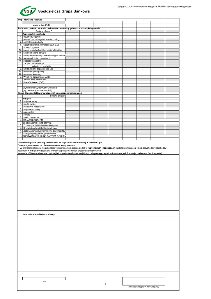 Załącznik 2.1.7 – do Wniosku o kredyt – KPR i RT– Uproszczona ksiegowość Imię i nazwisko /Nazwa: dane w tys. PLN Rachunek zysków i strat dla podmiotów prowadzących uproszczoną księgowość Badane okresy * Przychody i rozchody A. Przychody ogółem 1. wartość sprzedanych towarów i usług 2. pozostałe przychody B. Koszt uzyskania przychodu (B.1-B.2) 1. Wydatki ogółem 1a. zakup towarów handlowych i materiałów 1b. koszty uboczne zakupu 1c. koszty reprezentacji i reklamy objęte limitem 1d. wynagrodzenia z narzutami 1e. pozostałe wydatki: w tym: amortyzacja odsetki od kredytów 2. Saldo zmiany zapasów (2b-2a) 2a. remanent początkowy 2b. remanent końcowy C. Wynik na działalności (A-B) D. Składki ZUS właściciela E. Dochód brutto (C-D) Wynik brutto wykazywany w okresie (wg deklaracji podatkowej PIT) Bilans dla podmiotów prowadzących uproszczoną księgowość Badane okresy Majątek A. Majątek trwały 1. środki trwałe 2. inwestycje rozpoczęte B. Majątek obrotowy 1. należności 2. zapasy ** 3. środki pieniężne C. MAJĄTEK OGÓŁEM Zobowiązania i inne pasywa D. Zobowiązania bieżące bez kredytów E. Kredyty i pożyczki krótkoterminowe F. Zobowiązania długoterminowe bez kredytów G. Kredyty i pożyczki długoterminowe H. ZOBOWIĄZANIA I INNE PASYWA OGÓŁEM *Dane historyczne prosimy przedstawić za poprzedni rok obrotowy + dane bieżące Dane prognozowane na planowany okres kredytowania. ** W przypadku okresów nie zakończonych remanentem proszę podać w Przychodach i rozchodach wartości wynikające z ksiegi przychodów i rozchodów, natomiast w Majątku oszacowaną wartość zapasów na koniec prezentowanego okresu. Komentarz Wnioskodawcy nt. sytuacji ekonomiczno-finansowej firmy, osiągniętego wyniku finansowego(informacja podawana fakultatywnie): Inne informacje Wnioskodawcy: data 1 pieczęć i podpis Wnioskodawcy