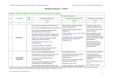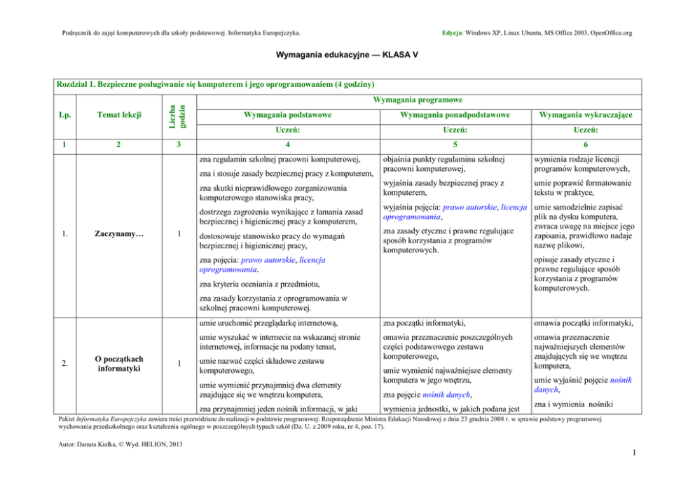 Podręcznik do zajęć komputerowych dla szkoły podstawowej. Informatyka Europejczyka. Edycja: Windows XP, Linux Ubuntu, MS Office 2003, OpenOffice.org Wymagania edukacyjne — KLASA V Rozdział 1. Bezpieczne posługiwanie się komputerem i jego oprogramowaniem (4 godziny) Lp. 1 Temat lekcji 2 Liczba godzin Wymagania programowe Wymagania podstawowe Wymagania ponadpodstawowe Wymagania wykraczające Uczeń: Uczeń: Uczeń: 3 4 5 6 zna regulamin szkolnej pracowni komputerowej, zna i stosuje zasady bezpiecznej pracy z komputerem, zna skutki nieprawidłowego zorganizowania komputerowego stanowiska pracy, dostrzega zagrożenia wynikające z łamania zasad bezpiecznej i higienicznej pracy z komputerem, 1. Zaczynamy… 1 dostosowuje stanowisko pracy do wymagań bezpiecznej i higienicznej pracy, zna pojęcia: prawo autorskie, licencja oprogramowania. zna kryteria oceniania z przedmiotu, objaśnia punkty regulaminu szkolnej pracowni komputerowej, wymienia rodzaje licencji programów komputerowych, wyjaśnia zasady bezpiecznej pracy z komputerem, umie poprawić formatowanie tekstu w praktyce, wyjaśnia pojęcia: prawo autorskie, licencja umie samodzielnie zapisać oprogramowania, plik na dysku komputera, zwraca uwagę na miejsce jego zna zasady etyczne i prawne regulujące zapisania, prawidłowo nadaje sposób korzystania z programów nazwę plikowi, komputerowych. opisuje zasady etyczne i prawne regulujące sposób korzystania z programów komputerowych. zna zasady korzystania z oprogramowania w szkolnej pracowni komputerowej. 2. O początkach informatyki 1 umie uruchomić przeglądarkę internetową, zna początki informatyki, omawia początki informatyki, umie wyszukać w internecie na wskazanej stronie internetowej, informacje na podany temat, omawia przeznaczenie poszczególnych części podstawowego zestawu komputerowego, omawia przeznaczenie najważniejszych elementów znajdujących się we wnętrzu komputera, umie nazwać części składowe zestawu komputerowego, umie wymienić przynajmniej dwa elementy znajdujące się we wnętrzu komputera, zna przynajmniej jeden nośnik informacji, w jaki umie wymienić najważniejsze elementy komputera w jego wnętrzu, zna pojęcie nośnik danych, wymienia jednostki, w jakich podana jest umie wyjaśnić pojęcie nośnik danych, zna i wymienia nośniki Pakiet Informatyka Europejczyka zawiera treści przewidziane do realizacji w podstawie programowej: Rozporządzenie Ministra Edukacji Narodowej z dnia 23 grudnia 2008 r. w sprawie podstawy programowej wychowania przedszkolnego oraz kształcenia ogólnego w poszczególnych typach szkół (Dz. U. z 2009 roku, nr 4, poz. 17). Autor: Danuta Kiałka, © Wyd. HELION, 2013 1 Podręcznik do zajęć komputerowych dla szkoły podstawowej. Informatyka Europejczyka. Edycja: Windows XP, Linux Ubuntu, MS Office 2003, OpenOffice.org Wymagania edukacyjne — KLASA V wyposażony jest komputer, pojemność pamięci i rozmiary plików, zna jednostki, w jakich podawana jest pojemność nośników pamięci i rozmiary plików, nazywa poznane nośniki danych, wymienia przynajmniej dwa nośniki danych w układzie chronologicznym, wie, że nośniki pamięci mogą mieć różną pojemność, danych w układzie chronologicznym, wymienia nośniki informacji, w jakie wyposażony jest komputer, nazywa, wymienia i omawia rodzaje pamięci komputera. zna pojęcia: pamięć operacyjna, pamięć ulotna, pamięć zewnętrzna. umie pracować w oknach, zna okno Mój komputer, wie, że widok katalogu można zmieniać, potrafi prawidłowo rozpoczynać i kończyć pracę z urządzeniem pendrive, uruchamia program korzystając z menu Start, 3. Podstawowe czynności wykonywane w systemie Windows wie, w jaki sposób wyświetlić informacje o swoim komputerze, 1 wie, że należy uważnie czytać komunikaty komputera, z pomocą nauczyciela umie odszukać zapisane pliki, skopiować i otworzyć je. wie, jak sprawdzić datę i godzinę w systemie, umie zmieniać widoki okna zależnie od potrzeb, wie, że widok katalogu można zmieniać, zależnie od potrzeby użytkownika sprawnie korzysta z przycisków W górę, Wstecz, Dalej w otwartym oknie katalogu, zna działanie przycisków: W górę, Wstecz, Dalej w otwartym oknie, wie jak korzystać z pomocy dostępnej w systemie, prawidłowo zapisuje i przechowuje wyniki swojej pracy w komputerze i na nośnikach elektronicznych, a następnie korzysta z nich, zawsze uważnie czyta komunikaty komputera, umie korzystać z pomocy dostępnej w systemie, umie odszukać zapisane pliki, skopiować i otworzyć je. potrafi samodzielnie przenieść lub skopiować plik do innego katalogu na dysku twardym komputera i na innym nośniku, potrafi prawidłowo rozpoczynać i kończyć pracę z urządzeniem pendrive, potrafi kopiować, przenosić i usuwać pliki i katalogi. 4. Inne ważne czynności w systemie 1 zna zasady pracy w oknach, zna i rozumie pojęcia: okno dialogowe, formatowanie, wirus komputerowy, wyjaśnia pojęcia: okno dialogowe, formatowanie, Pakiet Informatyka Europejczyka zawiera treści przewidziane do realizacji w podstawie programowej: Rozporządzenie Ministra Edukacji Narodowej z dnia 23 grudnia 2008 r. w sprawie podstawy programowej wychowania przedszkolnego oraz kształcenia ogólnego w poszczególnych typach szkół (Dz. U. z 2009 roku, nr 4, poz. 17). Autor: Danuta Kiałka, © Wyd. HELION, 2013 2 Podręcznik do zajęć komputerowych dla szkoły podstawowej. Informatyka Europejczyka. Edycja: Windows XP, Linux Ubuntu, MS Office 2003, OpenOffice.org Wymagania edukacyjne — KLASA V umie zmienić rozmiar okna programu, zna pojęcia: okno dialogowe, formatowanie, wirus komputerowy, umie wskazać przykład okna dialogowego, umie odszukać swój katalog na komputerze, umie zmienić wygląd okna katalogu, korzystając z przycisku Foldery, rozumie pojęcia katalog (folder), podkatalog, potrafi korzystając z przycisku Foldery, przeglądać strukturę katalogów komputera, potrafi wymienić zawartość katalogu Pu