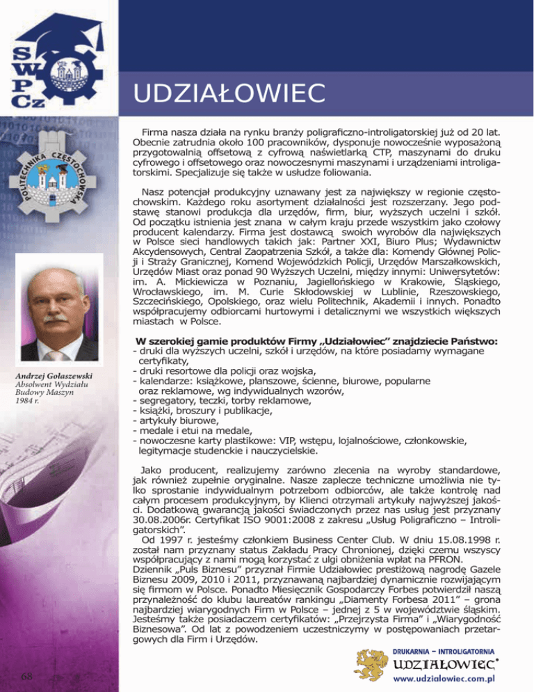 UDZIAŁOWIEC Firma nasza działa na rynku branży poligraficzno-introligatorskiej już od 20 lat. Obecnie zatrudnia około 100 pracowników, dysponuje nowocześnie wyposażoną przygotowalnią offsetową z cyfrową naświetlarką CTP, maszynami do druku cyfrowego i offsetowego oraz nowoczesnymi maszynami i urządzeniami introligatorskimi. Specjalizuje się także w usłudze foliowania. Nasz potencjał produkcyjny uznawany jest za największy w regionie częstochowskim. Każdego roku asortyment działalności jest rozszerzany. Jego podstawę stanowi produkcja dla urzędów, firm, biur, wyższych uczelni i szkół. Od początku istnienia jest znana w całym kraju przede wszystkim jako czołowy producent kalendarzy. Firma jest dostawcą swoich wyrobów dla największych w Polsce sieci handlowych takich jak: Partner XXI, Biuro Plus; Wydawnictw Akcydensowych, Central Zaopatrzenia Szkół, a także dla: Komendy Głównej Policji i Straży Granicznej, Komend Wojewódzkich Policji, Urzędów Marszałkowskich, Urzędów Miast oraz ponad 90 Wyższych Uczelni, między innymi: Uniwersytetów: im. A. Mickiewicza w Poznaniu, Jagiellońskiego w Krakowie, Śląskiego, Wrocławskiego, im. M. Curie Skłodowskiej w Lublinie, Rzeszowskiego, Szczecińskiego, Opolskiego, oraz wielu Politechnik, Akademii i innych. Ponadto współpracujemy odbiorcami hurtowymi i detalicznymi we wszystkich większych miastach w Polsce. Andrzej Gołaszewski Absolwent Wydziału Budowy Maszyn 1984 r. W szerokiej gamie produktów Firmy „Udziałowiec” znajdziecie Państwo: - druki dla wyższych uczelni, szkół i urzędów, na które posiadamy wymagane certyfikaty, - druki resortowe dla policji oraz wojska, - kalendarze: książkowe, planszowe, ścienne, biurowe, popularne oraz reklamowe, wg indywidualnych wzorów, - segregatory, teczki, torby reklamowe, - książki, broszury i publikacje, - artykuły biurowe, - medale i etui na medale, - nowoczesne karty plastikowe: VIP, wstępu, lojalnościowe, członkowskie, legitymacje studenckie i nauczycielskie. Jako producent, realizujemy zarówno zlecenia na wyroby standardowe, jak również zupełnie oryginalne. Nasze zaplecze techniczne umożliwia nie tylko sprostanie indywidualnym potrzebom odbiorców, ale także kontrolę nad całym procesem produkcyjnym, by Klienci otrzymali artykuły najwyższej jakości. Dodatkową gwarancją jakości świadczonych przez nas usług jest przyznany 30.08.2006r. Certyfikat ISO 9001:2008 z zakresu „Usług Poligraficzno – Introligatorskich”. Od 1997 r. jesteśmy członkiem Business Center Club. W dniu 15.08.1998 r. został nam przyznany status Zakładu Pracy Chronionej, dzięki czemu wszyscy współpracujący z nami mogą korzystać z ulgi obniżenia wpłat na PFRON. Dziennik „Puls Biznesu” przyznał Firmie Udziałowiec prestiżową nagrodę Gazele Biznesu 2009, 2010 i 2011, przyznawaną najbardziej dynamicznie rozwijającym się firmom w Polsce. Ponadto Miesięcznik Gospodarczy Forbes potwierdził naszą przynależność do klubu laureatów rankingu „Diamenty Forbesa 2011” – grona najbardziej wiarygodnych Firm w Polsce – jednej z 5 w województwie śląskim. Jesteśmy także posiadaczem certyfikatów: „Przejrzysta Firma” i „Wiarygodność Biznesowa”. Od lat z powodzeniem uczestniczymy w postępowaniach przetargowych dla Firm i Urzędów. 68