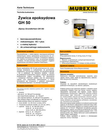 Karta Techniczna Technika budowlana BAT_GH50 Żywica epoksydowa GH 50 (Epoxy Grundierharz GH 50) • bezrozpuszczalnikowa • niskoemisyjna - EC 1 plus • o niskiej lepkości • do uniwersalnego zastosowania Właściwości produktu Dane produktu Dwuskładnikowa, o niskiej lepkości, bezrozpuszczalnikowa, niskoemisyjna żywica epoksydowa przeznaczona do uniwersalnego stosowania na budowie. Pozbawiona wypełniaczy, odporna na kredowanie i udar, nie powoduje naprężeń w podłożu. W razie potrzeby można ją wypełnić / zagęścić wypełniaczem lub drobnym piaskiem kwarcowym. Opakowanie: 30 kg opakowanie (komp. A: 24 kg, komp. B: 6 kg) Zastosowanie Zgodność badania Żywica epoksydowa GH 50 jest przeznaczona do uniwersalnego stosowania w budownictwie: do gruntowania, wygładzania i wzmacniania podłoży, do zamykania pęknięć i rys w podłożach, do zalewania ubytków i pustek, do podlewania fundamentów maszyn i słupów, do odcięcia podwyższonej wilgoci szczątkowej, do lakierowania i impregnacji chłonnych podłoży oraz do wykonywania zapraw oraz szpachlówek epoksydowych o różnej konsystencji (po zmieszaniu z piaskiem kwarcowym). Do stosowania wewnątrz i na zewnątrz budynków. Karta Charakterystyki (Karta Bezpieczeństwa) Magazynowanie: Warunki: w ogrzewanych, suchych pomieszczeniach, w oryginalnych opakowaniach. Okres przechowywania: 12 miesięcy od daty produkcji. Stosowanie Zalecane narzędzia: Elektryczne mieszadło wolnoobrotowe, szpachla, paca zębata, kielnia, wałek, wałek do odpowietrzania, odpowiednie naczynie do mieszania. Podłoże: Stosować na wszystkich standardowych budowlanych podłożach mineralnych, np. betonie i jastrychu. Parametry techniczne Podłoże powinno być wykonane zgodnie z zasadami sztuki budowlanej. Podłoże musi być suche, mocne, stabilne, odpowiednio wytrzymałe, bez spękań, czyste, dobrze wyszlifowane, oczyszczone i odkurzone. Warstwy podłoża ograniczające jego chłonność i przyczepność gruntu np. twarde powłoki, mleczko cementowe, mleczko anhydrytowe, stare warstwy klejów lub mas wyrównawczych, itp. należy dokładnie usunąć poprzez szlifowanie, szczotkowanie, frezowanie lub śrutowanie. Minimalna wytrzymałość podłoża na ściskanie powinna być większa niż 25 N/mm² (odpowiada to betonowi klasy C25). Minimalna wytrzymałość podłoża na zrywanie powinna być większa niż 1,5 N/mm². Wilgotność szczątkowa jastrychu cementowego i betonu nie powinna przekraczać 3,5 %CM. Wymagana jest temperatura podłoża powyżej 10°C i 3°C powyżej punktu rosy. Należy wykluczyć ryzyko podsiąkania wilgoci (wilgoć napierającą). Podłoże należy sprawdzić w oparciu o obowiązujące wytyczne, normy i instrukcje. o Dane dotyczą warunków: temperatura powietrza 20 C, wilgotność względna powietrza 55% Zużycie: - jako grunt: ok. 300 g/m2/na warstwę - jako szpachlówka epoksyd.: ok. 700 g/m2 - jako zaprawa epoksyd.: ok. 300 g/m2/mm grubości - jako odcięcie wilgoci szczątkowej: ok. 300-400 g/m² na każdą warstwę (zaleca się nałożenie 2 warstw) Czas obróbki: ok. 30 minut ( w temp. 20°C) Temperatura podczas obróbki: od +5°C do +35°C Lepkość: komp. A: ok. 350-550 mPa*s komp. B: ok. 24-40 mPa*s komp. A+B: ok. 280-450 mPa*s Gęstość: komp. A: ok. 1,08 g/cm3 komp. B : ok. 1,04 g/cm3 komp. A+B: ok. 1,07 g/cm³ GH 50, ważna od: 31.01.2014, MKU, stron 2 Murexin Polska Sp. z o.o. 03-236 Warszawa, ul. Annopol 4A Tel.: +48 22 / 884 77 55, Fax: +48 22 / 814 53 31 e-mail: [email protected], Internet: www.murexin.pl 1 Karta Techniczna Technika budowlana BAT_GH50 ________________________________ Przygotowanie podłoża: Zaleca się wykonać obróbkę mechaniczną podłoża za pomocą szlifowania, piaskowania, śrutowania, frezowania. Następnie podłoże należy starannie odkurzyć. Niniejsza karta techniczna bazuje na rozległym doświadczeniu, została stworzona z najlepszej woli, nie jest prawnie wiążąca i nie jest ofertą w rozumieniu prawa czy też gwarancją wynikającą z zamówienia lub umowy sprzedaży. Aby zminimalizować ryzyko popełnienia błędów wykonawczych w karcie zawarto określone, ograniczone informacje. Naturalnie nie mogą być tam dokładnie opisane wszystkie dotychczasowe i możliwe zastosowania produktu. Zrezygnowano z danych, które dla fachowców są oczywiste. W przypadku niejasności bądź wątpliwości, jak również ujawnienia jakichkolwiek dodatkowych czynników mogących mieć wpływ na prawidłowość aplikacji produktu bądź technologii wykonania systemu, Wykonawca winien uprzednio przeprowadzić próbę na miejscu budowy, zabezpieczając w odpowiedni sposób jej wyniki oraz skontaktować się z działem technicznym firmy Murexin Polska Sp. z o.o. Niezależnie od powyższych zaleceń Wykonawca zobowiązany jest do działania zgodnie z obowiązującymi przepisami, normami i wytycznymi oraz z zasadami sztuki budowlanej. W momencie wydania nowego opracowania tej karty technicznej, poprzednia wersja traci swoją ważność. Mieszanie: Pojemniki z żywicą przed użyciem należy doprowadzić do temperatury pokojowej. Komponenty dostarczone w oryginalnych opakowaniach wymieszać ze sobą w proporcji komp. A : komp. B = 4:1. Przed zmieszaniem komponentów należy dokładnie wymieszać komponent A zaczynając od dna opakowania. Następnie wlać całą ilość komp. B do pojemnika z komp. A i całość starannie wymieszać za pomocą mieszadła wolnoobrotowego przez ok. 2-3 minuty, aż do uzyskania jednorodnej masy. Należy zwrócić szczególną uwagę aby całość materiału została starannie wymieszana, szczególnie na dnie i przy ściankach pojemnika. Żywicę przelać do czystego pojemnika i jeszcze raz starannie wymieszać. Obróbka w zależności od sposobu zastosowania: Impregnacja, gruntowanie: wymieszaną żywicę nakładać wałkiem na przygotowane podłoże Szpachlowanie: żywicę GH 50 zmieszać z piaskiem kwarcowym (0,063-3,5 mm) w proporcji 1:7 do 1:10. Samorozpł