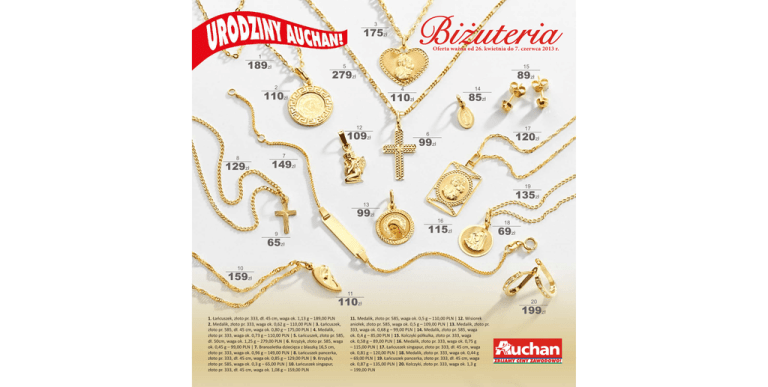 3 175z³ Oferta wa¿na od 26. kwietnia do 7. czerwca 2013 r. 1 189z³ 5 15 279z³ 89z³ 2 4 14 110z³ 110z³ 85z³ 12 17 109z³ 8 129z³ 6 120z³ 99z³ 7 149z³ 19 135z³ 13 99z³ 16 115z³ 9 18 69z³ 65z³ 10 159z³ 11 110z³ 1. £añcuszek, z³oto pr. 333, d³. 45 cm, waga ok. 1,13 g – 189,00 PLN 2. Medalik, z³oto pr. 333, waga ok. 0,62 g – 110,00 PLN | 3. £añcuszek, z³oto pr. 585, d³. 45 cm, waga ok. 0,80 g – 175,00 PLN | 4. Medalik, z³oto pr. 333, waga ok. 0,73 g – 110,00 PLN | 5. £añcuszek, z³oto pr. 585, d³. 50cm, waga ok. 1,25 g – 279,00 PLN | 6. Krzy¿yk, z³oto pr. 585, waga ok. 0,45 g – 99,00 PLN | 7. Bransoletka dzieciêca z blaszk¹ 16,5 cm, z³oto pr. 333, waga ok. 0,96 g – 149,00 PLN | 8. £añcuszek pancerka, z³oto pr. 333, d³. 45 cm, waga ok. 0,85 g – 129,00 PLN | 9. Krzy¿yk, z³oto pr. 585, waga ok. 0,3 g – 65,00 PLN | 10. £añcuszek singapur, z³oto pr. 333, d³. 45 cm, waga ok. 1,08 g – 159,00 PLN 11. Medalik, z³oto pr. 585, waga ok. 0,5 g – 110,00 PLN | 12. Wisiorek anio³ek, z³oto pr. 585, waga ok. 0,5 g – 109,00 PLN | 13. Medalik, z³oto pr. 333, waga ok. 0,68 g – 99,00 PLN | 14. Medalik, z³oto pr. 585, waga ok. 0,4 g – 85,00 PLN | 15. Kolczyki pó³kulka, z³oto pr. 333, waga ok. 0,58 g – 89,00 PLN | 16. Medalik, z³oto pr. 333, waga ok. 0,75 g – 115,00 PLN | 17. £añcuszek singapur, z³oto pr. 333, d³. 45 cm, waga ok. 0,81 g – 120,00 PLN | 18. Medalik, z³oto pr. 333, waga ok. 0,44 g – 69,00 PLN | 19. £añcuszek pancerka, z³oto pr. 333, d³. 45 cm, waga ok. 0,87 g – 135,00 PLN | 20. Kolczyki, z³oto pr. 333, waga ok. 1,3 g – 199,00 PLN 20 199z³ 33 129z³ 45 21 30 399z³ 130z³ 369z³ 27 239z³ 35 539z³ 32 165z³ 43 46 459z³ 270z³ 36 23 279z³ 28 279z³ 34 185z³ 199z³ 47 309z³ 24 239z³ 39 219z³ 22 37 40z³ 31 109z³ 25 209z³ 40 239z³ 279z³ 26 329z³ 48 379z³ 29 38 41 199z³ 269z³ 92z³ 42 100z³ 21. £añcuszek, z³oto pr. 585, d³. 45 cm, waga ok. 1,85 g – 399,00 PLN | 22. Wisiorek literka, srebro poz³acane – 40,00 PLN | 23. £añcuszek, z³oto pr. 585, d³. 45 cm, waga ok. 1,30 g – 279,00 PLN| 24. Medalik, z³oto pr. 585, waga ok. 1,10 g – 239,00 PLN | 25. Pierœcionek, z³oto pr. 333, waga ok. 1,81 g – 279,00 PLN | 26. Pierœcionek, z³oto pr. 585, waga ok. 1,5 g – 329,00 PLN | 27. Pierœcionek, z³oto pr. 333, waga ok. 1,58 g – 239,00 PLN | 28. Krzy¿yk, z³oto pr. 585, waga ok. 0,85g – 185,00 PLN | 29. Kolczyki, z³oto pr. 585, waga ok. 0,9 g – 199,00 PLN | 30. £añcuszek, d³. 50 cm, z³oto pr. 585, waga ok. 0,60 g – 130,00 PLN | 31. Wisiorek, z³oto pr. 585, waga ok. 0,5 g – 109,00 PLN | 32. Kolczyki, z³oto pr. 585, waga ok. 0,75 g – 165,00 PLN | 33. Bransoletka, z³oto pr. 585, d³. 18 cm, waga ok. 0,60 g – 129,00 PLN | 34. Medalik, z³oto pr. 585, waga ok. 0,9g – 199,00 PLN 44 229z³ 35. Pierœcionek, z³oto pr. 333, waga ok. 3,73 g – 539,00 PLN| 36. Pierœcionek, z³oto pr. 333, waga ok. 1,8 g – 279,00 PLN | 37. Pierœcionek, z³oto pr. 333, waga ok. 1,36 g – 209,00 PLN 38. Pierœcionek, z³oto pr. 333, waga ok. 1,8 g – 269,00 PLN | 39. Medalik, z³oto pr. 585, waga ok. 1 g – 219,00 PLN | 40. Medalik, z³oto pr. 585, waga ok. 1,1 g – 239,00 PLN 41. Medalik, z³oto pr. 333, waga ok. 0,61 g – 92,00 PLN | 42. Medalik, z³oto pr. 333, waga ok. 0,68 g – 100,00 PLN | 43. £añcuszek, z³oto pr. 585, d³. 50 cm, waga ok. 2,10 g – 459,00 PLN 44. Medalik, z³oto pr. 585, waga ok. 1,05 g – 229,00 PLN | 45. Bransoletka pancerka d³. 19cm, z³oto pr. 333, waga ok. 2,35 g – 369,00 PLN | 46. Wisiorek anio³ek, z³oto pr. 585, waga ok. 1,25 g – 270,00 PLN | 47. Pierœcionek, z³oto pr. 585, waga ok. 1,4 g – 309,00 PLN | 48. Pierœcionek, z³oto pr. 585, waga ok. 1,7 g – 379,00 PLN 64 24z³ 66 80 39z³ 42z³ 84 39z³ 86 49 19z³ 65 29z³ 22z³ 67 29z³ 81 78 82 23z³ 32z³ 19z³ 79 35z³ 68 29z³ 61 19z³ 58 62 19z³ 27z³ 83 22z³ 85 87 35z³ 15z³ 88 29z³ 69 77 49z³ 50 19z³ 52 57 24z³ 24z³ 22z³ 63 35z³ 74 51 53 19z³ 49z³ 73 32z³ 24z³ 70 17z³ 55 54 19z³ 20z³ 56 27z³ 75 72 71 59 19z³ 60 39z³ 22z³ 14z³ 76 37z³ 37z³ 49. Bransoletka sznurek, koñcówka srebro pr. 925 – 19,00 PLN | 50. Medalik, srebro pr. 925 – 19,00 PLN | 51. Medalik, srebro pr. 925 – 32,00 PLN | 52. Medalik, srebro pr. 925 – 24,00 PLN | 53. Medalik, srebro pr. 925 – 19,00 PLN | 54. Medalik, srebro pr. 925 – 19,00 PLN | 55. Medalik, srebro pr.925 – 20,00 PLN | 56. Medalik, srebro pr. 925 – 27,00 PLN 57. Medalik Szkaplerzyk, srebro pr. 925 – 24,00 PLN | 58. Medalik, srebro pr. 925 – 19,00 PLN | 59. Pierœcionek z cyrkoni¹ - ró¿ne kolory, srebro pr. 925 – 19,00 PLN 60. Kolczyki z cyrkoniami - ró¿ne kolory, srebro pr. 925 – 37,00 PLN | 61. Medalik, srebro pr. 925 – 19,00 PLN | 62. Medalik, srebro pr. 925 – 27,00 PLN | 63. Kolczyki, srebro pr. 925 – 35,00 PLN | 64. £añcuszek linka, d³. 45 cm, srebro pr. 925 – 24,00 PLN | 65. Medalik, srebro pr. 925 – 19,00 PLN | 66. Pierœcionek z cyrkoniami - ró¿ne kolory, srebro pr. 925 – 39,00 PLN | 67. Pierœcionek motylek, srebro pr. 925 – 32,00 PLN | 68. Kolczyki, srebro pr. 925 – 29,00 PLN | 69. Komplet dzieciêcy, srebro pr. 925 – 49,00 PLN 70. Kolczyki, srebro pr. 925 – 17,00 PLN | 71. Kolczyki emalia, srebro pr. 925 – 39,00 PLN | 72. Kolczyki emalia, srebro pr. 925 – 22,00 PLN 73. Kolczyki emalia, srebro pr. 925 – 22,00 PLN | 74. Kolczyki - ró¿ne wzory, srebro pr. 925 – 24,00 PLN | 75. Kolczyki, srebro pr. 925 – 14,00 PLN | 76. Kolczyki emalia - ró¿ne kolory, srebro pr. 925 – 37,00 PLN| 77. Bransoletka, srebro pr. 925 – 49,00 PLN | 78. Krzy¿yk, srebro pr. 925 – 22,00 PLN | 79. Kolczyki, srebro pr. 925 – 35,00 PLN | 80. £añcuszek pancerka, d³. 50 cm, srebro pr. 925 – 42,00 PLN | 81. Krzy¿yk, srebro pr. 925 – 29,00 PLN| 82. Krzy¿yk, srebro pr. 925 – 23,00 PLN | 83. Krzy¿yk, srebro pr. 925 – 22,00 PLN 84. £añcuszek rodowany lin