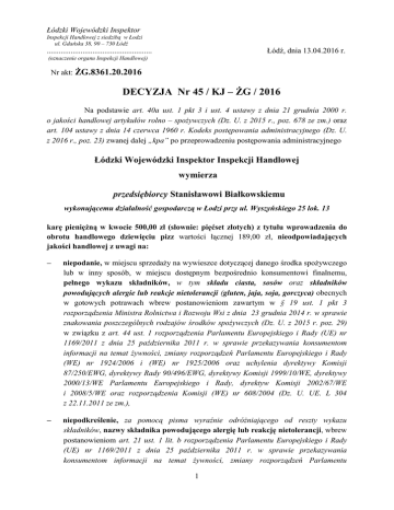Łódzki Wojewódzki Inspektor Inspekcji Handlowej z siedzibą w Łodzi ul. Gdańska 38, 90 – 730 Łódź Łódź, dnia 13.04.2016 r. ..................................................... (oznaczenie organu Inspekcji Handlowej) Nr akt: ŻG.8361.20.2016 DECYZJA Nr 45 / KJ – ŻG / 2016 Na podstawie art. 40a ust. 1 pkt 3 i ust. 4 ustawy z dnia 21 grudnia 2000 r. o jakości handlowej artykułów rolno – spożywczych (Dz. U. z 2015 r., poz. 678 ze zm.) oraz art. 104 ustawy z dnia 14 czerwca 1960 r. Kodeks postępowania administracyjnego (Dz. U. z 2016 r., poz. 23) zwanej dalej „kpa” po przeprowadzeniu postępowania administracyjnego Łódzki Wojewódzki Inspektor Inspekcji Handlowej wymierza przedsiębiorcy Stanisławowi Białkowskiemu wykonującemu działalność gospodarczą w Łodzi przy ul. Wyszyńskiego 25 lok. 13 karę pieniężną w kwocie 500,00 zł (słownie: pięćset złotych) z tytułu wprowadzenia do obrotu handlowego dziewięciu pizz wartości łącznej 189,00 zł, nieodpowiadających jakości handlowej z uwagi na: niepodanie, w miejscu sprzedaży na wywieszce dotyczącej danego środka spożywczego lub w inny sposób, w miejscu dostępnym bezpośrednio konsumentowi finalnemu, pełnego wykazu składników, w tym składu ciasta, sosów oraz składników powodujących alergie lub reakcje nietolerancji (gluten, jaja, soja, gorczyca) obecnych w gotowych potrawach wbrew postanowieniom zawartym w § 19 ust. 1 pkt 3 rozporządzenia Ministra Rolnictwa i Rozwoju Wsi z dnia 23 grudnia 2014 r. w sprawie znakowania poszczególnych rodzajów środków spożywczych (Dz. U. z 2015 r. poz. 29) w związku z art. 44 ust. 1 rozporządzenia Parlamentu Europejskiego i Rady (UE) nr 1169/2011 z dnia 25 października 2011 r. w sprawie przekazywania konsumentom informacji na temat żywności, zmiany rozporządzeń Parlamentu Europejskiego i Rady (WE) nr 1924/2006 i (WE) nr 1925/2006 oraz uchylenia dyrektywy Komisji 87/250/EWG, dyrektywy Rady 90/496/EWG, dyrektywy Komisji 1999/10/WE, dyrektywy 2000/13/WE Parlamentu Europejskiego i Rady, dyrektyw Komisji 2002/67/WE i 2008/5/WE oraz rozporządzenia Komisji (WE) nr 608/2004 (Dz. U. UE. L 304 z 22.11.2011 ze zm.), niepodkreślenie, za pomocą pisma wyraźnie odróżniającego od reszty wykazu składników, nazwy składnika powodującego alergię lub reakcję nietolerancji, wbrew postanowieniom art. 21 ust. 1 lit. b rozporządzenia Parlamentu Europejskiego i Rady (UE) nr 1169/2011 z dnia 25 października 2011 r. w sprawie przekazywania konsumentom informacji na temat żywności, zmiany rozporządzeń Parlamentu 1 Europejskiego i Rady (WE) nr 1924/2006 i (WE) nr 1925/2006 oraz uchylenia dyrektywy Komisji 87/250/EWG, dyrektywy Rady 90/496/EWG, dyrektywy Komisji 1999/10/WE, dyrektywy 2000/13/WE Parlamentu Europejskiego i Rady, dyrektyw Komisji 2002/67/WE i 2008/5/WE oraz rozporządzenia Komisji (WE) nr 608/2004 (Dz. U. UE. L 304 z 22.11.2011 ze zm.). Uzasadnienie W dniach od 27 do 29 stycznia 2016 r. na podstawie upoważnienia Łódzkiego Wojewódzkiego Inspektora Inspekcji Handlowej numer ŻG.8361.20.2016 z dnia 27 stycznia 2016 r. inspektorzy Wojewódzkiego Inspektoratu Inspekcji Handlowej w Łodzi przeprowadzili kontrolę w restauracji „Highway” zlokalizowanej w Łodzi przy ul. Wyszyńskiego 25 lok. 13, należącej do Stanisława Białkowskiego. Kontrolę przeprowadzono na podstawie przepisów art. 3 ust. 1 - 3 rozporządzenia Parlamentu Europejskiego i Rady (WE) nr 882/2004 z dnia 29 kwietnia 2004 r. w sprawie kontroli urzędowych przeprowadzanych w celu sprawdzenia zgodności z prawem paszowym i żywnościowym oraz regułami dotyczącymi zdrowia zwierząt i dobrostanu zwierząt (Dz. U. L 165 z 30.4.2004 r. ze zm.), art. 17 ust. 3 ustawy z dnia 21 grudnia 2000 r. o jakości handlowej artykułów rolno-spożywczych (Dz. U. z 2015 r., poz. 678 ze zm.), art. 24 ust. 1 rozporządzenia Parlamentu Europejskiego i Rady (WE) nr 1935/2004 z dnia 27 października 2004 r. w sprawie materiałów i wyrobów przeznaczonych do kontaktu z żywnością oraz uchylającego dyrektywy 80/590/EWG (Dz. U. z 27.10.2004 s. 4 ze zm.) w związku z art. 3 ust. 1 pkt 6 oraz art. 3 ust. 1 pkt 1, 2 ustawy z dnia 15 grudnia 2000 r. o Inspekcji Handlowej (Dz. U. z 2014 r., poz. 148 ze zm.) w obecności osoby czynnej (…) (w dniu 27.01.2016 r.) oraz kontrolowanego przedsiębiorcy Stanisława Białkowskiego (w dniach 28 i 29.01.2016 r.). Celem sprawdzenia jakości oraz prawidłowości oznakowania i rzetelności przekazywanych informacji o oferowanych potrawach inspektorzy występując w charakterze nabywców zakupili pizzę deklarowaną jako „Minnesota (sos, mozzarella, szynka, pieczarki) 20,00 zł”, do której dodano dwa sosy gratis (pomidorowy i cezar). Przeprowadzona na miejscu ocena organoleptyczna nie wykazała cech dyskwalifikujących ją z obrotu handlowego. Natomiast zarówno pochodząca z zakupu pizza Minnesota (sos, mozzarella, szynka, pieczarki) jak i osiem innych pizz deklarowanych w miejscu sprzedaży jako „Montana sos, mozzarella 16,00 zł”, „Hawaje sos, mozzarella, szynka, ananas 19,00 zł”, „Indiana sos, mozzarella, salami, pepperoni, czosnek, tabasco 21,00 zł”, „Kansas sos, mozzarella, kiełbasa, pieczarki, czerwona cebula 21,00 zł”, „Nebraska sos, mozzarella, kebab drobiowy, cebula, czosnek, tabasco 22,00 zł”, „Alabama sos, mozzarella, ser mozzarella z serwatki, pomidor, świeża bazylia 23,00 zł”, „Dakota sos, mozzarella, kebab drobiowy, pieczarki, cebula, majonez 23,50 zł”, „Oklahoma sos, mozzarella, kurczak, groszek, czosnek, papryka 23,50 zł” 2 wartości łącznej 189,00 zł nie odpowiadało jakości handlowej określonej w przepisach prawa żywnościowego. Dla przedmiotowych dziewięciu pizz nie podano, na wywieszce dotyczącej danego środka spożywczego lub w inny sposób w miejscu dostępnym bezpośrednio konsumentowi finalnemu, składu ciasta, sosów dodawanych do pizz oraz składników powodujących alergie l