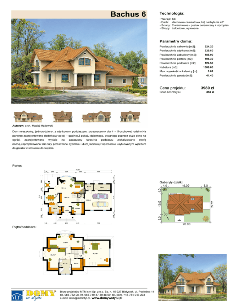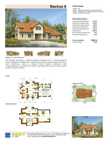 Bachus 6 Technologia: • Wersja: • Dach: • Ściany: • Stropy: CE dachówka cementowa, kąt nachylenia 40° 2-warstwowe - pustak ceramiczny + styropian żelbetowe, wylewane Parametry domu: Powierzchnia całkowita [m2]: 324.20 Powierzchnia użytkowa [m2]: 229.80 Powierzchnia zabudowy [m2]: 188.90 Powierzchnia parteru [m2]: 105.30 Powierzchnia poddasza [m2]: Kubatura [m3]: Max. wysokość w kalenicy [m]: Powierzchnia garażu [m2]: Cena projektu: Cena kosztorysu: Autorzy: arch. Maciej Matłowski Dom mieszkalny, jednorodzinny, z użytkowym poddaszem, przeznaczony dla 4 – 5-osobowej rodziny.Na parterze zaprojektowano dodatkowy pokój – gabinet.Z pokoju dziennego, otwartego poprzez duże okno na ogród, zaprojektowano wyjście na zadaszony taras.Na poddaszu zlokalizowano strefę nocną.Zaprojektowano tam trzy przestronne sypialnie i dużą łazienkę.Poprzecznie usytuowanym wjazdem do garażu w stosunku do wejścia. Parter: Gabaryty działki: Piętro/poddasze: Biuro projektów MTM styl Sp. z o.o. Sp. k. 15-227 Białystok, ul. Podleśna 14 tel. 085-732-08-79, 085-740-87-50 do 59, tel. kom. +48-784-047-233 e-mail: [email protected], www.domywstylu.pl 124.50 1089.00 8.82 41.40 3980 zł 350 zł