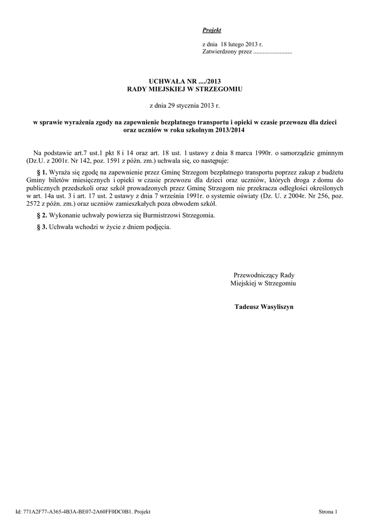 Projekt z dnia 18 lutego 2013 r. Zatwierdzony przez ......................... UCHWAŁA NR ..../2013 RADY MIEJSKIEJ W STRZEGOMIU z dnia 29 stycznia 2013 r. w sprawie wyrażenia zgody na zapewnienie bezpłatnego transportu i opieki w czasie przewozu dla dzieci oraz uczniów w roku szkolnym 2013/2014 Na podstawie art.7 ust.1 pkt 8 i 14 oraz art. 18 ust. 1 ustawy z dnia 8 marca 1990r. o samorządzie gminnym (Dz.U. z 2001r. Nr 142, poz. 1591 z późn. zm.) uchwala się, co następuje: § 1. Wyraża się zgodę na zapewnienie przez Gminę Strzegom bezpłatnego transportu poprzez zakup z budżetu Gminy biletów miesięcznych i opieki w czasie przewozu dla dzieci oraz uczniów, których droga z domu do publicznych przedszkoli oraz szkół prowadzonych przez Gminę Strzegom nie przekracza odległości określonych w art. 14a ust. 3 i art. 17 ust. 2 ustawy z dnia 7 września 1991r. o systemie oświaty (Dz. U. z 2004r. Nr 256, poz. 2572 z późn. zm.) oraz uczniów zamieszkałych poza obwodem szkół. § 2. Wykonanie uchwały powierza się Burmistrzowi Strzegomia. § 3. Uchwała wchodzi w życie z dniem podjęcia. Przewodniczący Rady Miejskiej w Strzegomiu Tadeusz Wasyliszyn Id: 771A2F77-A365-4B3A-BE07-2A60FF0DC0B1. Projekt Strona 1 Uzasadnienie Zgodnie z przepisem art. 14a ust. 3 ustawy z dnia 7 września 1991r. o systemie oświaty (Dz. U. z 2004r. Nr 256, poz. 2572 z późn. zm.) jeżeli droga dziecka pięcioletniego z domu do najbliższego publicznego przedszkola, oddziału przedszkolnego w szkole podstawowej lub publicznej innej formy wychowania przedszkolnego przekracza 3 km obowiązkiem gminy jest zapewnienie bezpłatnego transportu i opieki w czasie przewozu dziecka. Przepisy art. 17 ust. 2 i 3 stanowią, iż droga dziecka z domu do szkoły nie może przekraczać 3 km – w przypadku uczniów klas I - IV szkół podstawowych oraz 4 km – w przypadku klas V – VI szkół podstawowych oraz uczniów gimnazjów. Jeżeli droga dziecka z domu do szkoły, w której obwodzie dziecko mieszka przekracza wskazane odległości obowiązkiem gminy jest zapewnienie bezpłatnego transportu i opieki w czasie przewozu. Przepis art. 7 ust.1 ustawy z dnia 8 marca 1990r. o samorządzie gminnym (Dz. U. z 2001r. Nr 142, poz. 1591 z późn. zm.)stanowi, iż do zadań własnych gminy należy zaspokajanie zbiorowych potrzeb wspólnoty, a w szczególności w zakresie edukacji publicznej oraz porządku publicznego i bezpieczeństwa obywateli. Podjęcie niniejszej uchwały pozwoli na dowóz dzieci i uczniów z miejscowości położonych w odległości nie większej niż 3 lub 4 km zapewniając tym samym dzieciom bezpieczne dotarcie do szkół. Gmina Strzegom ze względu na specyfikę gospodarczą - funkcjonujący przemysł kamieniarski i bardzo dużą liczbę poruszających się po drogach dużych samochodów ciężarowych w sposób szczególny musi dbać o bezpieczeństwo dzieci w drodze do i ze szkoły. Zaznaczyć również należy, że przy reorganizacji sieci szkolnej/ likwidacji szkół w Międzyrzeczu, Tomkowicach, Żółkiewce, Szkoły Podstawowej Nr 6 w Strzegomiu/ rada gminy deklarowała bezpłatny dowóz dzieci do szkół. Zgodnie z pismem z dnia 16 lutego 2009r. Ministerstwa Edukacji Narodowej DKOW-4-DD-5021/05/09 " Ustawa o systemie oświaty nie zawiera wykluczenia możliwości zorganizowania przez gminę bezpłatnego dowozu dzieci do szkoły wówczas, gdy odległości są mniejsze niż wskazene w art. 17 ust. 2 - jako fakultatywnego zadania własnego". Biorąc pod uwagę powyższe podjęcie niniejszej uchwały jest w pełni uzasadnione. Id: 771A2F77-A365-4B3A-BE07-2A60FF0DC0B1. Projekt Strona 1