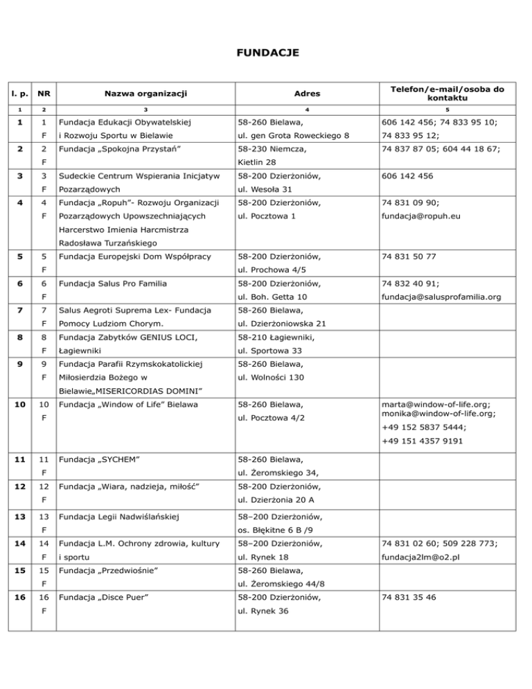 FUNDACJE l. p. NR Nazwa organizacji Adres Telefon/e-mail/osoba do kontaktu 1 2 3 4 5 1 1 Fundacja Edukacji Obywatelskiej 58-260 Bielawa, 606 142 456; 74 833 95 10; F i Rozwoju Sportu w Bielawie ul. gen Grota Roweckiego 8 74 833 95 12; 2 Fundacja „Spokojna Przystań” 58-230 Niemcza, 74 837 87 05; 604 44 18 67; 2 F 3 4 Kietlin 28 3 Sudeckie Centrum Wspierania Inicjatyw 58-200 Dzierżoniów, 606 142 456 F Pozarządowych ul. Wesoła 31 4 Fundacja „Ropuh”- Rozwoju Organizacji 58-200 Dzierżoniów, 74 831 09 90; F Pozarządowych Upowszechniających ul. Pocztowa 1 [email protected] 58-200 Dzierżoniów, 74 831 50 77 Harcerstwo Imienia Harcmistrza Radosława Turzańskiego 5 5 Fundacja Europejski Dom Współpracy F 6 6 ul. Prochowa 4/5 Fundacja Salus Pro Familia F 7 8 9 58-200 Dzierżoniów, 74 832 40 91; ul. Boh. Getta 10 [email protected] 7 Salus Aegroti Suprema Lex- Fundacja 58-260 Bielawa, F Pomocy Ludziom Chorym. ul. Dzierżoniowska 21 8 Fundacja Zabytków GENIUS LOCI, 58-210 Łagiewniki, F Łagiewniki ul. Sportowa 33 9 Fundacja Parafii Rzymskokatolickiej 58-260 Bielawa, F Miłosierdzia Bożego w ul. Wolności 130 Bielawie„MISERICORDIAS DOMINI” 10 10 Fundacja „Window of Life” Bielawa F 58-260 Bielawa, ul. Pocztowa 4/2 [email protected]; [email protected]; +49 152 5837 5444; +49 151 4357 9191 11 11 Fundacja „SYCHEM” F 12 12 ul. Żeromskiego 34, Fundacja „Wiara, nadzieja, miłość” F 13 13 14 F 15 15 Fundacja Legii Nadwiślańskiej 16 F 58–200 Dzierżoniów, os. Błękitne 6 B /9 Fundacja L.M. Ochrony zdrowia, kultury 58–200 Dzierżoniów, 74 831 02 60; 509 228 773; i sportu ul. Rynek 18 [email protected] Fundacja „Przedwiośnie” 58-260 Bielawa, F 16 58-200 Dzierżoniów, ul. Dzierżonia 20 A F 14 58-260 Bielawa, ul. Żeromskiego 44/8 Fundacja „Disce Puer” 58-200 Dzierżoniów, ul. Rynek 36 74 831 35 46 17 17 Fundacja „Misericordia Cantabo” F 18 18 Radzików 54 A Fundacja Kultury i Rozwoju „Ślęża” F 19 19 Fundacja Biel'Arte F 20 20 F 21 21 F 58-210 Łagiewniki, 58-200 Dzierżoniów, 725 555 312; [email protected] ul Wrocławska 22 [email protected] 58-260 Bielawa, [email protected] ul. Wodna 26/9 Fundacja „Beiteinu Chaj - 2004” 58-200 Dzierżoniów, Fundacja Dzierżoniowski Uniwersytet Trzeciego Wieku 58-200 Dzierżoniów 25.02.2014 601 285 297 ul. Zacisze 9 ul.Bat.Chłopskich 19a [email protected]