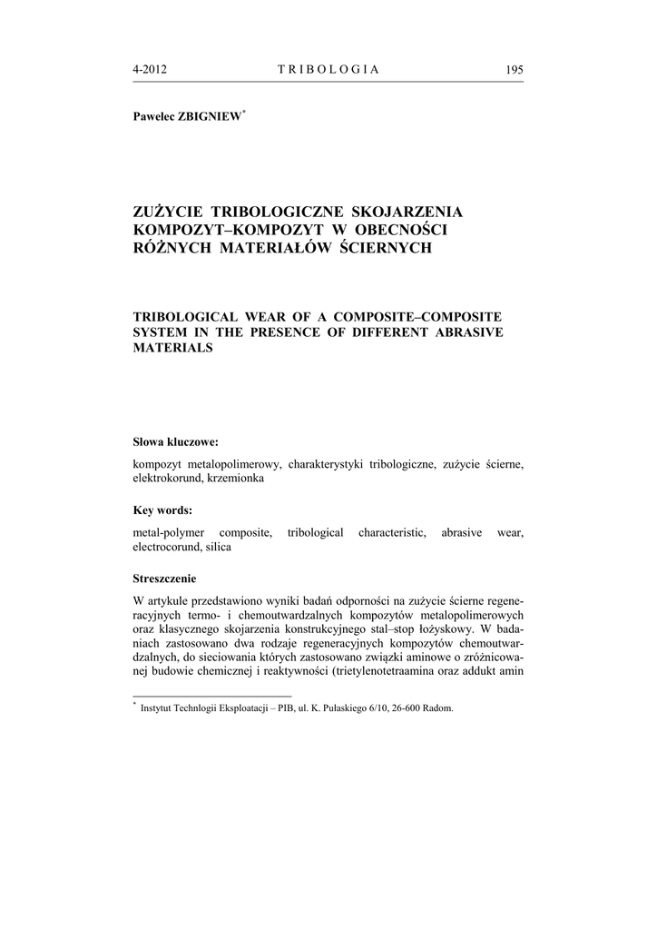 4-2012 TRIBOLOGIA 195 Pawelec ZBIGNIEW * ZUŻYCIE TRIBOLOGICZNE SKOJARZENIA KOMPOZYT–KOMPOZYT W OBECNOŚCI RÓŻNYCH MATERIAŁÓW ŚCIERNYCH TRIBOLOGICAL WEAR OF A COMPOSITE–COMPOSITE SYSTEM IN THE PRESENCE OF DIFFERENT ABRASIVE MATERIALS Słowa kluczowe: kompozyt metalopolimerowy, charakterystyki tribologiczne, zużycie ścierne, elektrokorund, krzemionka Key words: metal-polymer composite, electrocorund, silica tribological characteristic, abrasive wear, Streszczenie W artykule przedstawiono wyniki badań odporności na zużycie ścierne regeneracyjnych termo- i chemoutwardzalnych kompozytów metalopolimerowych oraz klasycznego skojarzenia konstrukcyjnego stal–stop łożyskowy. W badaniach zastosowano dwa rodzaje regeneracyjnych kompozytów chemoutwardzalnych, do sieciowania których zastosowano związki aminowe o zróżnicowanej budowie chemicznej i reaktywności (trietylenotetraamina oraz addukt amin * Instytut Technlogii Eksploatacji – PIB, ul. K. Pułaskiego 6/10, 26-600 Radom. 196 TRIBOLOGIA 4-2012 alifatycznych i aromatycznych), które umożliwiły uzyskanie kompozytów o zróżnicowanych właściwościach mechanicznych. Jako materiały ścierne zastosowano elektrokorund i krzemionkę o określonym składzie chemicznym i granulometrycznym. Kompozyty chemoutwardzalne nałożone na stalową rolkę i obrobione mechanicznie na żądany wymiar współpracowały z klockiem wykonanym z brązu oraz kompozytu metalopolimerowego na osnowie termoutwardzalnej żywicy fenolowo-formaldehydowej. Badania tarciowo-zużyciowe prowadzono na maszynie tribologicznej T-07 typu rolka–klocek w styku rozłożonym w obecności materiału ściernego. Testy tribologiczne prowadzono przy prędkości 0,1 m/s i naciskach 1 MPa, nie stosując przy tym środków smarnych. Wykazano, że testowane skojarzenia, w których oba współpracujące elementy wykonane są z kompozytów polimerowych chemo- i termoutwardzalnych, charakteryzują się dużą odpornością na zużycie i mogą być z powodzeniem wykorzystane do regeneracji elementów maszyn pracujących w środowisku, w którym występują substancje ścierne. WPROWADZENIE Jednym z najczęściej występujących rodzajów zużycia podczas eksploatacji maszyn i urządzeń, przemysłu wydobywczego i górniczego, a także w eksploatowanych najczęściej w otoczeniu pyłów maszynach i urządzeniach, np. do robót ziemnych, jest zużycie ścierne. W procesie zużywania bierze udział ścierniwo przedostające się między powierzchnie trące, tzw. ciało trzecie, z reguły twardsze od obu partnerów tarcia. Zużywanie ścierne jest szczególnie intensywne w porównaniu z innymi rodzajami zużywania, w tym adhezyjnego i molekularno-mechanicznego. Dominuje wówczas zjawisko mikroskrawania twardymi cząstkami nieorganicznymi (np. krzemionką, korundem) warstwy wierzchniej współpracujących elementów. Intensywność zużywania ściernego współpracujących w parze trącej elementów jest wówczas wielokrotnie większa niż przy występowaniu (wyłącznym) innych rodzajów zużywania. Zużywanie ścierne może występować również i bez obecności ciała trzeciego – ścierniwa; ma to miejsce w sytuacji, w której współpracują ze sobą dwa ciała stałe – najczęściej metale o dużej różnicy twardości. Ten rodzaj zużywania ściernego powoduje jednak mniejszy ubytek materiału niż zużycie ścierne z obecnością ścierniwa nieorganicznego [L. 1–7]. Eksploatacja urządzeń technicznych w warunkach oddziaływania materiałów ściernych wymusza konieczność stosowania na węzły tarcia odpowiednich materiałów o wysokiej twardości uzyskiwanej za pomocą obróbki cieplnej lub cieplno-chemicznej. Niemniej jednak w wielu przypadkach niezbędna jest szybka naprawa zużytych elementów. Jednym ze sposobów może być zastosowanie na warstwy wierzchnie chemoutwardzalnych kompozytów metalopolimerowych, które będą zdolne do utworzenia swoistej „warstwy ochronnej” o pod- 4-2012 TRIBOLOGIA 197 wyższonej odporności erozyjnej niepowodującej jednocześnie nadmiernego zużycia elementu współpracującego. Zakłada się, że efekt taki jest możliwy do uzyskania przez zastosowanie odpowiednio ukształtowanego kompozytu metalopolimerowego, zdolnego do adhezyjnego umocowania w nim cząstek ścierniwa, gwarantującego jednocześnie odporność na odkształcenie postaciowe. Badania rozpoznawcze wykazały, że kompozyty metalopolimerowe, o mniejszej twardości niż metal, w skojarzeniu tarciowym w obecności materiału ściernego wykazują także dużą odporność na zużycie. Celem pracy było zbadanie przydatności kompozytów metalopolimerowych chemoutwardzalnych jako materiałów regeneracyjnych na warstwy wierzchnie łożysk ślizgowych narażonych na zużycie ścierne, oraz możliwość zastosowania na materiał panewki, zamiast stopu łożyskowego lub stali, kompozytu termoutwardzalnego. PRZEDMIOT I METODYKA BADAŃ Przedmiotem badań były kompozyty chemoutwardzalne na osnowie żywicy epoksydowej Epidian-5 napełnionej proszkiem żelaza, grafitem i organicznymi włóknami poliaramidowymi. Do sieciowania kompozytów zastosowano dwa rodzaje utwardzaczy aminowych: − trietylenotetraaminę: gęstość w 20°C – 0,985 g/cm3 , liczba aminowa – 490 mg KOH/g, ilość utwardzacza – 12 cz. wag. na 100 cz. wag żywicy, − TFF – produkt reakcji fenolu formaldehydu i drugorzędowej poliaminy: gęstość w 20°C – 1,1 g/cm3, liczba aminowa – 610 mg KOH/g, ilość utwardzacza – 26 cz. wag. na 100 cz. wag. żywicy, lepkość w 25°C ok. 10000 mPas. Kompozyty utwardzano w temperaturze pokojowej przez siedem dni. W zależności od zastosowanego utwardzacza uzyskano kompozyty o zróżnicowanych właściwościach mechanicznych, które oznaczono symbolami: KE-1 – kompozyt usieciowany aminą alifatyczną – trietylenotetraaminą, posiadający twardość wg Brinella 260 MPa i wytrzymałość na ściskanie 97 MPa. KE-2 – kompozyt usieciowany p
