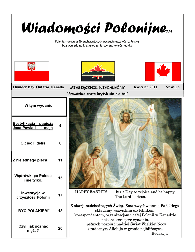 Wiadomosci Polonijne TM Polonia - grupa osób zachowujących poczucie łączności z Polską bez względu na kraj urodzenia czy znajomość języka Thunder Bay, Ontario, Kanada MIESIĘCZNIK NIEZALEŻNY Kwiecień 2011 Nr 4/115 “Prawdziwa cnota krytyk się nie boi” W tym wydaniu: Beatyfikacja papieża Jana Pawła II – 1 maja 5 Ojciec Fidelis 6 Z niejednego pieca 11 Wędrówki po Polsce i nie tylko. 15 Inwestycja w przyszłość Polonii 17 „BYĆ POLAKIEM" 18 Czyli jak poznać męża? 20 HAPPY EASTER! It’s a Day to rejoice and be happy. The Lord is risen. Z okazji nadchodzących Świąt Zmartwychwstania Pańskiego składamy wszystkim czytelnikom, korespondentom, organizacjom i całej Polonii w Kanadzie najserdeczniejsze życzenia, pełnych pokoju i nadziei Świąt Wielkiej Nocy z radosnym Alleluja w gronie najbliższych. Redakcja 2 Wiadomości Polonijne Kwiecień 2011 skracania i edycji nadesłanych tekstów. Redaguje Zespół: Lucy Michalak Tadeusz Michalak Korespondenci: Robert Kania-Thunder Bay Agnieszka Lisak-Polska Alicja Gettlich-Toronto Bohdan Ejbich-Toronto Joanna Adamik-Polska Jakub Adamik-Polska Aleksander Siwiak-Hamilton Waldi-Polska Kazimierz Niechwiadowicz— Polska Opracowanie: Lucy Michalak Wzory reklam zaprojektowanych przez “Wiadomości Polonijne” są własnością wydawnictwa. Kopiowanie i ich publikowanie bez zgody redakcji jest nielegalne. Redakcja “ Wiadomości Polonijnych” zaprasza wszystkich Czytelników do przysyłania własnej twórczości. Mogą to być zarówno wiersze jak i proza. Wyrażone w tekstach opinie należą do autorów i nie zawsze odzwierciedlają stanowisko redakcji. Za treść ogłoszeń i reklam redakcja nie ponosi odpowiedzialności. Wiadomości Polonijne są pismem całkowicie bezpłatnym. Wszelkie koszty związane z drukiem są pokrywane z dotacji. Każda pomoc finansowa jest mile widziana. Wszelkiego rodzaju ogłoszenia i życzenia do “Wiadomości Polonijych” przyjmuje Lucy Michalak tel. 767-4200 Wydawca: Wiadomości Polonijne 236 Masters Street. Thunder Bay, On. P7B 6L5 e-mail: [email protected] http://artspolonia.enginesource.org http://www.polishwinnipeg.com/2010/ Thunderbay.html Termin nadsyłania materiałów do gazety upływa 15-go każdego miesiąca. Redakcja zastrzega sobie prawo Księga Imion – Cezary Cezary charakteryzuje się bardzo zrównoważonym typem charakteru. Jest typowym mężczyzną o trwałych i dobrych cechach charakteru. Jest opanowany i jednocześnie posiada dużą siłę przebicia i żywotność. Jest typem charakteru, który nie kieruje się intuicją, lecz rozumem. Dopiero po osiągnięciu celu sprawdza, czy miał dobre przeczucie. Umiejętnie dobiera przyjaciół i środowisko, które obdarzy go sympatią, tak mu potrzebną. Przysłowie miesiąca Jak przygrzeje słonko, przejdzie kwiecień łąką. PARAFIA MATKI BOŻEJ KRÓLOWEJ POLSKI 93 N. Algoma Str Thunder Bay, On Tel 344-1066 Proboszcz ks. Ireneusz Stadler Msze Św. wtorek-środa 19:00 czwartek—piątek 9:30 niedziela 9:00 (po angielsku) & 10:30 a.m. (po polsku) http://stmary50.blogspot.com Wielkanocny pacierz Nie umiem być srebrnym aniołem – ni gorejącym krzakiem – tyle Zmartwychwstań już przeszło – a serce mam byle jakie. Tyle procesji z dzwonami – tyle już Alleluja – a moja świętość dziurawa na ćwiartce włoska się buja. Wiatr gra mi na kościach mych psalmy jak na koślawej fujarce żeby choć papież spojrzał na mnie - przez białe swe palce. Żeby choć Matka Boska przez chmur zabite wciąż deski – uśmiech mi Swój zesłała jak ptaszka we mgle niebieskiej. I wiem, gdy łzę swoją trzymam jak złoty kamyk z procy – zrozumie mnie mały Baranek z najcichszej Wielkiej Nocy. Pyszczek położy na ręku sumienia wywróci podszewkę – serca mojego ocali czerwoną chorągiewkę. ks. Jan Twardowski PARAFIA ŚW. KAZIMIERZA 613 McKenzie Str Thunder Bay, On Tel 623-3916 Proboszcz o. Andrzej Deptuła Msze Św. wtorek-piątek 8:00 a.m. ( eng/pol.) soboty 5:00 p.m (english) niedziela 9:00a.m.(english) & 10:30 a.m.(polish) Kwiecień 2011 Wiadomości Polonijne WIADOMOŚCI Z POLSKI -Tadeusz Michalak, źródło: Donosy Minister Sikorski wygłosił expose O osiągnięciach i celach polskiej dyplomacji. Wystąpienie szefa MSZ zawierało wiele cytatów z wypowiedzi wybitnych postaci historycznych. Radosław Sikorski zacytował słowa Napoleona: "Przywódca jest ten, kto daje nadzieje". Parę razy zacytował Paderewskiego, m.in. w finale expose: "Polska nie idzie ani w lewo ani na prawo. Gdyby poszła konsekwentnie w jednym lub drugim kierunku i doszła do ostatecznych granic, to by znalazła się albo w rowach reakcji albo w kałużach anarchii. Polska idzie naprzód, ale prosto, prosto". Przytoczył też wypowiedź współczesnego polityka, premiera Donalda Tuska, który odbierając w ubiegłym roku nagrodę Karola Wielkiego w Akwizgranie powiedział "My w Europe i jej przyszłość naprawdę wierzymy". W duchu tej wypowiedzi ma być realizowana polska rezydencja. Premier zaapelował do opozycji O poparcie proponowanych przez rząd zmian w OFE. Donald Tusk powiedział, że "analiza pokazała, że system OFE w obecnym kształcie jest w jakimś sensie odpowiedzialny za 200 mld zł długu z tych 700 mld", które ciążą na polskim państwie. W czasie debaty sejmowej premier powiedział, zmiany w systemie emerytalnym mają zabezpieczyć tych, którzy dzisiaj pobierają emerytury. Występujący później minister Boni wyjaśniał, że przyszłe emerytury przez te zmiany nie będą niższe i nie ma powrotu do składki w wysokości 7,3%. W Sejmie odbyło się pierwsze czytanie rządowego projektu zmiany ustawy dotyczącej systemu emerytalnego oraz omówienie projektu przygotowanego przez PiS. Nie będzie kontrowersyjnych przepisów O Internecie w ustawie medialnej. Premier Tusk powiedział, że zaproponował senatorom, by Senat usunął z ustawy przepisy, regulujące publikowanie w Internecie. Chodzi m.in. przepisy nakładając