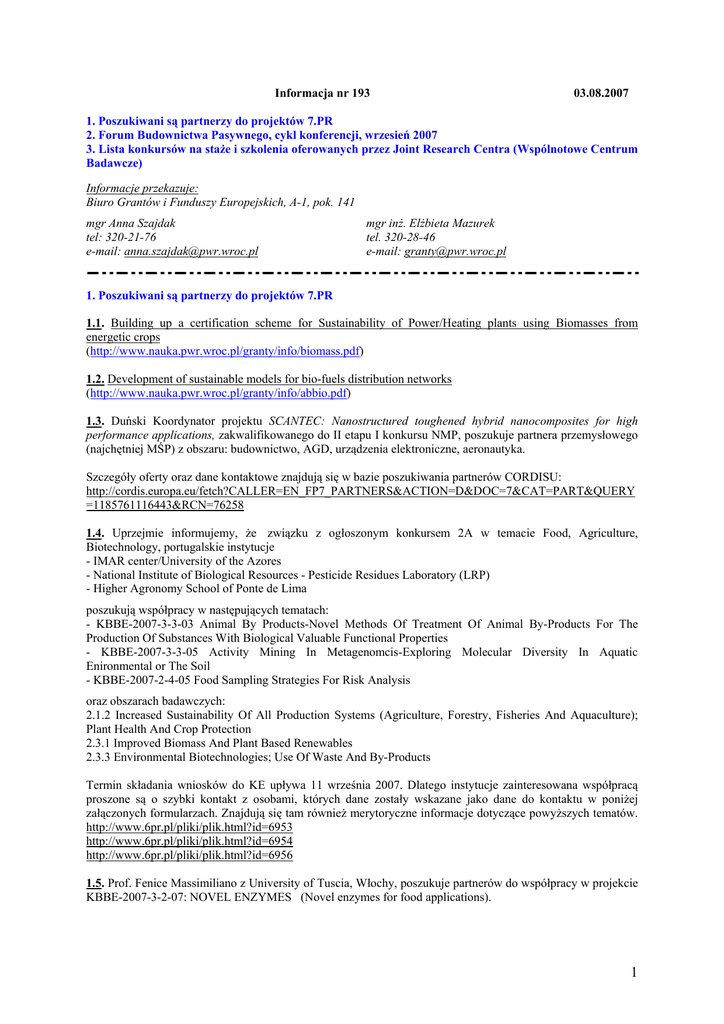 Informacja nr 193 03.08.2007 1. Poszukiwani są partnerzy do