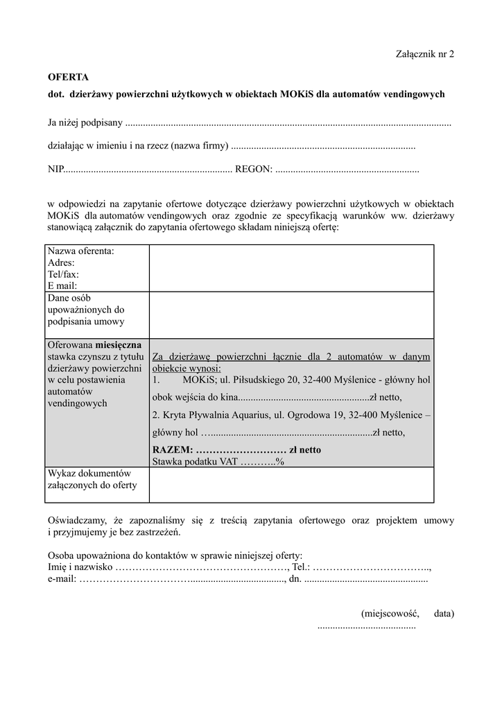 Załącznik nr 2 OFERTA dot. dzierżawy powierzchni użytkowych w obiektach MOKiS dla automatów vendingowych Ja niżej podpisany ................................................................................................................................. działając w imieniu i na rzecz (nazwa firmy) ......................................................................... NIP................................................................... REGON: ......................................................... w odpowiedzi na zapytanie ofertowe dotyczące dzierżawy powierzchni użytkowych w obiektach MOKiS dla automatów vendingowych oraz zgodnie ze specyfikacją warunków ww. dzierżawy stanowiącą załącznik do zapytania ofertowego składam niniejszą ofertę: Nazwa oferenta: Adres: Tel/fax: E mail: Dane osób upoważnionych do podpisania umowy Oferowana miesięczna stawka czynszu z tytułu dzierżawy powierzchni w celu postawienia automatów vendingowych Za dzierżawę powierzchni łącznie dla 2 automatów w danym obiekcie wynosi: 1. MOKiS; ul. Piłsudskiego 20, 32-400 Myślenice - główny hol obok wejścia do kina....................................................zł netto, 2. Kryta Pływalnia Aquarius, ul. Ogrodowa 19, 32-400 Myślenice – główny hol …................................................................zł netto, RAZEM: ……………………… zł netto Stawka podatku VAT ………..% Wykaz dokumentów załączonych do oferty Oświadczamy, że zapoznaliśmy się z treścią zapytania ofertowego oraz projektem umowy i przyjmujemy je bez zastrzeżeń. Osoba upoważniona do kontaktów w sprawie niniejszej oferty: Imię i nazwisko ……………………………………………, Tel.: …………………………….., e-mail: ……………………………....................................., dn. ................................................. (miejscowość, ....................................... data) Załącznik nr 3 UMOWA Zawarta w dniu ….........2014 r pomiędzy: Myślenicki Ośrodek Kultury i Sportu z siedzibą w Myślenicach, ul. Piłsudskiego 20, 32-400 Myślenice NIP: 681-13-53-451, reprezentowanym przez: Małgorzata anita werner - Dyrektora MOKiS, zwanym dalej „Wydzierżawiającym a Firmą ………………………………………………………………………………………………………… z siedzibą w ………………….…………………………………………………………..............… zarejestrowaną w ….............................………………………………………………………….. NIP: ……………………. REGON: ……………………… reprezentowaną przez: ……………………………………………………………………………………………….. zwaną dalej „Dzierżawcą” z drugiej strony o następującej treści: §1 1. Wydzierżawiający oświadcza, że posiada prawo zarządzania powierzchnią stanowiącą przedmiot dzierżawy w obiektach Myślenickiego Ośrodka Kultury i Sportu - MOKiS; ul. Piłsudskiego 20, 32-400 Myślenice - Kryta Pływalnia Aquarius, ul. Ogrodowa 19, 32-400 Myślenice 2. Dzierżawca przejmuje powierzchnię użytkową określoną, o której mowa wyżej z przeznaczeniem na działalność polegającą na postawieniu w wymienionych w ust. 1 obiektach automatów vendingowych zapewniające odpłatnie ciepłe napoje oraz przekąski według poniższego zestawienia: po 2 automaty (1 automat - ciepłe napoje, 2 automat - przekąski i zimne napoje) w każdym z wymienionych obiektów: MOKiS; ul. Piłsudskiego 20, 32-400 Myślenice - główny hol obok wejścia do kina Kryta Pływalnia Aquarius, ul. Ogrodowa 19, 32-400 Myślenice – główny hol 3. Przewidywana powierzchnia na jeden automat wynosi ok. 1,2 m2 . §2 1. Dzierżawca może użytkować dzierżawioną powierzchnię jedynie w sposób zgodny z przyjętym w umowie przeznaczeniem. 2. Wszelkie zmiany, przebudowa, adaptacje czy ulepszenia i przeróbki mogą być dokonane wyłącznie za pisemną zgodą Wydzierżawiającego i zgodnie z obowiązującymi przepisami prawa. 3. Dzierżawca przy prowadzeniu swej działalności nie może powodować zakłóceń czy ograniczeń działalności innych użytkowników pomieszczeń budynków. 4. Dzierżawca bez pisemnej zgody nie może rozporządzać powierzchnią, a w szczególności nie może oddawać powierzchni będącej przedmiotem dzierżawy w podnajem lub użyczać osobom trzecim. 5. Pozostawanie osób związanych z Dzierżawcą po godzinach pracy obiektów lub w dni, w które obiekty są nieczynne, wymaga pisemnej zgody Wydzierżawiającego. 6. Prezentowanie, z wyjątkiem tablicy informacyjnej określającej nazwę Dzierżawcy, innych znaków i reklam na zewnątrz pomieszczeń lub przy ich zewnętrznych częściach wymaga zgody Wydzierżawiającym. 1. §3 Umowa dzierżawy zostaje zawarta od dnia 1.02.2014 r. do dnia 31.01.2015 r. 2. Przekazanie Dzierżawcy przedmiotu dzierżawy nastąpi w dzień podpisania umowy. 3. Działalność, o której mowa w § 1 ust. 2 umowy może być prowadzona 7 dni w tygodniu w godzinach pracy obiektów. 4. Dzierżawca zobowiązuje się do przestrzegania przepisów porządkowych, p.poż, sanitarnych i bezpieczeństwa zawartych w ogólnie obowiązujących przepisach prawnych oraz ustalonych przez Wydzierżawiającego . 5. Dzierżawca po wygaśnięciu umowy zobowiązuje się przekazać użytkowaną powierzchnię i jej przynależności w stanie niepogorszonym, z uwzględnieniem normalnego zużycia. Nakłady i ulepszenia związane na stałe z budynkiem stają się własnością Wydzierżawiającego. 6. Dzierżawca ponosi pełną odpowiedzialność materialną za szkody wyrządzone na skutek swojej działalności w budynku. Koszty związane z usunięciem szkód Dzierżawca pokrywa w ciągu 14 dni od przedłożenia faktury za wykonane prace. 7. Dzierżawca zobowiązany jest na własny koszt utrzymywać d