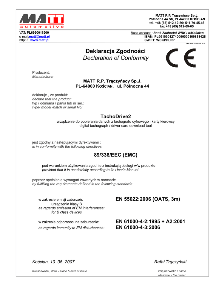 Deklaracja Zgodności Declaration of Conformity Producent: Manufacturer: MATT R.P. Trączyńscy Sp.J. PL-64000 KOŚCIAN, ul. Północna 44 deklaruje , że produkt: declare that the product: typ / odmiana / partia lub nr ser.: type/ model /batch or serial No: TachoDrive2 urządzenie do pobierania danych z tachografu cyfrowego i karty kierowcy digital tachograph / driver card download tool jest zgodny z nastepującymi dyrektywami : is in conformity with the following directives: 89/336/EEC (EMC) pod warunkiem użytkowania zgodnie z instrukcją obsługi w/w produktu provided that it is usedstrictly according to its User’s Manual poprzez spełnienie wymagań zawartych w normach: by fulfilling the requirements defined in the following standards: w zakresie emisji zaburzeń: urządzenia klasy B as regards emission of EM interferences: for B class devices EN 55022:2006 (OATS, 3m) w zakresie odporności na zaburzenia: EN 61000-4-2:1995 + A2:2001 EN 61000-4-3:2006 as regards immunity to EM disturbances: Kościan, 10. 05. 2007 miejscowość , data / place & date of issue Rafał Trączyński imię nazwisko / name właściciel / the owner