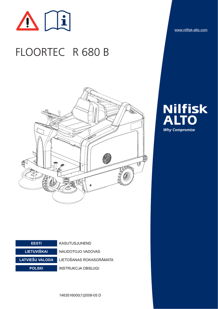 www.nilfisk-alto.com FLOORTEC R 680 B EESTI LIETUVIŠKAI LATVIEŠU VALODA POLSKI KASUTUSJUHEND NAUDOTOJO VADOVAS LIETOŠANAS ROKASGRĀMATA INSTRUKCJA OBSŁUGI 1463516000(1)2008-05 D Модел / Model / Modell / Model / Modelo / Mudel / Modèle / Malli / Model / Μοντέλο / Modell / Modello / Modelis / Modelis / Modell / Model / Modelo / Model / Model / Модель / Modell / Model / Model / Model : Declaração de conformidade Deklaracja zgodności Certificat de conformitate Заявление о соответствии Överensstämmelsecertifikat Certifikát súladu Certifikat o ustreznosti Uyumluluk sertifikası SWEEPER FLOORTEC R 680 B MI Тип / Typ / Typ / Type / Tipo / Tüüp / Type / Tyyppi / Type / Τύπος / Típus / Tipo / Tipas / Tips / Type / Type / Tipo / Typ / Tip / Тип / Typ / Typ / Tip / Tip : Conformity certificate Πιστοποιητικό συμμόρφωσης Megfelelősségi nyilatkozat Dichiarazione di conformità Atitikties deklaracija Atbilstības deklarācija Konformitetssertifisering Conformiteitsverklaring LE Сертификат за съответствие Osvědčení o shodě Konformitätserklärung Overensstemmelsescertifikat Declaración de conformidad Vastavussertifikaat Déclaration de conformité Yhdenmukaisuustodistus Сериен номер / Výrobní číslo / Seriennummer / Serienummer / Número de serie / Seerianumber / Numéro de série / Sarjanumero / Serial number / Σειριακός αριθμός / Sorozatszám / Numero di serie / Serijos numeris / Sērijas numurs / Serienummer / Serienummer / Número de série / Numer seryjny / Număr de serie / Серийный номер / Serienummer / Výrobné číslo / Serijska številka / Seri Numarası : Година на производство / Rok výroby / Baujahr / Fabrikationsår / Año de fabricación / Väljalaskeaasta / Année de fabrication / Valmistusvuosi / Year of construction / Έτος κατασκευής / Gyártási év / Anno di costruzione / Pagaminimo metai / Izgatavošanas gads / Byggeår / Bauwjaar / Ano de fabrico / Rok produkcji / Anul fabricaţiei / Год выпуска / Tillverkningsår / Rok výroby / Leto izdelave / Leto izdelave/İmal yılı : Долуподписаният потвърждава, че гореспоменатият модел е произведен в съответствие със следните директиви и стандарти. The undersigned certify that the above mentioned model is produced in accordance with the following directives and standards. A presente assinatura serve para declarar que os modelos supramencionados são produtos em conformidade com as seguintes directivas e normas. Ο κάτωθι υπογεγραμμένος πιστοποιεί ότι η παραγωγή του προαναφερθέντος μοντέλου γίνεται σύμφωνα με τις ακόλουθες οδηγίες και πρότυπα. Niżej podpisany zaświadcza, że wymieniony powyżej model produkowany jest zgodnie z następującymi dyrektywami i normami. Der Unterzeichner bestätigt hiermit dass die oben erwähnten Modelle gemäß den folgenden Richtlinien und Normen hergestellt wurden. Alulírottak igazoljuk, hogy a fent említett modellt a következő irányelvek és szabványok alapján hoztuk létre. Subsemnatul atest că modelul susmenţionat este produs în conformitate cu următoarele directive şi standarde. Undertegnede attesterer herved, at ovennævnte model er produceret i overensstemmelse med følgende direktiver og standarder. Il sottoscritto dichiara che i modelli sopra menzionati sono prodotti in accordo con le seguenti direttive e standard. Настоящим удостоверяется, что машина вышеуказанной модели изготовлена в соответствии со следующими директивами и стандартами. El abajo firmante certifica que los modelos arriba mencionados han sido producidos de acuerdo con las siguientes directivas y estandares. Toliau pateiktu dokumentu patvirtinama, kad minėtas modelis yra pagamintas laikantis nurodytų direktyvų bei standartų. Undertecknad intygar att ovannämnda modell är producerad i överensstämmelse med följande direktiv och standarder. Allakirjutanu kinnitab, et ülalnimetatud mudel on valmistatud kooskõlas järgmiste direktiivide ja normidega. Ar šo tiek apliecināts, ka augstākminētais modelis ir izgatavots atbilstoši šādām direktīvām un standartiem. Dolu podpísaný osvedčuje, že hore uvedený model sa vyrába v súlade s nasledujúcimi smernicami a normami. Je soussigné certifie que les modèles cidessus sont fabriqués conformément aux directives et normes suivantes. Undertegnede attesterer att ovennevnte modell är produsert i overensstemmelse med fölgende direktiv og standarder. Spodaj podpisani potrjujem, da je zgoraj omenjeni model izdelan v skladu z naslednjimi smernicami in standardi. Allekirjoittaia vakuuttaa että yllämainittu malli on tuotettu seuraavien direktiivien ja standardien mukaan. Ondergetekende verzekert dat de bovengenoemde modellen geproduceerd zijn in overeenstemming met de volgende richtlijnen en standaards. Aşağıda İmzası olan kişi, yukarıda bahsedilen model cihazın aşağıda verilen direktiflere ve standartlara uygunlukta imal edildiğini onaylar. FA CSI Níže podepsaný stvrzuje, že výše uvedený model byl vyroben v souladu s následujícími směrnicemi a normami. EC Machinery Directive Directiv 98/37/EC Dir 89/336/EEC EC C EMC Directive 8 EN ISO 12100-1, EN ISO 12100-2, EN 294, EN 349 EN 60335-1, EN 60335-2-72 EN 61000, EN 50366 Manufacturer: Alto Deutschland GmbH Authorized signatory: Dipl.-Ing. Wolfgang Nieuwkamp Date: 02.01.2007 Signature: Address: Guido-Oberdorfer-Straße 2-8 — D-89287 Bellenberg KASUTUSJUHEND EESTI SISUKORD SISSEJUHATUS ......................................................................................