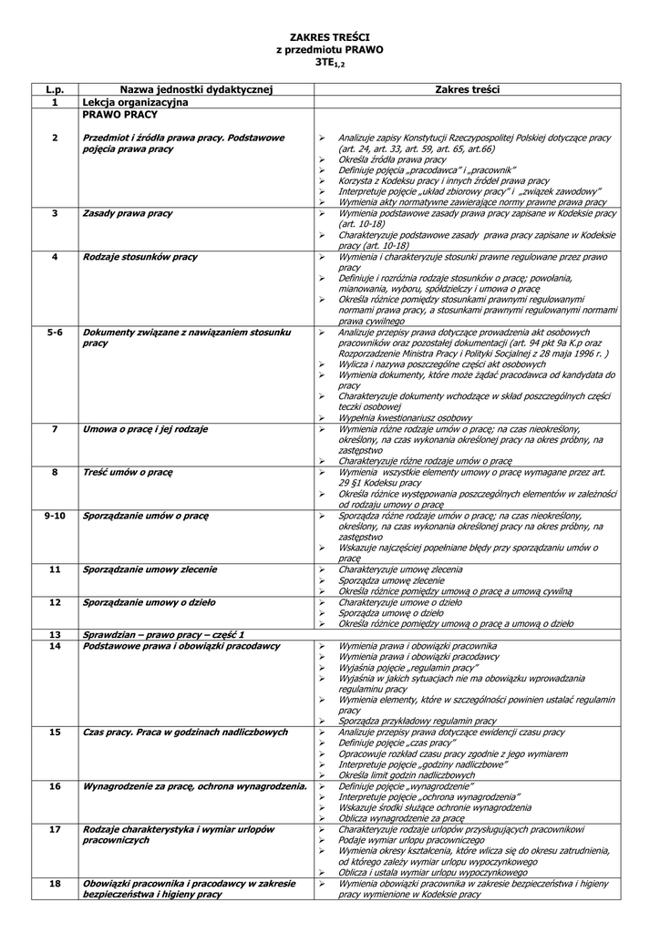 ZAKRES TREŚCI z przedmiotu PRAWO 3TE1,2 L.p. 1 2 3 Nazwa jednostki dydaktycznej Lekcja organizacyjna PRAWO PRACY Przedmiot i źródła prawa pracy. Podstawowe pojęcia prawa pracy Zasady prawa pracy Zakres treści 4 Rodzaje stosunków pracy 5-6 Dokumenty związane z nawiązaniem stosunku pracy 7 Umowa o pracę i jej rodzaje 8 Treść umów o pracę 9-10 Sporządzanie umów o pracę 11 Sporządzanie umowy zlecenie 12 Sporządzanie umowy o dzieło 13 14 Sprawdzian – prawo pracy – część 1 Podstawowe prawa i obowiązki pracodawcy 15 Czas pracy. Praca w godzinach nadliczbowych 16 Wynagrodzenie za pracę, ochrona wynagrodzenia. 17 Rodzaje charakterystyka i wymiar urlopów pracowniczych 18 Obowiązki pracownika i pracodawcy w zakresie bezpieczeństwa i higieny pracy Analizuje zapisy Konstytucji Rzeczypospolitej Polskiej dotyczące pracy (art. 24, art. 33, art. 59, art. 65, art.66) Określa źródła prawa pracy Definiuje pojęcia „pracodawca” i „pracownik” Korzysta z Kodeksu pracy i innych źródeł prawa pracy Interpretuje pojęcie „układ zbiorowy pracy” i „związek zawodowy” Wymienia akty normatywne zawierające normy prawne prawa pracy Wymienia podstawowe zasady prawa pracy zapisane w Kodeksie pracy (art. 10-18) Charakteryzuje podstawowe zasady prawa pracy zapisane w Kodeksie pracy (art. 10-18) Wymienia i charakteryzuje stosunki prawne regulowane przez prawo pracy Definiuje i rozróżnia rodzaje stosunków o pracę; powołania, mianowania, wyboru, spółdzielczy i umowa o pracę Określa różnice pomiędzy stosunkami prawnymi regulowanymi normami prawa pracy, a stosunkami prawnymi regulowanymi normami prawa cywilnego Analizuje przepisy prawa dotyczące prowadzenia akt osobowych pracowników oraz pozostałej dokumentacji (art. 94 pkt 9a K.p oraz Rozporzadzenie Ministra Pracy i Polityki Socjalnej z 28 maja 1996 r. ) Wylicza i nazywa poszczególne części akt osobowych Wymienia dokumenty, które może żądać pracodawca od kandydata do pracy Charakteryzuje dokumenty wchodzące w skład poszczególnych części teczki osobowej Wypełnia kwestionariusz osobowy Wymienia różne rodzaje umów o pracę; na czas nieokreślony, określony, na czas wykonania określonej pracy na okres próbny, na zastępstwo Charakteryzuje różne rodzaje umów o pracę Wymienia wszystkie elementy umowy o pracę wymagane przez art. 29 §1 Kodeksu pracy Określa różnice występowania poszczególnych elementów w zależności od rodzaju umowy o pracę Sporządza różne rodzaje umów o pracę; na czas nieokreślony, określony, na czas wykonania określonej pracy na okres próbny, na zastępstwo Wskazuje najczęściej popełniane błędy przy sporządzaniu umów o pracę Charakteryzuje umowę zlecenia Sporządza umowę zlecenie Określa różnice pomiędzy umową o pracę a umową cywilną Charakteryzuje umowe o dzieło Sporządza umowę o dzieło Określa różnice pomiędzy umową o pracę a umową o dzieło Wymienia prawa i obowiązki pracownika Wymienia prawa i obowiązki pracodawcy Wyjaśnia pojęcie „regulamin pracy” Wyjaśnia w jakich sytuacjach nie ma obowiązku wprowadzania regulaminu pracy Wymienia elementy, które w szczególności powinien ustalać regulamin pracy Sporządza przykładowy regulamin pracy Analizuje przepisy prawa dotyczące ewidencji czasu pracy Definiuje pojęcie „czas pracy” Opracowuje rozkład czasu pracy zgodnie z jego wymiarem Interpretuje pojęcie „godziny nadliczbowe” Określa limit godzin nadliczbowych Definiuje pojęcie „wynagrodzenie” Interpretuje pojęcie „ochrona wynagrodzenia” Wskazuje środki służące ochronie wynagrodzenia Oblicza wynagrodzenie za pracę Charakteryzuje rodzaje urlopów przysługujących pracownikowi Podaje wymiar urlopu pracowniczego Wymienia okresy kształcenia, które wlicza się do okresu zatrudnienia, od którego zależy wymiar urlopu wypoczynkowego Oblicza i ustala wymiar urlopu wypoczynkowego Wymienia obowiązki pracownika w zakresie bezpieczeństwa i higieny pracy wymienione w Kodeksie pracy 19 Wypadki przy pracy i choroby zawodowe – analiza aktów normatywnych 20 Uprawnienia pracowników związane z rodzicielstwem 21 Odpowiedzialność porządkowa i dyscyplinarka pracowników 22 Odpowiedzialność materialna i jej rodzaje 23 Sposoby ustania stosunku pracy 24 Okresy wypowiedzenia umowy o pracę 25 Rozwiązanie umowy o pracę bez wypowiedzenia 26 Świadectwo pracy i jego elementy 27 28 Sprawdzian – prawo pracy – część 2 Zatrudnianie młodocianych. Szczególna ochrona pracy młodocianych 29 Umowa o pracę w celu przygotowania zawodowego oraz w innych celach 30 Organy państwowe sprawujące nadzór nad warunkami pracy 31 Organy doradcze pracodawcy w zakresie bezpieczeństwa i higieny pracy. Społeczna inspekcja pracy Wykroczenia przeciwko prawom pracownika określone w Kodeksie pracy 32 33 Wykroczenia przeciwko prawom pracownika określone w innych aktach normatywnych 34 Przedawnienie roszczeń ze stosunku pracy 35 Spory ze stosunku pracy . Opłaty sądowe w sprawach z zakresu prawa pracy 36 Pośrednictwo pracy i ochrona bezrobotnych Wymienia obowiązki pracodawcy w zakresie bezpieczeństwa i higieny pracy wymienione w Kodeksie pracy Charakteryzuje obowiązki pracownika i pracodawcy w zakresie bezpieczeństwa i higieny pracy Charakteryzuje pojęcie „wypadek przy pracy” i „choroba zawodowa Analizuje akty normatywne dotyczące wypadków przy pracy i chorób zawodowych Wymienia i omawia warunki ochrony kobiet w pracy – kobiety ciężarnej i kobiety karmiącej Charakteryzuje uprawnienia pracowników związane z rodzicielstwem – urlop macierzyński, urlop ojcowski Wymienia warunki otrzymania i korzystania z urlopu wychowawczego Oblicza wymiar urlopu macierzyńskiego, dodatkowego urlopu macierzyńskiego i urlopu ojcowskiego Wymienia i charakteryzuje rodzaje odpowiedzialności pracowniczej Określa tryb nakładania kar porządkowych Określa tryb wniesienia sprzeciwu w związku z nałożeniem na 