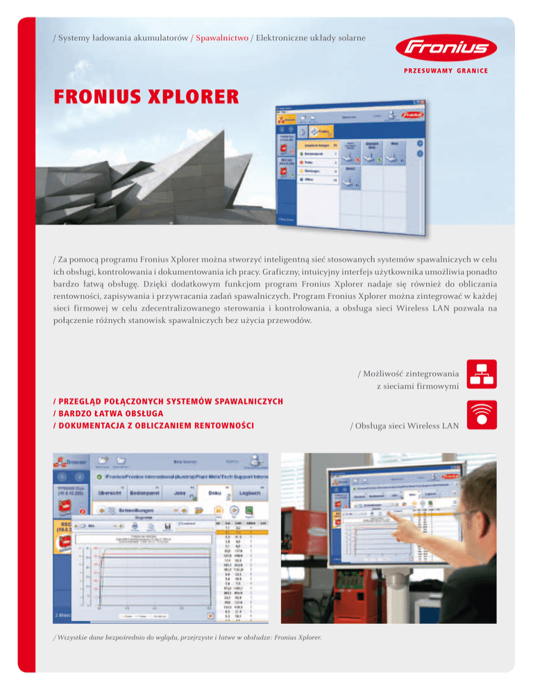 / Systemy ładowania akumulatorów / Spawalnictwo / Elektroniczne układy solarne fronius xplorer / Za pomocą programu Fronius Xplorer można stworzyć inteligentną sieć stosowanych systemów spawalniczych w celu ich obsługi, kontrolowania i dokumentowania ich pracy. Graficzny, intuicyjny interfejs użytkownika umożliwia ponadto bardzo łatwą obsługę. Dzięki dodatkowym funkcjom program Fronius Xplorer nadaje się również do obliczania rentowności, zapisywania i przywracania zadań spawalniczych. Program Fronius Xplorer można zintegrować w każdej sieci firmowej w celu zdecentralizowanego sterowania i kontrolowania, a obsługa sieci Wireless LAN pozwala na połączenie różnych stanowisk spawalniczych bez użycia przewodów. / Możliwość zintegrowania z sieciami firmowymi / Przegląd połączonych systemów spawalniczych / Bardzo łatwa obsługa / Dokumentacja z obliczaniem rentowności / Wszystkie dane bezpośrednio do wglądu, przejrzyste i łatwe w obsłudze: Fronius Xplorer. / Obsługa sieci Wireless LAN dokumentacja /Dokumentacja wartości zadanych /Dokumentacja rzeczywistych wartości bieżących, numerów podzespołów, wartości zużycia z obliczeniem rentowności i obliczanie energii na danym odcinku (kJ/cm) /Prezentacja wykresu i dziennika zdarzeń, umożliwiająca łatwe śledzenie przebiegu pracy /Funkcja eksportu, umożliwiająca dalszą obróbkę danych w programie Excel / Systemy ładowania akumulatorów / Spawalnictwo / Elektroniczne układy solarne DZIAŁAMY W TRZECH DZIEDZINACH, LECZ MAMY JEDNĄ PASJĘ: PRZESUWAMY GRANICE. / Niezależnie od tego, czy chodzi o systemy ładowania baterii, spawalnictwo czy elektroniczne układy solarne – nasze aspiracje są jasno określone: Być liderem technologii i jakości. Wraz z ponad trzema tysiącami naszych pracowników na całym świecie przesuwamy granice możliwości, czego dowodem jest 737 aktywnych patentów. Tam gdzie inni stawiają małe kroki, my wykonujemy skoki w rozwoju. Jak zawsze. Dalsze informacje na temat wszystkich produktów firmy Fronius oraz naszych partnerów handlowych i przedstawicieli można uzyskać na stronie internetowej www.fronius.com. v03 2011 PL Fronius International GmbH Froniusplatz 1 4600 Wels Austria Telefon +43 7242 241-0 Telefaks +43 7242 241-3940 [email protected] www.fronius.com PL v01 2011 aw11 Eksplorator zadań /Szybkie i ergonomiczne sterowanie wszystkimi połączonymi systemami spawalniczymi za pomocą jednego centralnego stanowiska dyspozytorskiego /Edytowanie i kopiowanie zadań /Historia zadań umożliwiająca łatwe przywracanie i porównywanie wielu zapisanych zadań Tekst oraz ilustracje odpowiadają stanowi technicznemu w momencie oddania instrukcji do druku. Zastrzega się możliwość wprowadzenia zmian. Bez pisemnej zgody firmy Fronius International GmbH dokumentu niniejszego nie wolno kopiować w całości, ani w części, ani też powielać w jakiejkolwiek innej formie. przegląd statusu /Możliwość skonfigurowania różnych profili użytkowników o różnych poziomach uprawnień /Funkcja tworzenia i przywracania kopii zapasowej, umożliwiająca zabezpieczenie danych /Wskazywanie statusu wszystkich systemów spawalniczych w sieci na graficznym interfejsie użytkownika przy użyciu jednoznacznych symboli