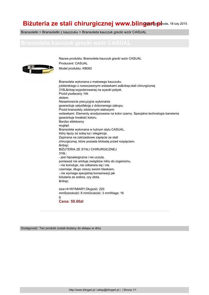 Utworzono: środa, 18 luty 2015 Biżuteria ze stali chirurgicznej www.blingart.pl Bransoletki > Bransoletki z kauczuku > Bransoleta kauczuk grecki wzór CASUAL Bransoleta kauczuk grecki wzór CASUAL Nazwa produktu: Bransoleta kauczuk grecki wzór CASUAL Producent: CASUAL Model produktu: KB062 Bransoleta wykonana z matowego kauczuku jubilerskiego z nowoczesnymi wstawkami ze stali chirurgicznej 316L wypolerowanej na wysoki połysk. Przód pozłacany 14k złotem. Niesamowicie precyzyjne wykonanie gwarantuje satysfakcję z dokonanego zakupu. Przód bransolety zdobionymi stalowymi wstawkami. Elementy anodyzowane na kolor czarny. Specjalna technologia barwienia gwarantuje trwałość koloru. Bardzo efektowny wygląd. Bransoleta wykonana w luźnym stylu CASUAL, który łączy ze sobą luz i elegancje. Zapinana na zatrzaskowe zapięcie ze stali chirurgicznej, które posiada blokadę przed rozpięciem. BIŻUTERIA ZE STALI CHIRURGICZNEJ 316L: - jest hipoalergiczna i nie uczula, ponieważ nie emituje związków niklu do organizmu, - nie koroduje, nie odbarwia się i nie czernieje, długo cieszy swoim blaskiem, - nie wymaga specjalnej konserwacji jak biżuteria ze srebra, czy złota. size=4>WYMIARY:Długość: 220 mmSzerokość: 8 mmGrubość: 3 mmWaga: 16 g Cena: 50.00zł Dostępność: Ten produkt został dodany do sklepu w dniu http://www.blingart.pl | [email protected] | | Strona 1/1