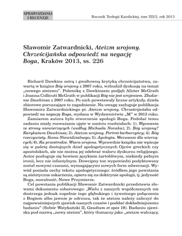 SPRAWOZDANIA I RECENZJE Rocznik Teologii Katolickiej, tom XII/2, rok 2013 Sławomir Zatwardnicki, Ateizm urojony. Chrześcijańska odpowiedź na negację Boga, Kraków 2013, ss. 226 Richard Dawkins ostrą i gwałtowną krytyką chrześcijaństwa, zawartą w książce Bóg urojony z 2007 roku, wzbudził dyskusję na temat „nowego ateizmu”. Polemikę z Dawkinsem podjęli Alister McGrath i Joanna Collicutt McGrath w publikacji Bóg nie jest urojeniem. Złudzenie Dawkinsa z 2007 roku. Po nich powstawały liczne artykuły, dzieła zbiorowe poruszające to zagadnienie. Na uwagę zasługuje publikacja Sławomira Zatwardnickiego pt. Ateizm urojony. Chrześcijańska odpowiedź na negację Boga, wydana w Wydawnictwie „M” w 2013 roku. Zamiarem autora było stworzenie apologii Boga. Podołać temu zadaniu miały rozważania ujęte w sześciu rozdziałach: 1). Wyzwania ze strony niewierzących (według Michaela Novaka); 2). Bóg urojony? Karykatura Dawkinsa; 3). Ateizm urojony. Portret barbarzyńcy; 4). Bóg rzeczywisty. Ikona Niewidzialnego; 5). Apologia. Wezwanie dla wierzących; 6). Ku przestrodze. Wiara urojona. Wprawdzie książka nie wpisuje się w paletę dostojnych dzieł apologetycznych Ojców greckich czy apostolskich, ale nie można jej odebrać waloru dyskursu religijnego. Autor posługuje się bowiem językiem żartobliwym, niekiedy pełnym ironii, lecz nie infantylnym. Dowcipny ton wypowiedzi podyktowany został nowymi czasami, wymagającymi nowych form adwersacji. Wywód posiada cechy tekstu apologetycznego: źródłem jego powstania są ateistyczne oskarżenia, opiera się na doktrynie apologii, tj. jedyność Boga, moralność, Nowe Przymierze. Cel powstania publikacji Sławomir Zatwardnicki przedstawia słowami dokumentu soborowego: „Wielu z naszych współczesnych nie dostrzega jednak zupełnie tego głębokiego i żywotnego połączenia z Bogiem albo jawnie je odrzuca, tak że ateizm należy zaliczyć do najpoważniejszych zjawisk naszych czasów i poddać dokładniejszemu badaniu” (Sobór Watykański II, Gaudium et spes 19). Badaniu zjawiska pod nazwą ,,nowy ateizm”, który tłumaczy jako ,,ateizm walczący, 266 Ks. Andrzej Proniewski agresywny, posługujący się zwulgaryzowaną formą znanych od dawna argumentów ateistycznych” (s. 10), poświęcił omawianą książkę. Swoją analizę autor rozpoczął od przybliżenia osoby Michaela Novaka, który w publikacji pt. Boga nikt nie widzi. Noc ciemna ateistów i wierzących z 2010 roku przedstawił argumenty współczesnych ateistów. Kontynuuje je przez dalsze paragrafy z merytoryczną konsekwencją. Zarysowany przez niego punkt wyjścia ateistycznej negacji istnienia Boga, a mianowicie problem zła, cechuje znajomość nie tylko literatury przedmiotu, ale i wynikanie psychologiczne, przez co wyłania się erudycja autora, połączona z wieloaspektową znajomością poruszanej tematyki. Stawiane przez niego pytania retoryczne, jako konsekwencja doSprawozdania głębnej dedukcji, niekiedy zdają się nużyć. W swym założeniu jednak i recenzje są próbą nawiązania dialogu z czytelnikiem, by nie był on jedynie odbiorcą wiedzy w omawianym zagadnieniu, lecz mógł, poprzez zaangażowanie umysłu, podążyć z autorem drogą odkrywania ideologii ateistycznej, za którą kryje się konkretna osobowość ludzka, którą należy zgłębić, w celu dotknięcia istoty bezbożnego światopoglądu. Autor dokonał rozróżnienia ateizmu na antropologiczny, scjentystyczny i dogmatyczny, w tym ostatnim upatrując największe zagrożenie, ze względu na barbarzyńskość ataków jego głównych reprezentantów, tj. Richarda Dawkinsa i Christophera Hitchensa. Polemika jest obecna w całej publikacji. Charakteryzuje się wnikliwością badawczą, precyzją argumentacji. Krok po kroku Zatwardnicki obala ateistyczne tezy, demaskując ich „opętanie materializmem” (s. 55). Stąd tłumaczy użycie określenia „ateizmu urojonego”: „Jeśli «nowy ateizm» nazywam urojonym, to dlatego, że jego reprezentanci okazują się bardziej barbarzyńscy niż można było się tego spodziewać po osobach dokonujących życiowego wyboru” (s. 75). Po omówieniu źródeł i istoty ,,nowego ateizmu”, wzorem teologii pastoralnej, autor formułuje metody walki z tym zjawiskiem. Wśród nich wymienia: zgodę na to, by Bóg był sobą (s. 131), ukazywanie Boga jako przyjaciela każdego człowieka (s. 138), umiłowanie Boga i Kościoła (s. 144), odniesienie biblijnego słowa do współczesnej egzystencji (s. 145), ograniczenie aktywizmu na rzecz żywej obecności (s. 171), praktykowanie rozumnej wiary (s. 173), odczytywanie znaków czasu: tendencji kreacji Boga starotestamentalnego, głęboko zakorzenionego indyferentyzmu (s. 177-180). W oparciu o wyżej wymienione postulaty, autor formułuje wniosek: „Na pierwszym miejscu należy postawić budzenie wiary, a dopiero na drugim – apologię, która sama w sobie nie doprowadzi nikogo do wiary” (s. 181), gdyż „niewiara współczesna Sławomir Zatwardnicki, Ateizm urojony. Chrześcijańska odpowiedź... 267 idzie dokładnie po śladach objawiającego się Boga, tyle że w odwrotnym kierunku […]. Odrzucenie tego objawiającego się Boga poszło szlakiem łagodzenia zgorszenia tak bliskim Bogiem” (s. 177). Konkluzja ta winna stać się drogowskazem w sporze z ateistami, którzy nie są sensu stricte wrogami, lecz ludźmi poszukującymi. Dialog z nimi zatem, zdaniem autora, powinien stać się misją ewangelizacyjną. Ma być ona oparta nie na nawróceniu, lecz służbie (s. 195). Dzięki apologetyczno-pastoralnemu charakterowi książki, czytelnik znajduje skarbnicę materiałów o „nowym ateizmie”: potrzebną wiedzę i konkretne metody działania, przydatne nawet w codziennych spotkaniach z ludźmi wątpiącymi czy niewierzącymi. Dzięki temu dualizmowi publikacja wpisuje się w nurt „nowej ewangelizacji”, wychodzącej naprzeciw „nowemu ateizmowi” i jest cennym gł