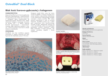 OsteoBiol® Dual-Block Blok kości korowo-gąbczastej z kolagenem CHARAKTERYSTYKA Materiał Dual-Block jest to korowo-gąbczasty blok kości heterologicznej o właściwościach osteokondukcyjnych. Może być stosowany w zabiegach, gdzie przeprowadza się regenerację dużych obszarów kości: dzięki zawartości kolagenu wspomaga tworzenie się skrzepu krwi i w efekcie migrację komórek regenerujących i naprawczych, wszczep ulega stopniowej resorpcji w czasie, w którym powstaje nowa kość na skutek działania osteoblastów. STOSOWANIE Dual-Block musi być nawilżony poprzez zanurzenie w ciepłym roztworze soli fizjologicznej lub antybiotyku przez 5-10 minut. Następnie kształt bloku może być dostosowany do defektu, a miejsce wszczepu musi zostać poddane odpowiedniej dekortykacji w celu zapewnienia maksymalnego kontaktu wszczepu z kością wyrostka. Blok należy zawsze unieruchomić w polu za pomocą mikrośrub. Dual-Block stosuje się w zabiegach augmentacji silnie zresorbowanego wyrostka szczęki. Jakąkolwiek zastosuje się w tym celu technikę, zaleca się wypełnienie pozostałych wolnych przestrzeni wokoło bloku materiałem w formie granulatu, aby uzyskać potrzebną objętość i kontur wypełnienia. Tkanka pochodzenia blok heterologicznej kości korowo-gąbczastej OsteoBiol® Dual-Block Źródło: Tecnoss® Dental Media Library Kolagen tkankowy Zachowany Forma fizyczna Sztywny suchy blok kostny Skład 100% kości Czas re-entry ok. 8 miesięcy, zależnie od cech i stopnia ukrwienia pola i stanu klinicznego pacjenta Opakowanie Sterylny blister OsteoBiol® Dual-Block odpowiednio ukształtowany, przymocowany za pomocą śrub do osteosyntezy i otoczony granulatem kostnym. Źródło: Courtesy of Dr Roberto Rossi, Genova, Włochy Obraz SEM OsteoBiol® Dual-Block Źródło: Politecnico di Torino, Włochy 88 OsteoBiol® Dual-Block wszczepiony w technice inlay Źródło: Tecnoss® Dental Media Library Kody produktu STS7S | 20x15x5 mm | Wieprzowy wygięty STN4B | 20x15x5 mm | Wołowy STN5B | 20x10x5 mm | Wołowy wygięty STN6B | 20x20x5 mm | Wołowy wygięty