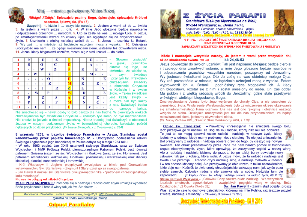 Alleluja! Alleluja! Śpiewajcie psalmy Bogu, śpiewajcie, śpiewajcie Królowi naszemu, śpiewajcie. (Ps 47) Uzupełnij: 1. Idźcie i … wszystkie narody. 2. Jestem z wami aż do … świata 3. Ja jestem z wami przez … dni. 4. W imię Jego głoszone będzie nawrócenie i odpuszczenie grzechów … narodom. 5. Oto Ja ześlę na was … mojego Ojca. 6. Jezus, po zmartwychwstaniu wszedł do chwały Ojca, nie oglądając się na dotychczasowe … życie. 7. Uczniowie z wielką radością wrócili do … 8. Jezus … uczniów ku Betanii. 9. Wy zaś … w mieście, aż będziecie uzbrojeni mocą z wysoka. 10. Dzisiejsza uroczystość ma nam … że będąc mieszkańcami ziemi, jesteśmy też obywatelami nieba. 11. Jezus, kiedy błogosławił uczniów, rozstał się z nimi i został … do nieba. Słowem „świadek” w języku prawników x x określa się tego, kto x x K E x stwierdza, że widział to, x x W Z M x o czym świadczy x x x O N Ę i przy tym był. Prawdziwy chrześcijanin świadczy x x x Z K E x o obecności Chrystusa x x J R L Y w Kościele i w swoim x W P D Ł życiu. – Takim świadkiem P Z S C E x jest każdy święty – 10 P Z P N Ć x a może nim być każdy z nas. Świadczyć trzeba x x x 11 U I Y do samego końca. Nie zniechęcać się – nawet gdyby to było bardzo dla nas trudne. W pierwszych wiekach chrześcijaństwa być świadkiem Chrystusa – znaczyło tyle samo, co być męczennikiem. Nie chodzi tu jedynie o śmierć męczeńską. Nieraz trudniej jest świadczyć o obecności Jezusa w naszym codziennym życiu: w beznadziejnej chorobie, kalectwie, pośród nękających co dzień przykrości. [W świetle Ewangelii, x J. Twardowski, s. 284]; 1 2 3 4 5 6 7 8 9 N S U O W Z C Z J E S T E M Z W A M I E A x x 8 września 1253, w bazylice świętego Franciszka w Asyżu, Stanisław został kanonizowany przez papieża Innocentego IV. - Uroczystość podniesienia relikwii Świętego i ogłoszenia jego kanonizacji w Polsce odbyła się 8 maja 1254 roku. - W roku 1963 papież Jan XXIII ustanowił świętego Stanisława, wraz ze Świętym Wojciechem i NMP Królową Polski, pierwszorzędnym Patronem Polski. Jest również patronem Gniezna (razem ze św. Wojciechem) i Krakowa (wraz ze św. Florianem). Jest patronem archidiecezji krakowskiej, lubelskiej, poznańskiej i warszawskiej oraz diecezji kieleckiej, płockiej, sandomierskiej i tarnowskiej - Król Władysław II Jagiełło przypisywał zwycięstwo w bitwie pod Grunwaldem wstawiennictwu Św. Stanisława; - Zygmunt I Stary uznał go za swego patrona. - Jan Paweł II nazwał św. Stanisława biskupa-męczennika - "patronem chrześcijańskiego ładu moralnego". Nic nas nie odłączy od miłości Chrystusa MOJE POSTANOWIENIE: Pomodlę się o nadzieję i radość oraz abym umiał(a) wypełniać Boże przykazania i bronić wiary tak jak św. Stanisław … Kancelaria Parafialna e-mail : [email protected] http://www.stanislaw-bm.pl/ [gazetka do użytku wewnętrznego Parafii] Stanisława Biskupa Męczennika na Woli; 01-244 Warszawa; ul. Bema 73/75, Kancelaria Parafialna czynna: poniedziałek – piątek godz. 9:00 - 10:00; 16:00 - 17:30; tel. 22 632 38 00 9 V – PN. – UROCZYSTOŚĆ ŚW. STANISŁAWA BISKUPA - MĘCZENNIKA SUMA ODPUSTOWA O GODZINIE 18.00. ZAPRASZAMY WSZYSTKICH DO WSPÓLNEGO ŚWIĘTOWANIA I MODLITWY Idźcie i nauczajcie wszystkie narody, Ja jestem z wami przez wszystkie dni, aż do skończenia świata. (Mt 28) Łk 24,46-53 Jezus powiedział do swoich uczniów: Tak jest napisane: Mesjasz będzie cierpiał i trzeciego dnia zmartwychwstanie, w imię Jego głoszone będzie nawrócenie i odpuszczenie grzechów wszystkim narodom, począwszy od Jerozolimy. Wy jesteście świadkami tego. Oto Ja ześlę na was obietnicę mojego Ojca. Wy zaś pozostańcie w mieście, aż będziecie uzbrojeni mocą z wysoka. Potem wyprowadził ich ku Betanii i podniósłszy ręce błogosławił ich. A kiedy ich błogosławił, rozstał się z nimi i został uniesiony do nieba. Oni zaś oddali Mu pokłon i z wielką radością wrócili do Jerozolimy, gdzie stale przebywali w świątyni, wielbiąc i błogosławiąc Boga. Zmartwychwstanie Jezusa było Jego wejściem do chwały Ojca, a nie powrotem do ziemskiego życia. Wydarzenie Wniebowstąpienia było zakończeniem okresu ukazywania się zmartwychwstałego Pana uczniom. Dla nas jest ono rękojmią i obietnicą naszego wzięcia do nieba. Dzisiejsza uroczystość jest też dla nas przypomnieniem, że będąc mieszkańcami ziemi, jesteśmy obywatelami nieba. [Ks. Maciej Zachara MIC, „Oremus” Okres Wielkanocny 2004, s. 170]. Ojciec św. Franciszek – Prawdziwy chrześcijanin nie znieczula swego bólu, lecz przeżywa go w nadziei, że Bóg da mu radość, której nikt mu nie odbierze… To jest to, co mogą sprawić razem radość i nadzieja w naszym życiu, kiedy jesteśmy w udręce, kiedy mamy problemy, kiedy cierpimy. To nie jest znieczulenie. Ból przeżywany z radością i nadzieją otwiera drzwi do tego, by cieszyć się nowym owocem. Ten obraz przedstawiony przez Pana ma nam bardzo pomóc w trudnościach, często nieprzyjemnych, złych, które sprawiają, że zaczynamy wątpić w naszą wiarę. Ale z radością i nadzieją idziemy do przodu, bo po takiej burzy powstaje nowy człowiek, tak jak u kobiety, która rodzi. A Jezus mówi, że ta radość i nadzieja jest trwała i nie przemija … Radość czyni nadzieję silną, a nadzieja rozkwita w radości. I w ten sposób idziemy dalej. Ale przeżywamy je obie razem, z takim nastawieniem, jakie daje nam Kościół: te dwie cnoty chrześcijańskie wskazują nam, jak wyjść poza siebie samych. Człowiek radosny nie zamyka się w sobie. Nadzieja tam cię zaprowadzi; … [z kaplicy Domu św. Marty: nadzieja otwiera na radość życia, 06 V 16]. Stefan Kardynał Wyszyński – „Człowiek Boży zawsze budzi nadzieję! We wszystkich ludziach smutnych, zgorzkniałych i zwątpiałych pogłębia wiarę w słodką, Bożą Opatrzność.” [2 Kr