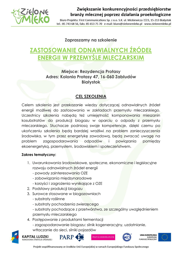 Zapraszamy na szkolenie ZASTOSOWANIE ODNAWIALNYCH ŹRÓDEŁ ENERGII W PRZEMYŚLE MLECZARSKIM Miejsce: Rezydencja Protasy Adres: Kolonia Protasy 47, 16-060 Zabłudów Białystok CEL SZKOLENIA Celem szkolenia jest przekazanie wiedzy dotyczącej odnawialnych źródeł energii możliwej do zastosowania w zakładach przemysłu mleczarskiego. Uczestnicy szkolenia nabędą też umiejętność komponowania mieszanin kosubstratów do produkcji biogazu w oparciu o odpady z przemysłu mleczarskiego. Słuchacze podniosą swoje kompetencje, dzięki czemu po ukończeniu szkolenia będą bardziej wrażliwi na problem zanieczyszczenia środowiska, w tym przez energetykę zawodową, będą zwracać uwagę na problem zagospodarowania odpadów i powiązania pomiędzy ekoenergetyką, przemysłem, środowiskiem i społeczeństwem. Zakres tematyczny: 1. Uwarunkowania środowiskowe, społeczne, ekonomiczne i legislacyjne rozwoju odnawialnych źródeł energii - powody zainteresowania OZE - zobowiązania międzynarodowe - korzyści i zagrożenia wynikające z OZE 2. Podstawy produkcji biogazu 3. Surowce stosowane w biogazowniach - substraty roślinne - substraty pochodzenia zwierzęcego - substraty pochodzące z przetwórstwa, ze szczególny uwzględnieniem przemysłu mleczarskiego 4. Postępowanie z produktami fermentacji - zagospodarowanie biogazu: silnik kogeneracyjny, uzdatnianie, wtłaczanie do sieci, silniki pojazdów - zagospodarowanie masy pofermentacyjnej: nawożenie, spalanie, kompostowanie 5. Uwarunkowania prawne rozwoju biogazowni w Polsce 6. Zagospodarowanie ciepła odpadowego powstającego w wybranych procesach w przemyśle mleczarskim 7. Termochemiczne metody konwersji biomasy - spalanie - piroliza - zgazowanie - uwęglanie (karbonizaja) 8. Możliwości wykorzystania energii słońca w przemyśle mleczarskim kolektory słoneczne, podgrzewanie wody - ogniwa fotowoltaiczne 9. Możliwości wykorzystania energii wiatru w przemyśle mleczarskim - typy wiatraków - dobór urządzeń w zależności od warunków przestrzennych 10. Energia geotermalna – potencjał a realia 11. Dobre praktyki w zakładach przemysłu mleczarskiego i przykłady dotyczące odnawialnych źródeł energii 12. Część praktyczna - obliczanie wydajności biogazowej wybranych receptur kosubstratów, zawierających odpady z przemysłu mleczarskiego - ocena wydajności energetycznej zastosowanych receptur TRENER Alinna Kowalczyk-Juśko - autorka bądź współautorka ponad 200 publikacji naukowych i popularnych, w większości dotyczących odnawialnych źródeł energii. Autorka rozdziałów w monografiach naukowych: „Podkarpacka bioenergetyka”, „Rośliny energetyczne”, „Biogaz – odnawialne źródło energii”. Współautorka strategii i analiz dotyczących wykorzystania odnawialnych źródeł energii w przedsiębiorstwach i na zlecenie jednostek samorządu terytorialnego. Uczestniczyła w kilkudziesięciu konferencjach naukowych, seminariach i szkoleniach jako wykładowca, w tym dla rolników, przedsiębiorstw, administracji publicznej. Współpracowała z przedsiębiorstwami produkującymi energię ze źródeł odnawialnych: biogazownie (w tym biogazownia w Piaskach, wykorzystująca serwatkę z mleczarni), peleciarnie, brykieciarnie, producenci zrębki, instalatorzy urządzeń solarnych i fotowoltaicznych. Posiada bogate doświadczenie szkoleniowe.
