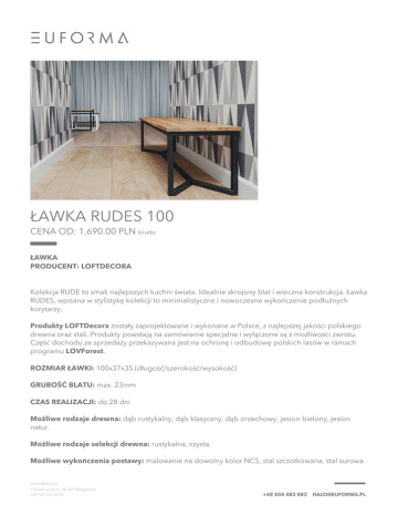 ŁAWKA RUDES 100 CENA OD: 1,690.00 PLN brutto ŁAWKA PRODUCENT: LOFTDECORA Kolekcja RUDE to smak najlepszych kuchni świata. Idealnie skrojony blat i wieczna konstrukcja. Ławka RUDES, wpisana w stylistykę kolekcji to minimalistyczne i nowoczesne wykończenie podłużnych korytarzy. Produkty LOFTDecora zostały zaprojektowane i wykonane w Polsce, z najlepszej jakości polskiego drewna oraz stali. Produkty powstają na zamówienie specjalne i wyłączone są z możliwości zwrotu. Część dochodu ze sprzedaży przekazywana jest na ochronę i odbudowę polskich lasów w ramach programu LOVForest. ROZMIAR ŁAWKI: 100x37x35 (długość/szerokość/wysokość) GRUBOŚĆ BLATU: max. 23mm CZAS REALIZACJI: do 28 dni Możliwe rodzaje drewna: dąb rustykalny, dąb klasyczny, dąb orzechowy, jesion bielony, jesion natur. Możliwe rodzaje selekcji drewna: rustykalna, czysta. Możliwe wykończenia postawy: malowanie na dowolny kolor NCS, stal szczotkowana, stal surowa. Powered by TCPDF (www.tcpdf.org)