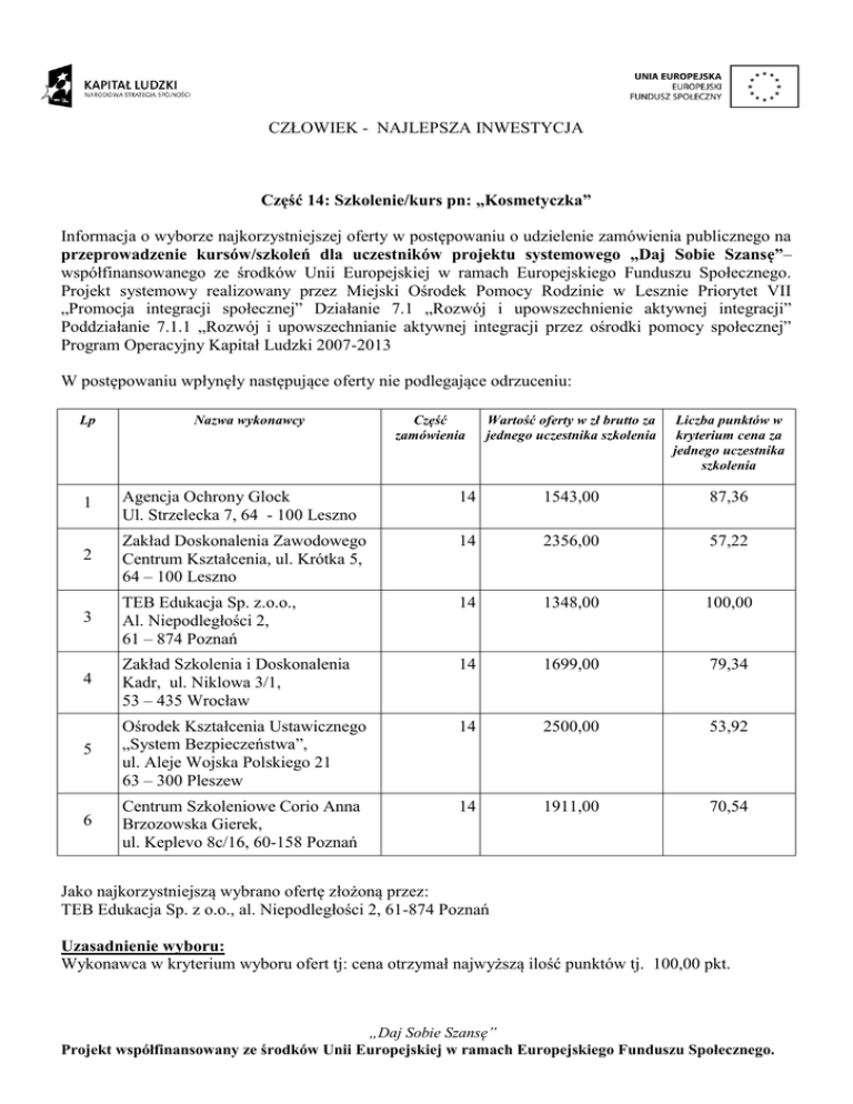 CZŁOWIEK - NAJLEPSZA INWESTYCJA Część 14: Szkolenie/kurs pn: „Kosmetyczka” Informacja o wyborze najkorzystniejszej oferty w postępowaniu o udzielenie zamówienia publicznego na przeprowadzenie kursów/szkoleń dla uczestników projektu systemowego „Daj Sobie Szansę”– współfinansowanego ze środków Unii Europejskiej w ramach Europejskiego Funduszu Społecznego. Projekt systemowy realizowany przez Miejski Ośrodek Pomocy Rodzinie w Lesznie Priorytet VII „Promocja integracji społecznej” Działanie 7.1 „Rozwój i upowszechnienie aktywnej integracji” Poddziałanie 7.1.1 „Rozwój i upowszechnianie aktywnej integracji przez ośrodki pomocy społecznej” Program Operacyjny Kapitał Ludzki 2007-2013 W postępowaniu wpłynęły następujące oferty nie podlegające odrzuceniu: Lp Nazwa wykonawcy Część zamówienia Wartość oferty w zł brutto za jednego uczestnika szkolenia Liczba punktów w kryterium cena za jednego uczestnika szkolenia 1 Agencja Ochrony Glock Ul. Strzelecka 7, 64 - 100 Leszno 14 1543,00 87,36 Zakład Doskonalenia Zawodowego Centrum Kształcenia, ul. Krótka 5, 64 – 100 Leszno 14 2356,00 57,22 2 3 TEB Edukacja Sp. z.o.o., Al. Niepodległości 2, 61 – 874 Poznań 14 1348,00 100,00 Zakład Szkolenia i Doskonalenia Kadr, ul. Niklowa 3/1, 53 – 435 Wrocław 14 1699,00 79,34 4 14 2500,00 53,92 5 Ośrodek Kształcenia Ustawicznego „System Bezpieczeństwa”, ul. Aleje Wojska Polskiego 21 63 – 300 Pleszew 6 Centrum Szkoleniowe Corio Anna Brzozowska Gierek, ul. Keplevo 8c/16, 60-158 Poznań 14 1911,00 70,54 Jako najkorzystniejszą wybrano ofertę złożoną przez: TEB Edukacja Sp. z o.o., al. Niepodległości 2, 61-874 Poznań Uzasadnienie wyboru: Wykonawca w kryterium wyboru ofert tj: cena otrzymał najwyższą ilość punktów tj. 100,00 pkt. „Daj Sobie Szansę” Projekt współfinansowany ze środków Unii Europejskiej w ramach Europejskiego Funduszu Społecznego.