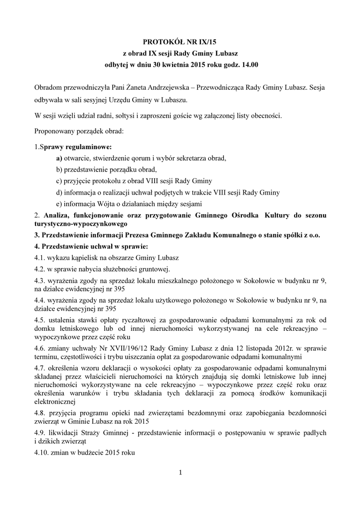 PROTOKÓŁ NR IX/15 z obrad IX sesji Rady Gminy Lubasz odbytej w dniu 30 kwietnia 2015 roku godz. 14.00 Obradom przewodniczyła Pani Żaneta Andrzejewska – Przewodnicząca Rady Gminy Lubasz. Sesja odbywała w sali sesyjnej Urzędu Gminy w Lubaszu. W sesji wzięli udział radni, sołtysi i zaproszeni goście wg załączonej listy obecności. Proponowany porządek obrad: 1.Sprawy regulaminowe: a) otwarcie, stwierdzenie qorum i wybór sekretarza obrad, b) przedstawienie porządku obrad, c) przyjęcie protokołu z obrad VIII sesji Rady Gminy d) informacja o realizacji uchwał podjętych w trakcie VIII sesji Rady Gminy e) informacja Wójta o działaniach między sesjami 2. Analiza, funkcjonowanie oraz przygotowanie Gminnego Ośrodka Kultury do sezonu turystyczno-wypoczynkowego 3. Przedstawienie informacji Prezesa Gminnego Zakładu Komunalnego o stanie spółki z o.o. 4. Przedstawienie uchwał w sprawie: 4.1. wykazu kąpielisk na obszarze Gminy Lubasz 4.2. w sprawie nabycia służebności gruntowej. 4.3. wyrażenia zgody na sprzedaż lokalu mieszkalnego położonego w Sokołowie w budynku nr 9, na działce ewidencyjnej nr 395 4.4. wyrażenia zgody na sprzedaż lokalu użytkowego położonego w Sokołowie w budynku nr 9, na działce ewidencyjnej nr 395 4.5. ustalenia stawki opłaty ryczałtowej za gospodarowanie odpadami komunalnymi za rok od domku letniskowego lub od innej nieruchomości wykorzystywanej na cele rekreacyjno – wypoczynkowe przez część roku 4.6. zmiany uchwały Nr XVII/196/12 Rady Gminy Lubasz z dnia 12 listopada 2012r. w sprawie terminu, częstotliwości i trybu uiszczania opłat za gospodarowanie odpadami komunalnymi 4.7. określenia wzoru deklaracji o wysokości opłaty za gospodarowanie odpadami komunalnymi składanej przez właścicieli nieruchomości na których znajdują się domki letniskowe lub innej nieruchomości wykorzystywane na cele rekreacyjno – wypoczynkowe przez część roku oraz określenia warunków i trybu składania tych deklaracji za pomocą środków komunikacji elektronicznej 4.8. przyjęcia programu opieki nad zwierzętami bezdomnymi oraz zapobiegania bezdomności zwierząt w Gminie Lubasz na rok 2015 4.9. likwidacji Straży Gminnej - przedstawienie informacji o postępowaniu w sprawie padłych i dzikich zwierząt 4.10. zmian w budżecie 2015 roku 1 5. Interpelacje i zapytania radnych. 6. Odpowiedzi na interpelacje radnych zgłoszone na sesji. 7.Wolne wnioski i informacje. 8.Zakończenie obrad Ad. 1a Przewodnicząca RG na podstawie art. 20 ust. 1 ustawy z dnia 08 marca 1990 roku o samorządzie gminnym otworzyła IX sesję VII kadencji Rady Gminy Lubasz. Stwierdziła, że na podstawie listy obecności na 15 radnych ustawowego składu obecnych jest 13 radnych i Rada jest władna do podejmowania prawomocnych uchwał. (Później dotarł 14 radny) Na Sekretarza obrad zaproponowała kolejnego radnego z listy obecności Pana Mariana Mirka, który wyraził zgodę aby być sekretarzem obrad. W wyniku głosowania, jednogłośnie Sekretarzem obrad został wybrany Pan Marian Mirek. Ad.1b przedstawienie porządku obrad, Przewodnicząca stwierdziła, że porządek obrad został radnym doręczony. Jeżeli radni lub Wójt mają jakiejś uwagi to oczekuje na ich propozycje. Pan Marek Wicher zgłosił wniosek formalny, aby dołożyć po pkt 4 dodatkowy punkt, w którym zostałaby przedstawiona sprawa dotycząca sprzątania po okresie zimowym co było corocznie przedstawiane. Chciałbym wiedzieć jakie ulice były sprzątane i jaka kwota była za to sprzątanie? Informację dotyczącą przetargu na usługę zamiatania ulic oraz koszty wykonania tej usługi po okresie zimowym. Paweł Strawa ustosunkowując się do powyższego powiedział, że jeżeli jest to przygotowane lub możliwe do przygotowania to jak najbardziej. Wójt Gminy – pełne informacje co do sprzątania po okresie zimy, łącznie z przekazaniem informacji dotyczącej wyboru firmy na dzisiaj jesteśmy wstanie powiedzieć ogólnikami. Szczegóły możemy Radzie przekazać na komisji lub wcześniej i później na sesji następnej, o ile Rada sobie życzy. Marek Wicher – ja chcę tylko wykaz ulic i jaka kwota? Te dane w ciągu 5 minut można przygotować. Głosowanie Za -10 Przeciw - 0 Wstrzymujących się - 4 Następnie Przewodnicząca poddała pod głosowanie cały porządek ze zmianą, Za - jednogłośnie (głosowało 14 radnych) 2 Wobec powyższego porządek zmieni się i zostanie dołożony pkt 5, w którym przedstawiona zostanie sprawa dotycząca sprzątania po okresie zimowym. Kolejność następnych zmieni się o 1. Ad 1. c przyjęcie protokołu z obrad VII sesji Rady Gminy Pan Jacek Michalak, sekretarz obrad VIII sesji Rady Gminy, która odbyła się 26 marca 2015 roku stwierdził, że zapoznał się z protokołem z przebiegu sesji. Protokół odzwierciedla przebieg sesji i wnioskuje o jego przyjęcie bez odczytywania. W wyniku głosowania protokół z obrad VIII sesji przyjęto jednogłośnie bez odczytywania. (W głosowaniu udział wzięło 14 obecnych radnych) Ad 1. d informacja o realizacji uchwał podjętych w trakcie VIII sesji Rady Gminy Przewodnicząca Rady Gminy powiedziała, że radni otrzymali informację przed komisjami. Zapytała czy któryś z radnych ma jakieś uwagi. W związku z tym, że uwag nie zgłoszono przeszła do następnego punktu porządku obrad. Ad 1. e informacja o działaniach Wójta Gminy pomiędzy sesjami Wójt Gminy zabierając głos powiedział:” W okresie ponad miesiąca od ostatniej sesji Rady Gminy zajmowałem się następującymi zagadnieniami : 1. Z dniem 20 kwietnia 2015r. zarządzeniem Nr 37.2015 odwołałem ze stanowiska Dyrektora Gminnego Ośrodka Kultury w Lubaszu Pana Andrzeja Kopaczewskiego. Odwołanie jest równoznaczne z wypowiedzeniem umowy o pracę bez wypowiedzenia, gdyż Pan Dyrektor od 07 lipca 2014r. był nieobecny w pracy. Najpierw przebywał na zwolnieniu lekarskim trwającym 180 dni, a następnie otrzymał świadczenie rehabilitacyjn