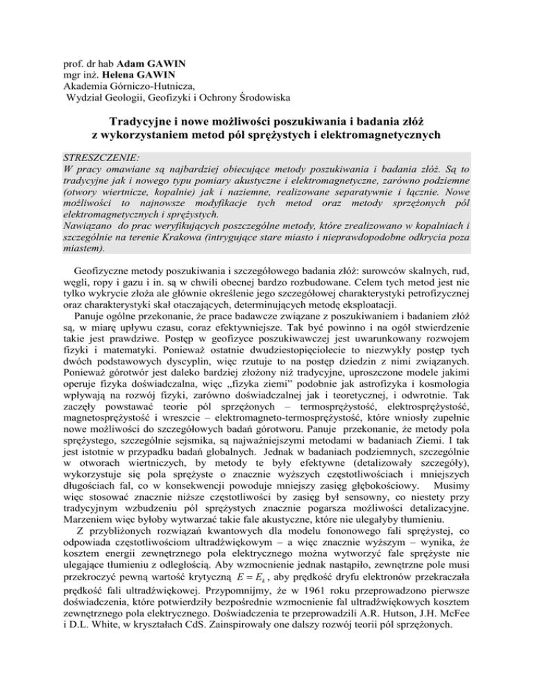 prof. dr hab Adam GAWIN mgr inż. Helena GAWIN Akademia Górniczo-Hutnicza, Wydział Geologii, Geofizyki i Ochrony Środowiska Tradycyjne i nowe możliwości poszukiwania i badania złóż z wykorzystaniem metod pól sprężystych i elektromagnetycznych STRESZCZENIE: W pracy omawiane są najbardziej obiecujące metody poszukiwania i badania złóż. Są to tradycyjne jak i nowego typu pomiary akustyczne i elektromagnetyczne, zarówno podziemne (otwory wiertnicze, kopalnie) jak i naziemne, realizowane separatywnie i łącznie. Nowe możliwości to najnowsze modyfikacje tych metod oraz metody sprzężonych pól elektromagnetycznych i sprężystych. Nawiązano do prac weryfikujących poszczególne metody, które zrealizowano w kopalniach i szczególnie na terenie Krakowa (intrygujące stare miasto i nieprawdopodobne odkrycia poza miastem). Geofizyczne metody poszukiwania i szczegółowego badania złóż: surowców skalnych, rud, węgli, ropy i gazu i in. są w chwili obecnej bardzo rozbudowane. Celem tych metod jest nie tylko wykrycie złoża ale głównie określenie jego szczegółowej charakterystyki petrofizycznej oraz charakterystyki skał otaczających, determinujących metodę eksploatacji. Panuje ogólne przekonanie, że prace badawcze związane z poszukiwaniem i badaniem złóż są, w miarę upływu czasu, coraz efektywniejsze. Tak być powinno i na ogół stwierdzenie takie jest prawdziwe. Postęp w geofizyce poszukiwawczej jest uwarunkowany rozwojem fizyki i matematyki. Ponieważ ostatnie dwudziestopięciolecie to niezwykły postęp tych dwóch podstawowych dyscyplin, więc rzutuje to na postęp dziedzin z nimi związanych. Ponieważ górotwór jest daleko bardziej złożony niż tradycyjne, uproszczone modele jakimi operuje fizyka doświadczalna, więc „fizyka ziemi” podobnie jak astrofizyka i kosmologia wpływają na rozwój fizyki, zarówno doświadczalnej jak i teoretycznej, i odwrotnie. Tak zaczęły powstawać teorie pól sprzężonych – termosprężystość, elektrosprężystość, magnetosprężystość i wreszcie – elektromagneto-termosprężystość, które wniosły zupełnie nowe możliwości do szczegółowych badań górotworu. Panuje przekonanie, że metody pola sprężystego, szczególnie sejsmika, są najważniejszymi metodami w badaniach Ziemi. I tak jest istotnie w przypadku badań globalnych. Jednak w badaniach podziemnych, szczególnie w otworach wiertniczych, by metody te były efektywne (detalizowały szczegóły), wykorzystuje się pola sprężyste o znacznie wyższych częstotliwościach i mniejszych długościach fal, co w konsekwencji powoduje mniejszy zasięg głębokościowy. Musimy więc stosować znacznie niższe częstotliwości by zasięg był sensowny, co niestety przy tradycyjnym wzbudzeniu pól sprężystych znacznie pogarsza możliwości detalizacyjne. Marzeniem więc byłoby wytwarzać takie fale akustyczne, które nie ulegałyby tłumieniu. Z przybliżonych rozwiązań kwantowych dla modelu fononowego fali sprężystej, co odpowiada częstotliwościom ultradźwiękowym – a więc znacznie wyższym – wynika, że kosztem energii zewnętrznego pola elektrycznego można wytworzyć fale sprężyste nie ulegające tłumieniu z odległością. Aby wzmocnienie jednak nastąpiło, zewnętrzne pole musi przekroczyć pewną wartość krytyczną E = Ek , aby prędkość dryfu elektronów przekraczała prędkość fali ultradźwiękowej. Przypomnijmy, że w 1961 roku przeprowadzono pierwsze doświadczenia, które potwierdziły bezpośrednie wzmocnienie fal ultradźwiękowych kosztem zewnętrznego pola elektrycznego. Doświadczenia te przeprowadzili A.R. Hutson, J.H. McFee i D.L. White, w kryształach CdS. Zainspirowały one dalszy rozwój teorii pól sprzężonych. Intensywne prace z zakresu aplikacji w badaniach górotworu – głównie metod elektrycznych, magnetycznych i sprężystych – były prowadzone przez Międzyresortowy Instytut Geofizyki już w latach sześćdziesiątych. Znakomitym terenem prac doświadczalnych były tzw. „trudne” kopalnie, wśród nich szczególnie kopalnia Orzeł Biały. Duża niejednorodność ośrodka i anizotropia bardzo utrudniały interpretację ilościową (stąd termin „trudne” kopalnie). W drugiej połowie lat sześćdziesiątych Współautor tej pracy zaproponował kilka nowego typu, elektromagnetycznych, kwazistacjonarnych układów pomiarowych, których zaletą były – znacznie większe od układów tradycyjnych – możliwości detalizacyjne. Wynikało to z rozważań teoretycznych i zostało potwierdzone w badaniach w otworach wiertniczych. Pierwsze pomiary w kopalni Orzeł Biały zostały zrealizowane w ostatnich dniach 1969 roku. Niestety nie prędko dało się powtórnie znaleźć taką okazję, ponieważ niespodziewanie najciekawszym miejscem dla tego typu badań okazało się nasze miasto. Już w 1970 roku autorzy zaczęli wykonywać tego typu pomiary w Krakowie. Nasze miasto okazało się wyjątkowo interesujące. Jeszcze w ubiegłym stuleciu panowało przekonanie, że pewne okolice Krakowa są niezdrowe. O ile można było zrozumieć dlaczego np. wyłożona kostką porfirową ul. Szewska, prowadząca bezpośrednio do Rynku, „jest niezdrowa” (w rzeczywistości – podwyższona radioaktywność), to trudno było stwierdzić dlaczego przepiękna dolina na południe od Bielan, była jeszcze w latach pięćdziesiątych prawie pusta. Z czasem w okolicach Piekar, gdzie od tysiąca lat poza chlebem niczego nie pieczono, odkryto stare piecowiska. Gdy określono ich wiek radiometryczny (80 tys. lat), autorzy przeżyli prawdziwy szok. Ponieważ piecowiska podobnego typu i wieku zostały na szczęście znalezione również w Południowej Afryce, m.in. również w miejscach złóż radioaktywnych, więc z czasem się z tym pogodzono, szczególnie po wizycie premiera Indii Nehru i jego oświadczeniu dla prasy dlaczego chciał być na Wawelu. Znalezienie nowej Smoczej Jamy, która okazała si