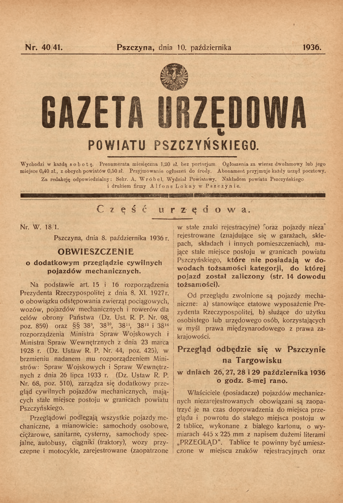 Nr. 40/41. Pszczyna, dnia 10. października GAZET 1936. ZEDOWA POWIATU PSZCZYŃSKIEGO. Wychodzi w każdą sobotę. Prenumerata miesięczna 1,20 zł. bez portorjum. Ogłoszenia za wiersz dwułamowy lub jego miejsce 0,40 zł., z obcych powiatów 0,50 zł. Przyjmowanie ogłoszeń do środy. Abonament przyjmuje każdy urząd pocztowy. Za redakcję odpowiedzialny: Sekr. A. Wróbel, Wydział Powiatowy. Nakładem powiatu Pszczyńskiego i drukiem firmy Alfons Lokay w Pszczynie. Część urzędowa. Nr. W. 18/1. Pszczyna, dnia 8. października 1936 r. : | | OBWIESZCZENIE i o dodatkowym przeglądzie cywilnych pojazdów mechanicznych. Na podstawie art. 15 i 16 rozporządzenia Prezydenta Rzeczypospolitej z dnia 8. XI. 1927r. o obowiązku odstępowania zwierząt pociągowych, wozów, pojazdów mechanicznych i rowerów dla celów obrony Państwa (Dz. Ust. R. P. Nr. 98, poz. 859) oraz §§ 38= 38", 38", 38" i 38" rozporządzenia Ministra Spraw Wojskowych i Ministra Spraw Wewnętrznych z dnia 23 marca 1928 r. (Dz. Ustaw R. P. Nr. 44, poz. 425), w brzmieniu nadanem mu rozporządzeniem Mini strów: Spraw Wojskowych i Spraw Wewnętrz nych z dnia 26 lipca 1933 r. (Dz. Ustaw R. P. Nr. 68, poz. 510), zarządza się dodatkowy prze gląd cywilnych pojazdów mechanicznych, mają cych stałe miejsce postoju w granicach powiatu Pszczyńskiego. Przeglądowi podlegają wszystkie pojazdy me chaniczne, a mianowicie: samochody osobowe, ciężarowe, sanitarne, cysterny, samochody spec jalne, autobusy, ciągniki (traktory), wozy przy czepne i motocykle, zarejestrowane (zaopatrzone ; | i ! j w stałe znaki rejestracyjne) “oraz pojazdy nieza rejestrowane (znajdujące się w garażach, sklepach, składach i innych pomieszczeniach), mające stałe miejsce postoju w granicach powiatu Pszczyńskiego, które nie posiadają w do wodach tożsamości kategorji, do której pojazd został zaliczony (str. 14 dowodu tożsamości). Od przeglądu zwolnione są pojazdy mechaniczne: a) stanowiące etatowe wyposażenie Prezydenta Rzeczypospolitej, b) służące do użytku osobistego lub urzędowego osób, korzystających w myśl prawa międzynarodowego z prawa zakrajowości. Przegląd odbędzie się w Pszczynie na Targowisku w dniach 26, 27, 28 i 29 października 1936 o godz. 8-mej rano. Właściciele (posiadacze) pojazdów mechanicz nych niezarejestrowanych obowiązani są zaopa trzyć je na czas doprowadzenia do miejsca prze glądu i powrotu do stałego miejsca postoju w 2 tablice, wykonane z białego kartonu, o wy miarach 445 x 225 mm z napisem dużemi literami „PRZEGLĄD“. Tablice te powinny być umiesz czone w miejscu znaków rejestracyjnych oraz 156 Gazeta Urzędowa Powiatu Pszczyńskiego oznaczone pieczęcią posterunku policji, albo zarzą du Gminy. Właściciele (posiadacze) pojazdów mechanicz nych obowiązani są mieć podczas przeglądu: dowód tożsamości pojazdu mechanicznego, do wód rejestracyjny, ewentualnie w razie posiadania, fabryczny opis pojazdu mechanicznego. W razie niemożności doprowadzenia do prze glądu pojazdu mechanicznego z powodu złego stanu technicznego, właściciel (posiadacz) po winien niezwłocznie powiadomić o tern pisemnie powiatową władzę administracji ogólnej, podając powód; odpowiednie oświadczenie może być w wyjątkowych wypadkach złożone na ręce orga nu wojskowego przeprowadzającego przegląd. Winni uchylenia się od przeglądu będą karani grzywną do wysokości wartości odnośnego pojazdu mechanicznego, lub aresztem do 6-ciu miesięcy; w wypadkach szczególnie ciężkich uchybień, mogą być zastosowane obie kary łącznie. Kierownik powiatowej władzy administracji ogólnej Starosta: w/z. (—) Dr. Riess. Nr. W. 9. Wcielenie poborowych do odbycia czynnej służby woj skowej — doręczenie kart powołania. — Nr. 40/41 (Przedruk z Gaz. Urzęd. Woj. Śląskiego z dnia 15 czerwca 1936. Nr. 18, poz. 1.) OBWIESZCZENIE MINISTRA OPIEKI SPOŁECZNEJ z dnia 30 maja 1936 r. w sprawie podania o nadanie umowie zbiorowej z dnia 20 marca 1936 r. mocy powszechnie obowiązującej dla wszystkich gospodarstw rolnych w górnośląskiej części Województwa Śląskiego. Związek Pracodawców Rolnych i Leśnych dla Województwa Śląskiego i Związek Ziemian Województwa Śląskiego oraz Związek Robotni ków Rolnych i Leśnych Zjednoczenia Zawodo wego Polskiego i Związek Zawodowy Robotni ków Rolnych Rzeczypospolitej Polskiej w myśl §2 rozporządzenia z dnia 23 grudnia 1918 r. (Dz. Ust. Rzeszy Niem. str. 1456) wniosły do Minister stwa Opieki Społecznej podanie o nadanie mocy powszechnie obowiązującej dla wszystkich gospo darstw rolnych na obszarze górnośląskiej części Województwa Śląskiego umowie zbiorowej, za wartej w Katowicach w dniu 20 marca 1936 r. po między wyżej wymienionemu organizacjami pra codawców i robotników. Tekst umowy podany jest poniżej. Sprzeciwy w sprawie nadania umowie mocy powszechnie obowiązującej można wnosić do Mi nisterstwa Opieki Spolocznej w ciągu 14 dni od ogłoszenia niniejszego obwieszczenia. Minister Opieki Społecznej (—) A4. Kościałkowski. Pszczyna, dnia 9 października 1936 r. Powiatowe Komendy Uzupełnień będą prze syłały Zarządom Gmin do dnia 10 października br. karty powołania, celem doręczenia powołanym do odbycia czynnej służby wojskowej. — Nades łane karty powołania winne być doręczone przez Zarządy Gmin do dnia 17 października br. — Karty nie doręczone, oraz potwierdzenia odbioru kart doręczonych, należy przedkładać odnośnym P. K. U. w terminie jak najkrótszym z odpowied niemu adnotacjami odnośnie do kart niedouczo nych. — Starosta: w z. (—) Dr. Riess. UMOWA TARYFOWA dla robotników rolnych Województwa Śląskiego na rok 1936/37. 1. Ogólne postanowienia. § 1. Strony ustanawiające taryfę. Taryfę niniejszą ustanawiają niżej podpisani: z jednej strony Związek Pracodawców Rolnych i Leśnych Województwa Śląskiego i Związek Zie mian Województwa Śląskiego a z drugiej strony