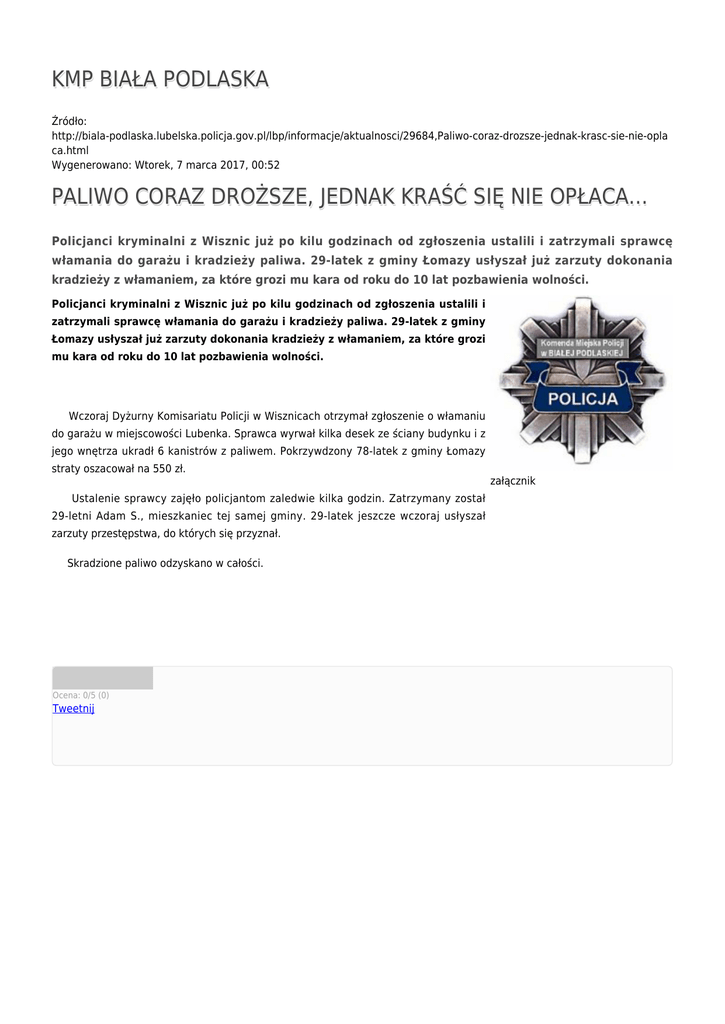KMP BIAŁA PODLASKA Źródło: http://biala-podlaska.lubelska.policja.gov.pl/lbp/informacje/aktualnosci/29684,Paliwo-coraz-drozsze-jednak-krasc-sie-nie-opla ca.html Wygenerowano: Wtorek, 7 marca 2017, 00:52 PALIWO CORAZ DROŻSZE, JEDNAK KRAŚĆ SIĘ NIE OPŁACA... Policjanci kryminalni z Wisznic już po kilu godzinach od zgłoszenia ustalili i zatrzymali sprawcę włamania do garażu i kradzieży paliwa. 29-latek z gminy Łomazy usłyszał już zarzuty dokonania kradzieży z włamaniem, za które grozi mu kara od roku do 10 lat pozbawienia wolności. Policjanci kryminalni z Wisznic już po kilu godzinach od zgłoszenia ustalili i zatrzymali sprawcę włamania do garażu i kradzieży paliwa. 29-latek z gminy Łomazy usłyszał już zarzuty dokonania kradzieży z włamaniem, za które grozi mu kara od roku do 10 lat pozbawienia wolności. Wczoraj Dyżurny Komisariatu Policji w Wisznicach otrzymał zgłoszenie o włamaniu do garażu w miejscowości Lubenka. Sprawca wyrwał kilka desek ze ściany budynku i z jego wnętrza ukradł 6 kanistrów z paliwem. Pokrzywdzony 78-latek z gminy Łomazy straty oszacował na 550 zł. Ustalenie sprawcy zajęło policjantom zaledwie kilka godzin. Zatrzymany został 29-letni Adam S., mieszkaniec tej samej gminy. 29-latek jeszcze wczoraj usłyszał zarzuty przestępstwa, do których się przyznał. Skradzione paliwo odzyskano w całości. Ocena: 0/5 (0) Tweetnij załącznik